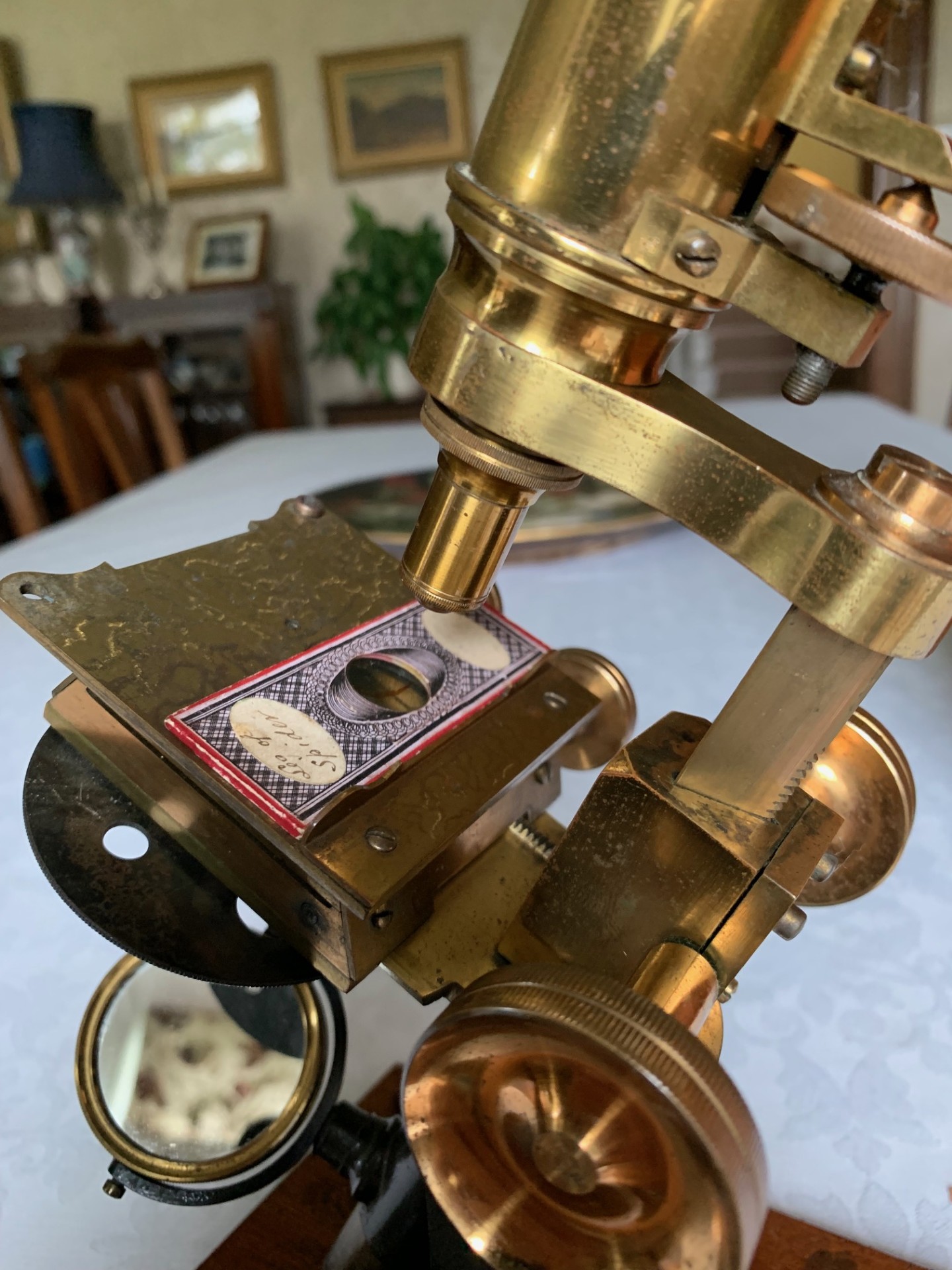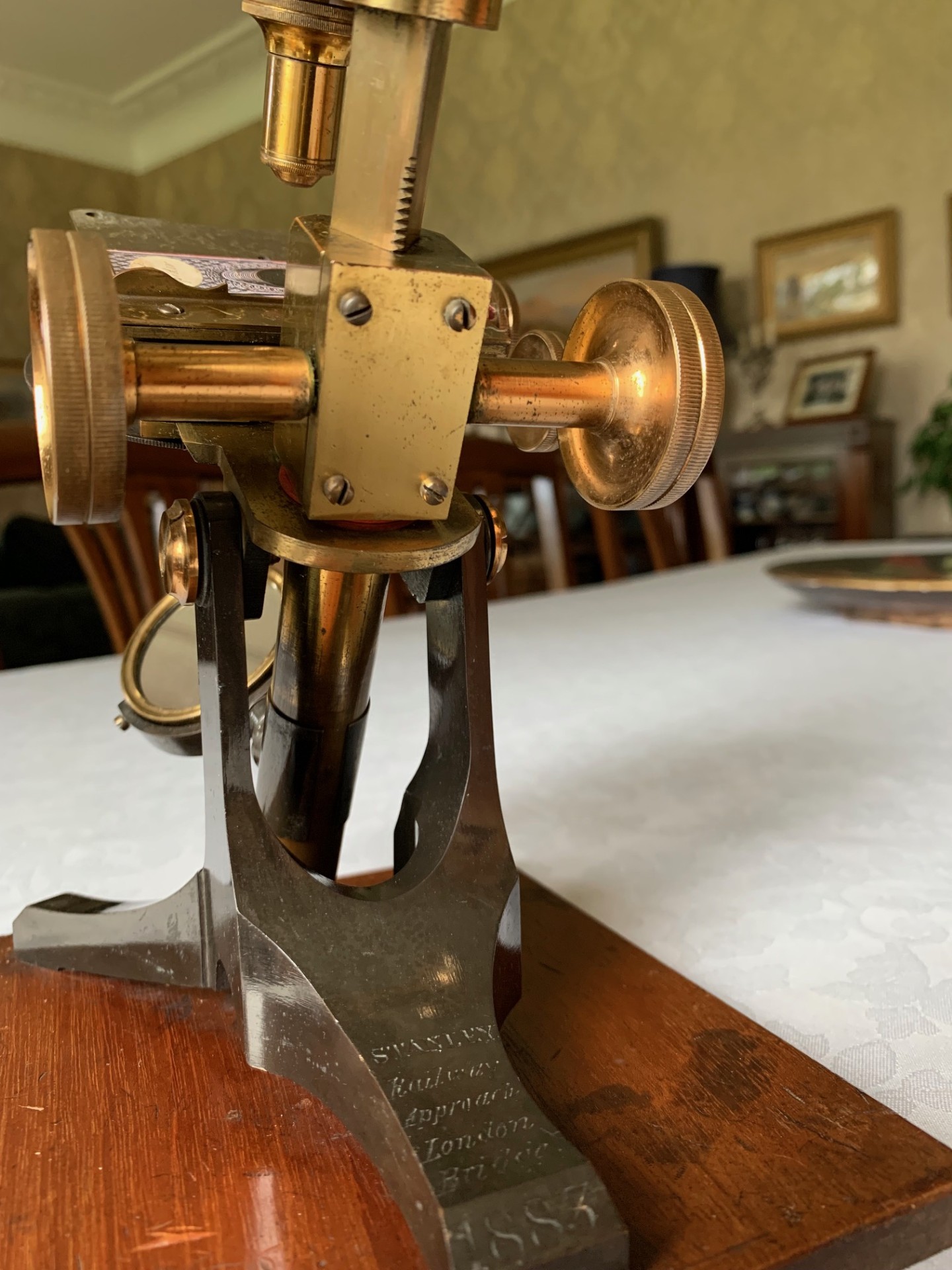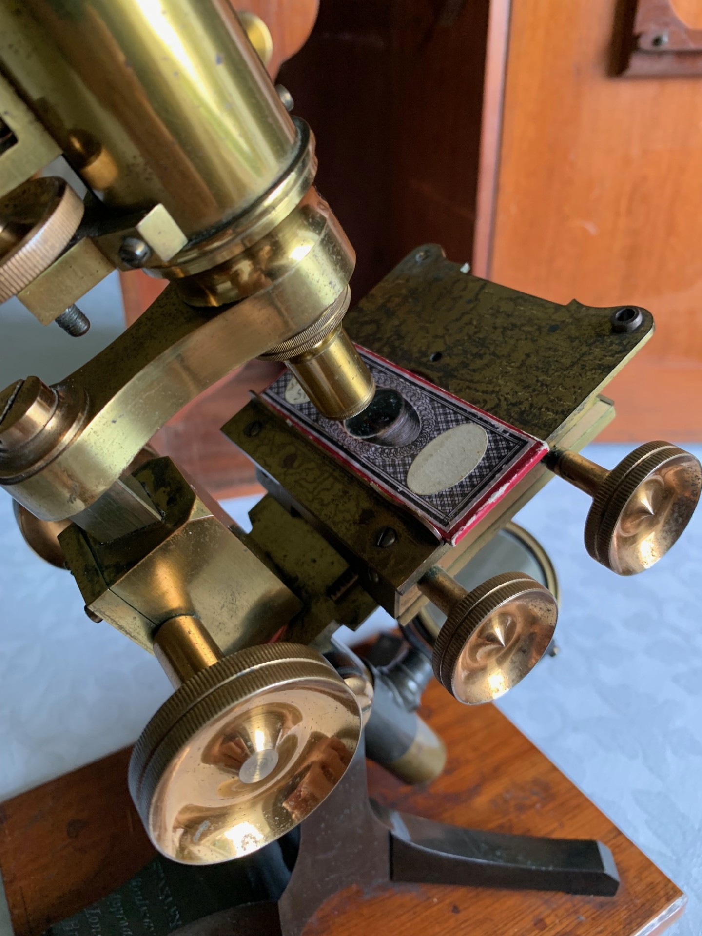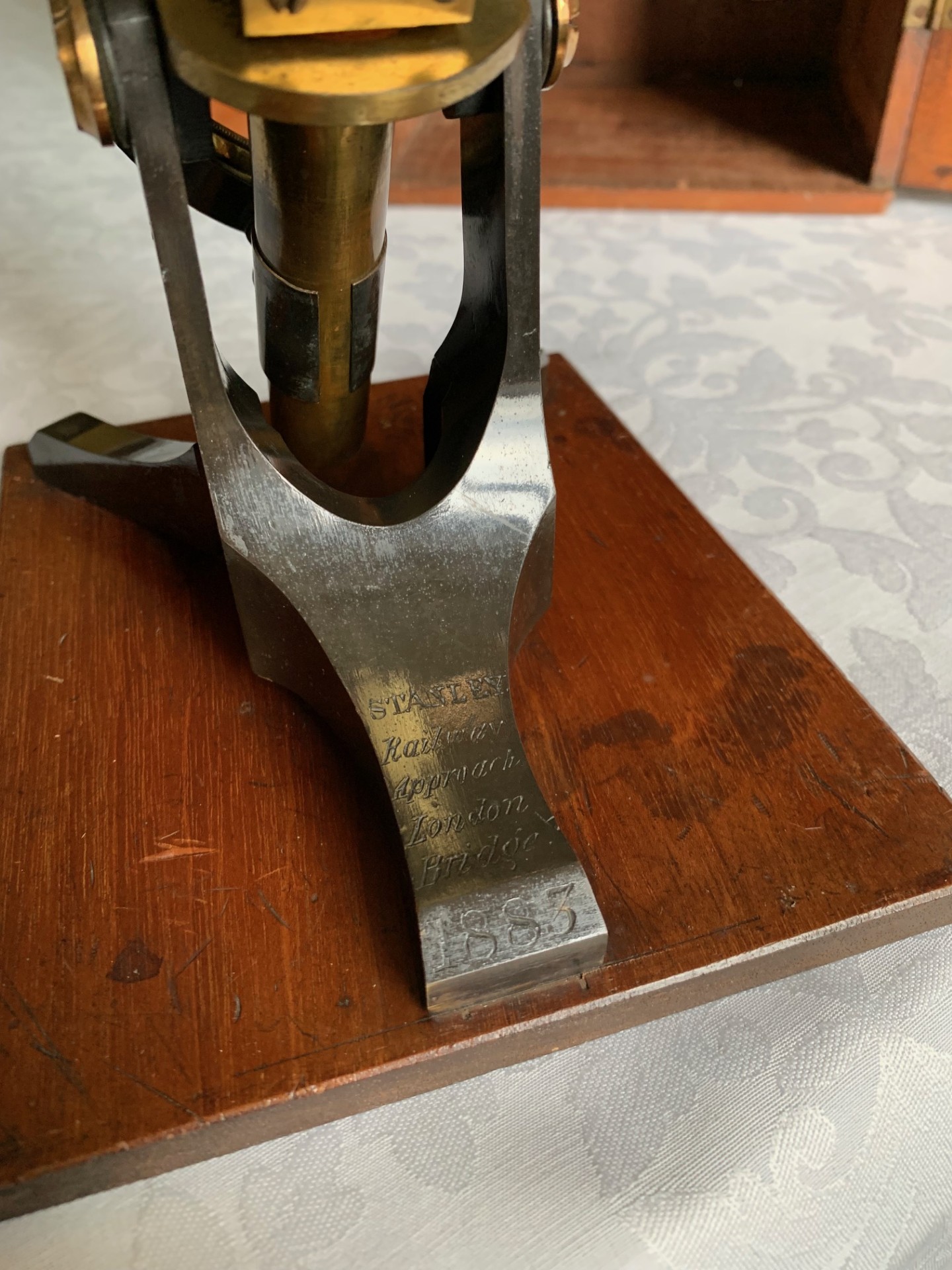 In summary, this is a nice clean example of a compact antique monocular bar-limb design microscope from the Victorian period by Stanley, that’s in very good condition for its age and from an interesting London maker. This example may therefore appeal to collectors as well as specialists seeking a quality compact brass instrument for use and/or display. Being compact it’s also a perfect desk-top accessory, especially when set up with an appropriate antique slide – it’s about 14 inches in height when inclined as shown in listing photos.