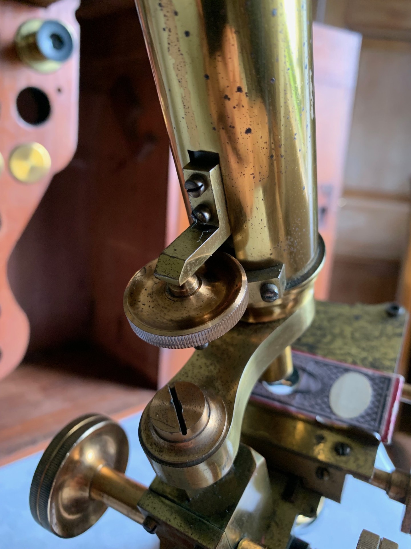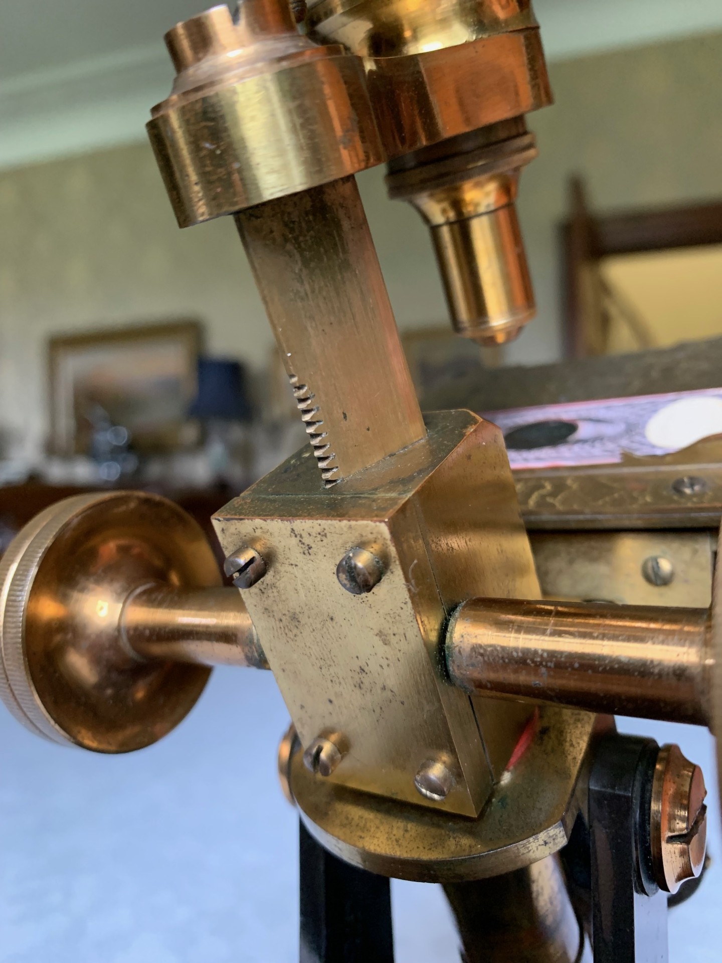 3) The instrument’s main coarse focus is controlled by a set of thumb-wheels with smooth action. The bar-limb design comprises a triangular section coarse focus which has the older style straight cut rack which supports dating to around the 1880 period. Travel and focus are both very good with positive feel and the optical tube holding in position as it should throughout its working range. Fine focus is via a single brass thumb-wheel at the rear of the optical tube acting on the nose-piece only, that also has a smooth action being freshly lubricated.