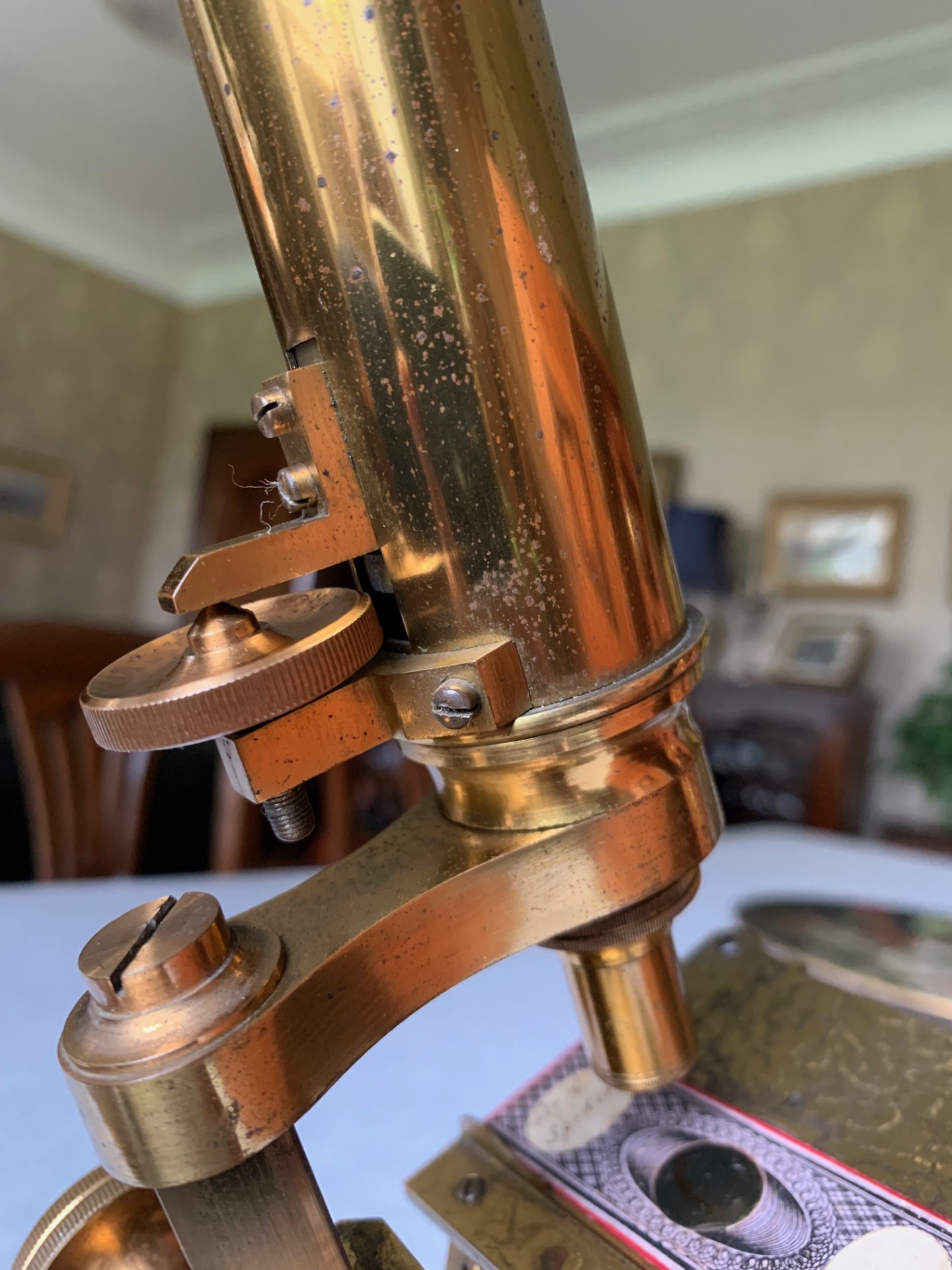 1) Y-shaped foot construction in anodised brass and twin uprights to pivot, with bar-limb form and lacquered brass finishes to the upper parts of the instrument. The microscope is inclinable and holds position on adjustment and can be manually tightened at the pivot point as required.
