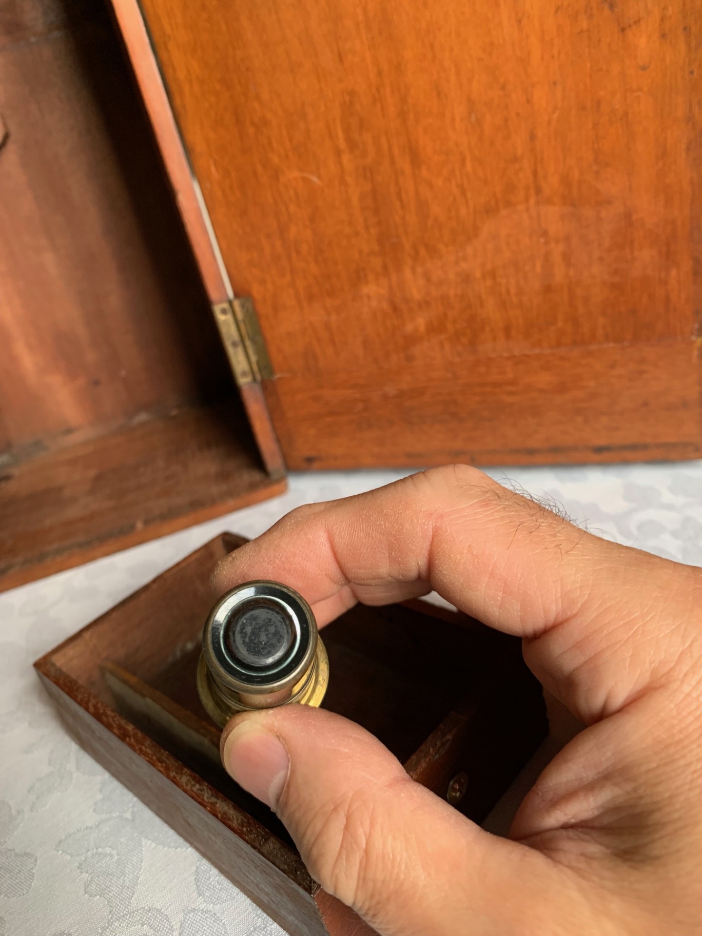 4) There’s a single brass objective lens which is unmarked but will be about 1/4 inch giving 25x magnification.