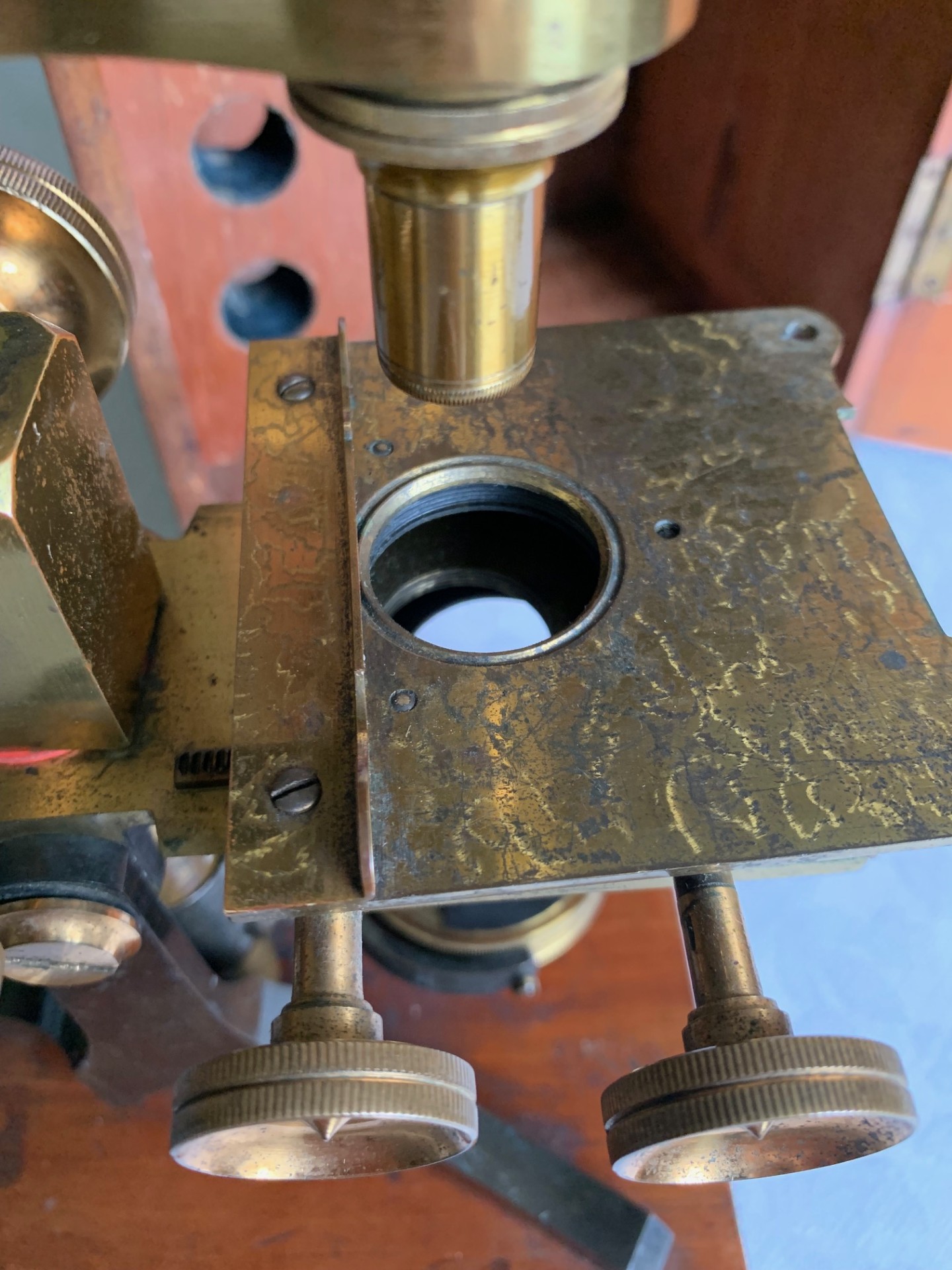 5) The stage is of a square design in brass with some signs of surface patination to the top-plate, which has an etched surface finish and also rotates from side to side but does not complete a full rotation. There’s mechanical adjustment for both x and y-axes, with smooth movement from the straight-cut rack & pinion and screw adjustment mechanisms. It’s currently fitted with a ledge for holding slides which works well and a couple of sockets for stage clips or stage tools.