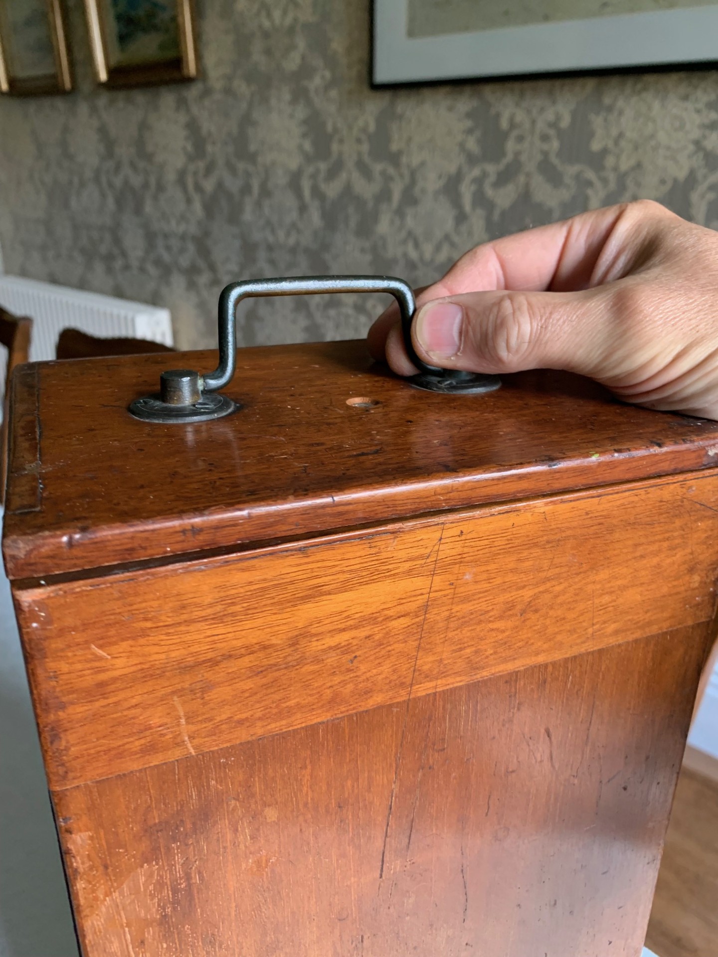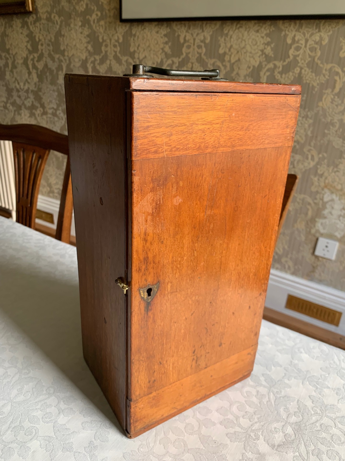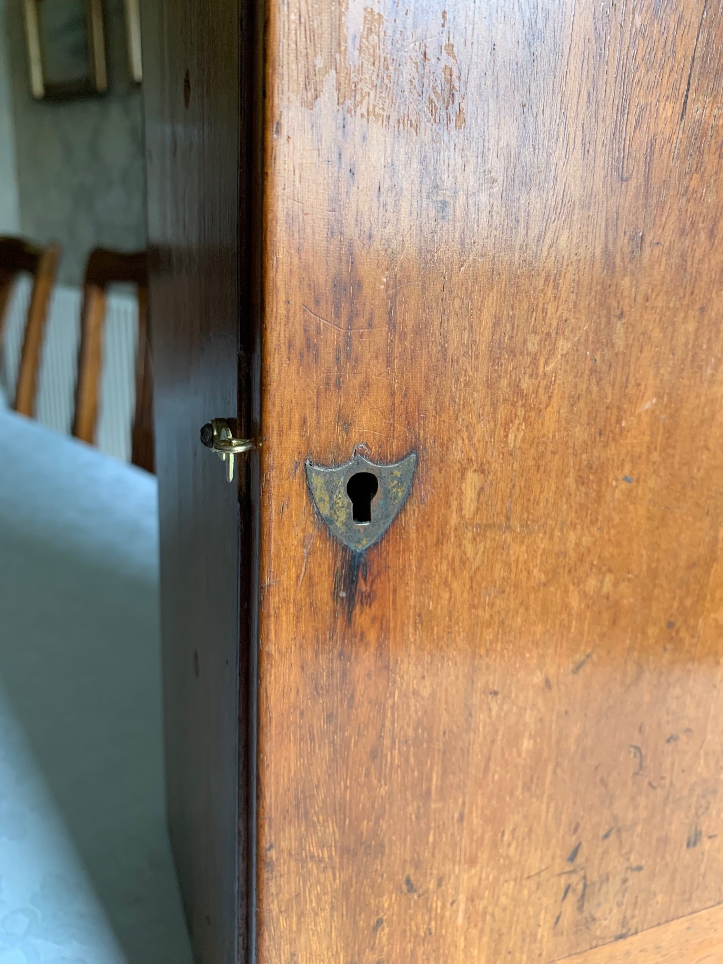 The instrument also has its original wooden case with extensive internal racking. The lock and key are missing, so there’s a cupboard latch fitted to keep the case door closed. The external finish to the case is in reasonably good condition for its age.