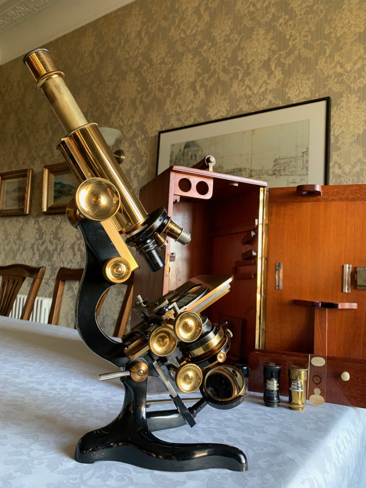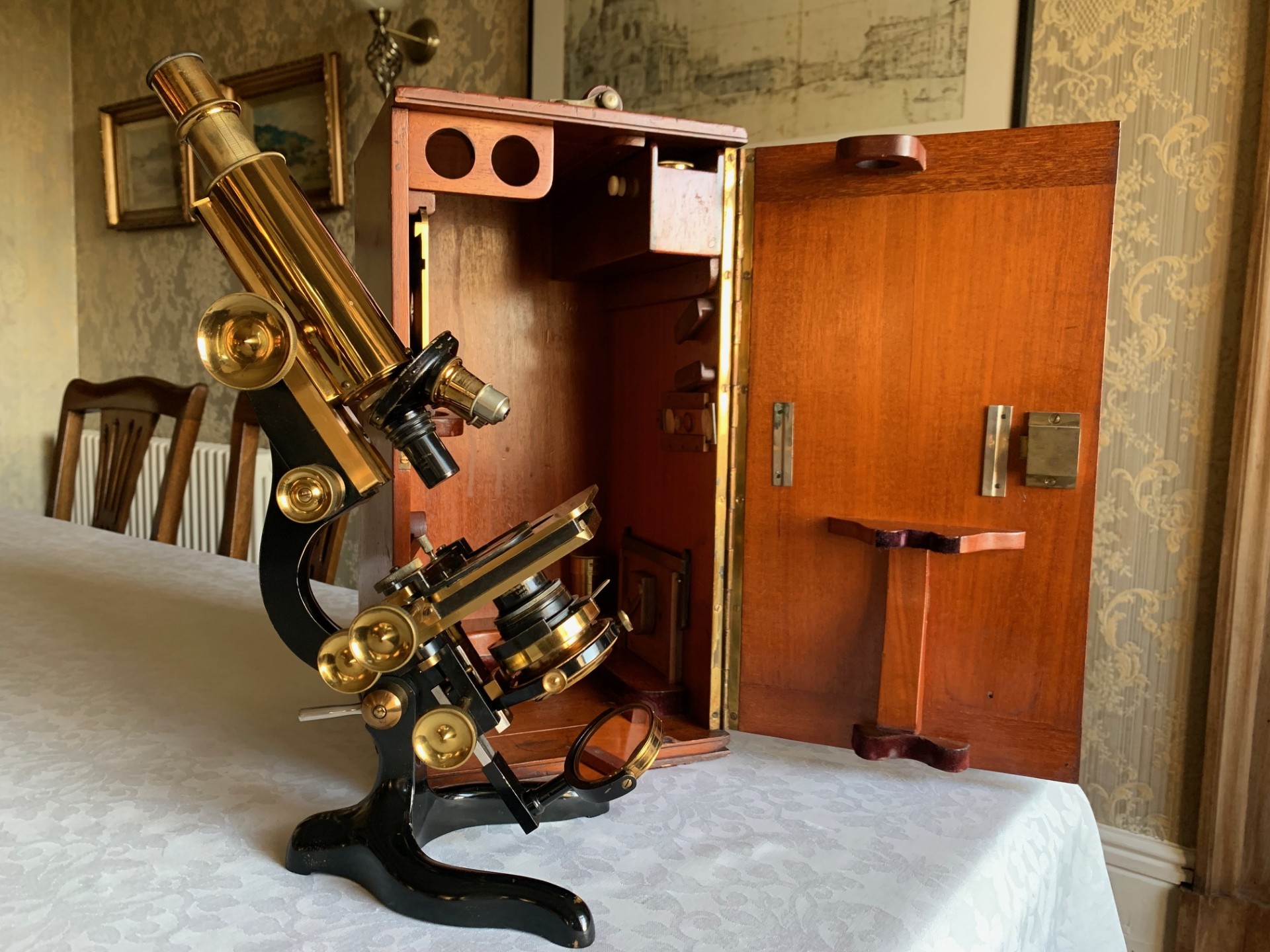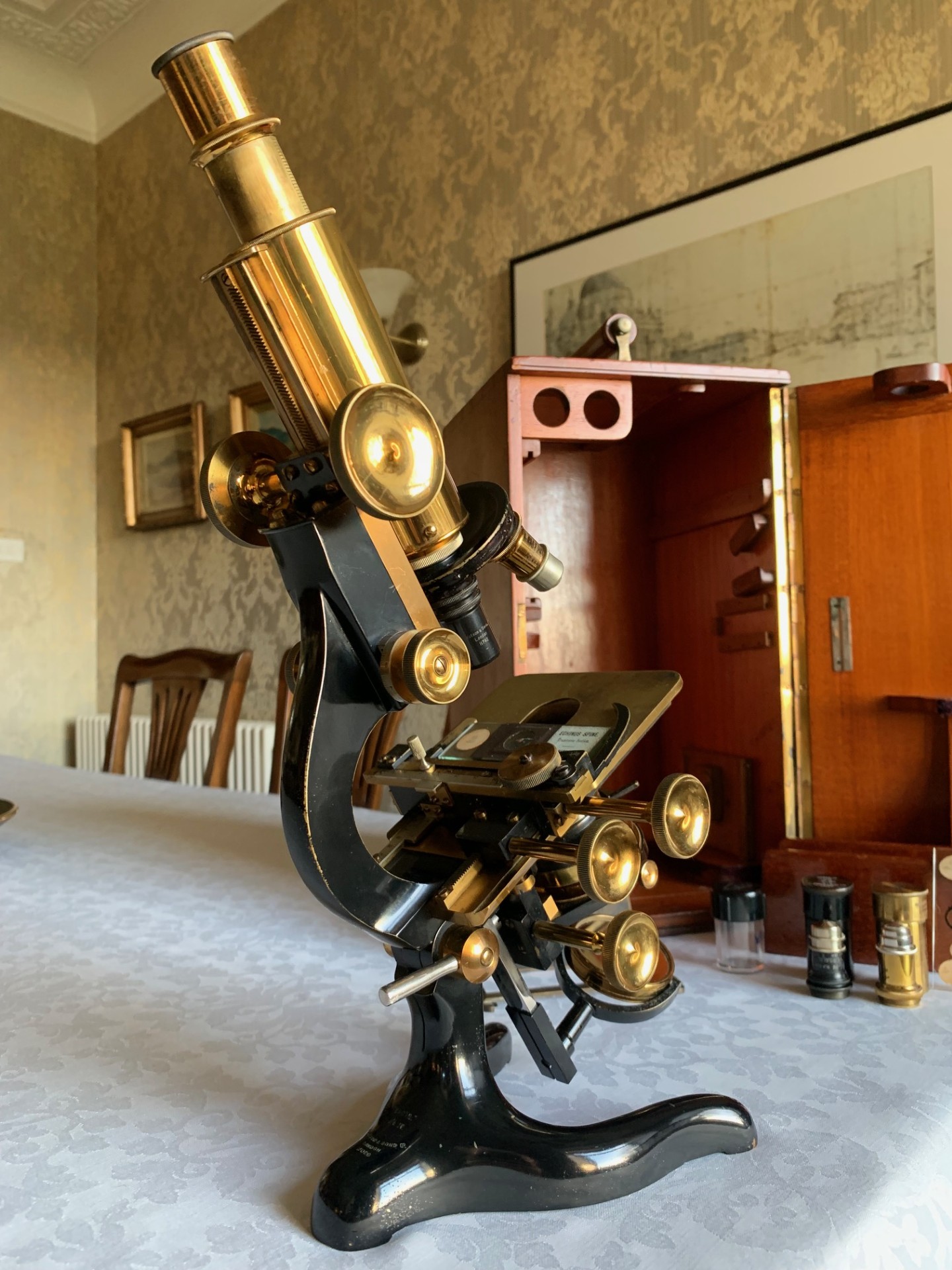 Owing to the weight and delicacy of the microscope and case, it will be partially dismantled, very well wrapped for shipping and dispatched by insured courier upon receipt of cleared funds.