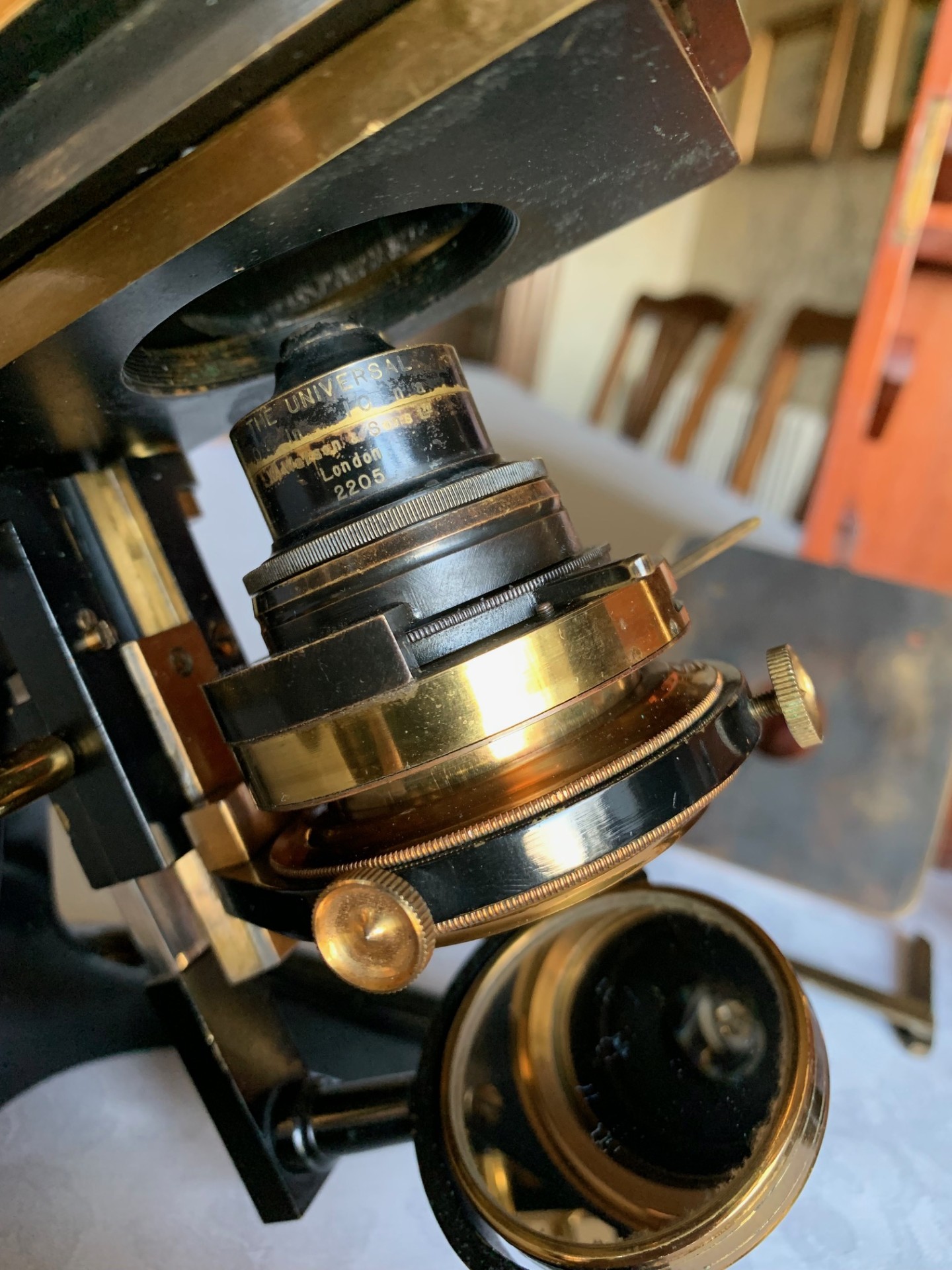 Turning to the sub-stage, we have a specialist model of Watson condenser (Universal) that’s top-mounted to a brass ring-mount, which in turn sits in a height adjustable rack and pinion system with single-sided height control, swing-out feature as demonstrate and there’s also centering via a pair of brass thumb-screws.