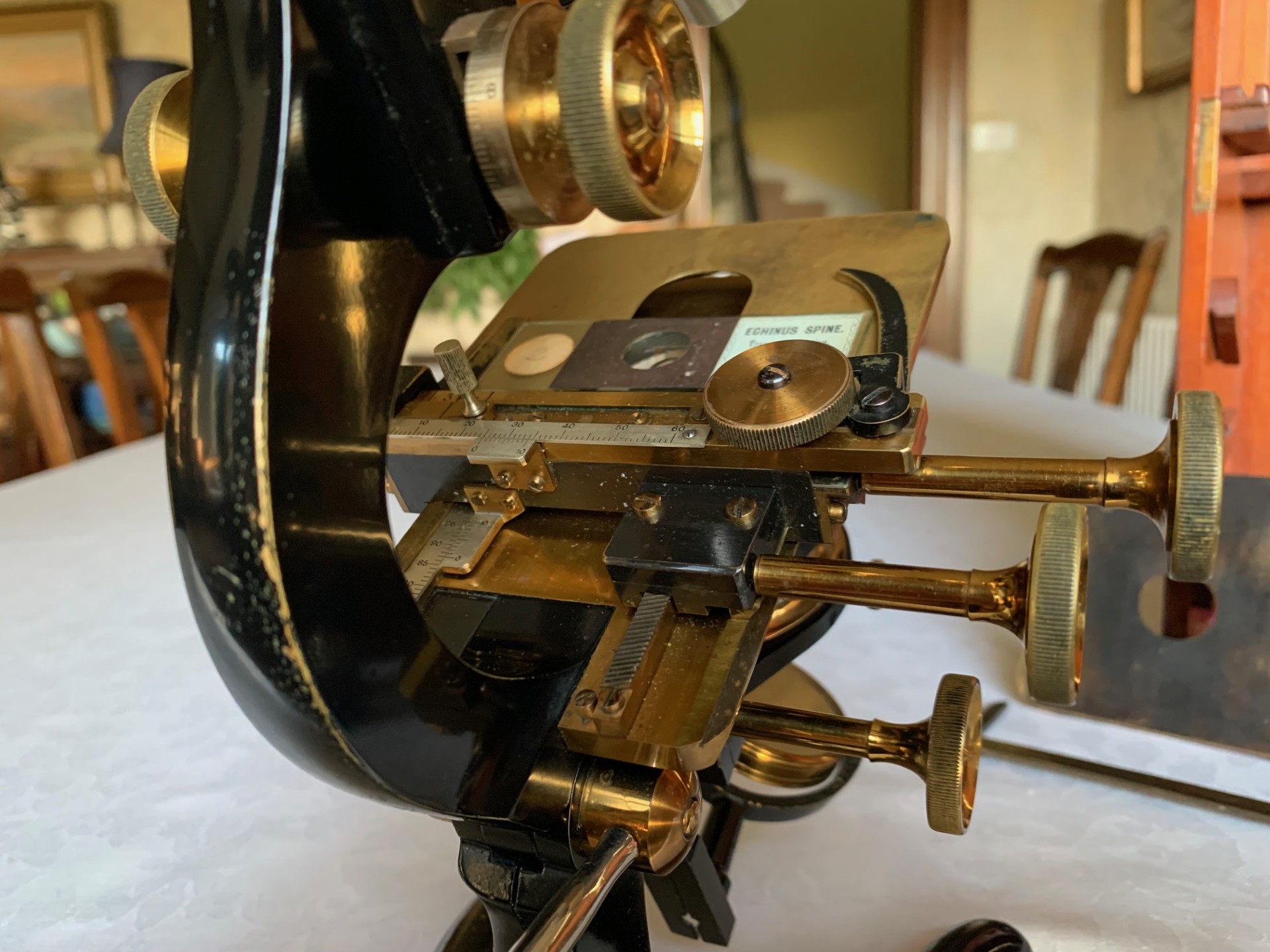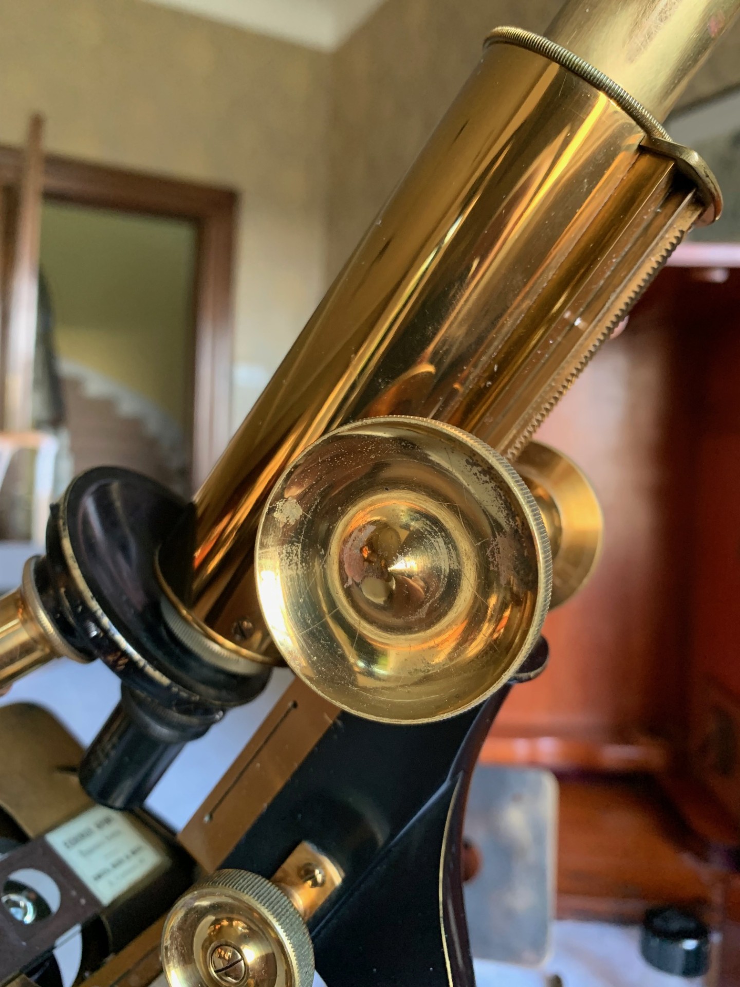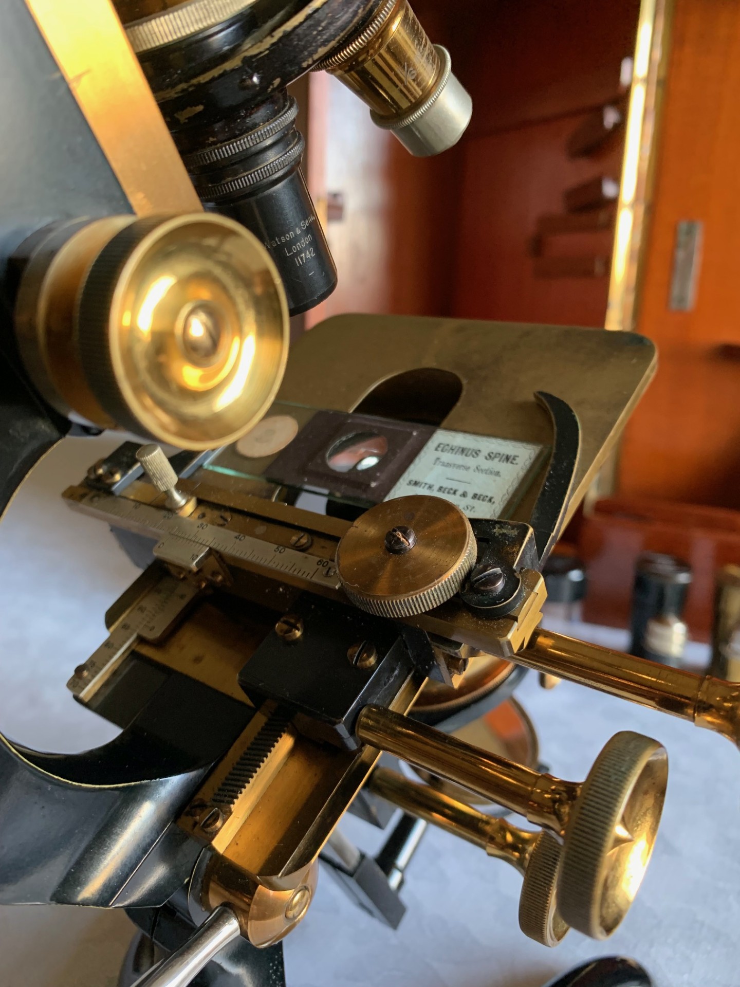 On the technical side, the construction is a heavy iron foot, with twin uprights, pivot with lever-operated tension adjustment and Lister-type upper limb also in iron. Both coarse and fine focus move freely through their working ranges with little wear evident. There’s a good range of coarse focus movement and you’ll see that in the listing photos I was able to use a low-power 2 inch objective with very high working distance.