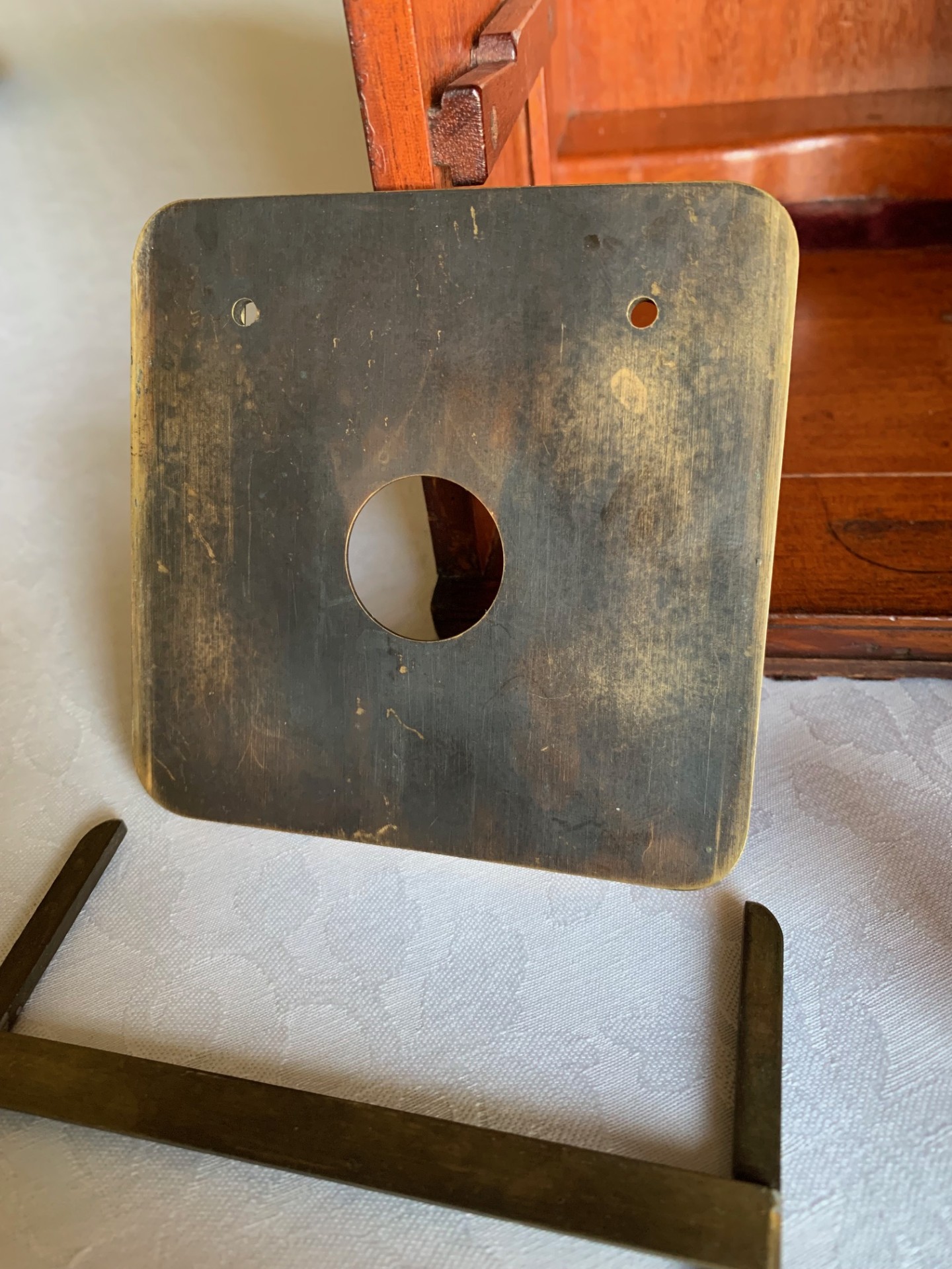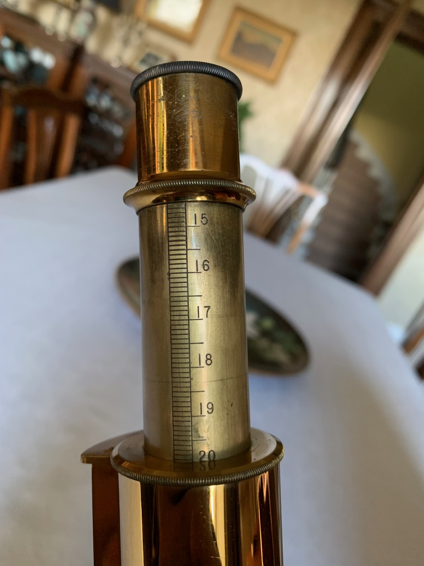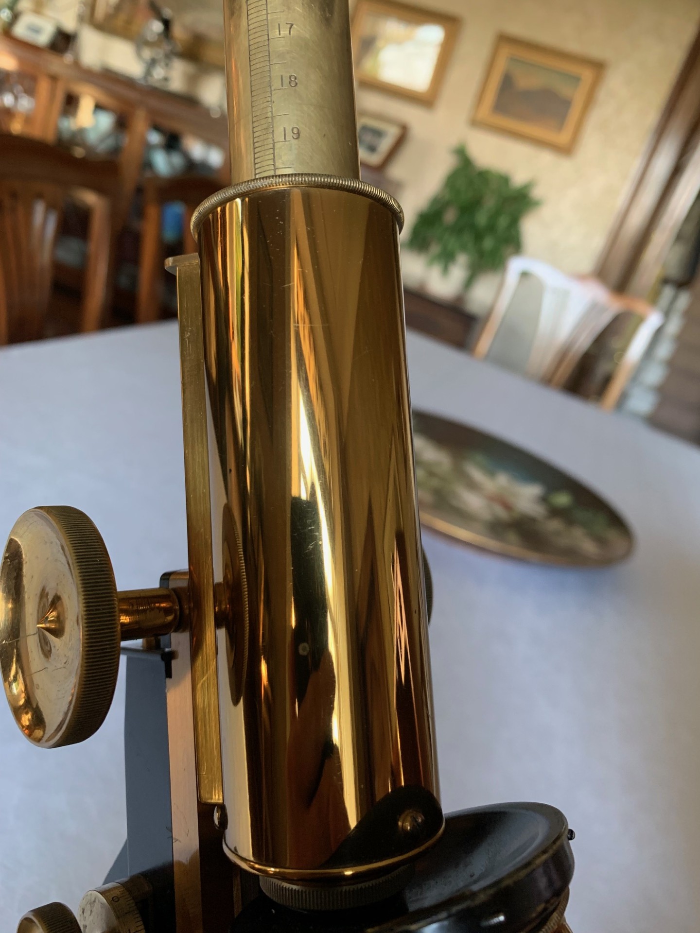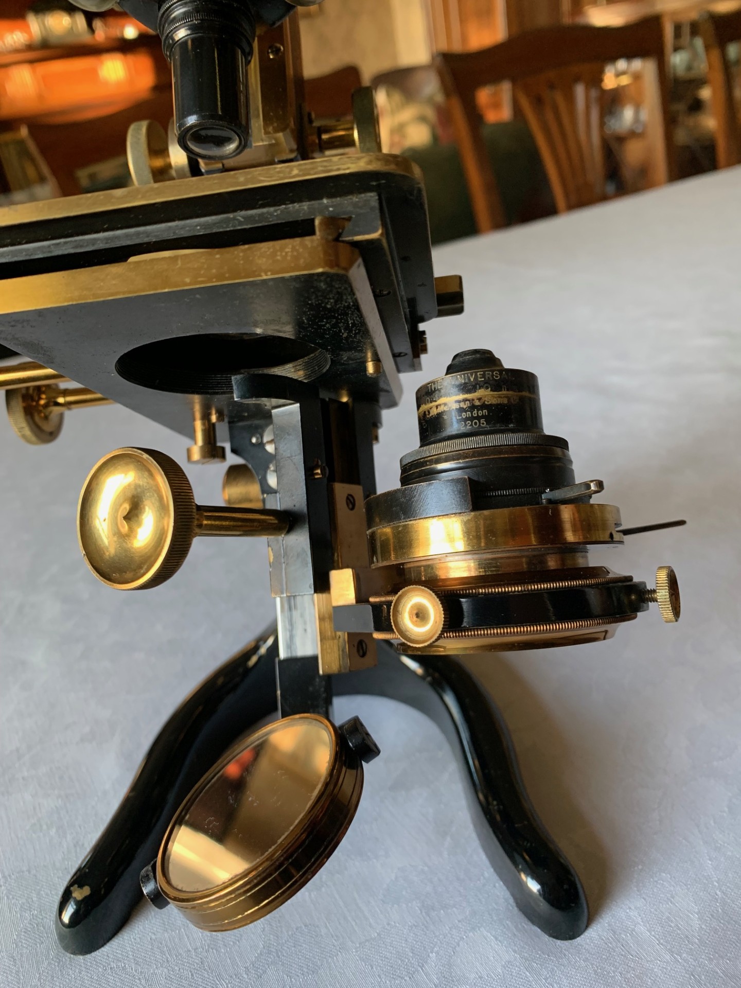 On the technical side, the construction is a heavy iron foot, with twin uprights, pivot with lever-operated tension adjustment and Lister-type upper limb also in iron. Both coarse and fine focus move freely through their working ranges with little wear evident. There’s a good range of coarse focus movement and you’ll see that in the listing photos I was able to use a low-power 2 inch objective with very high working distance.