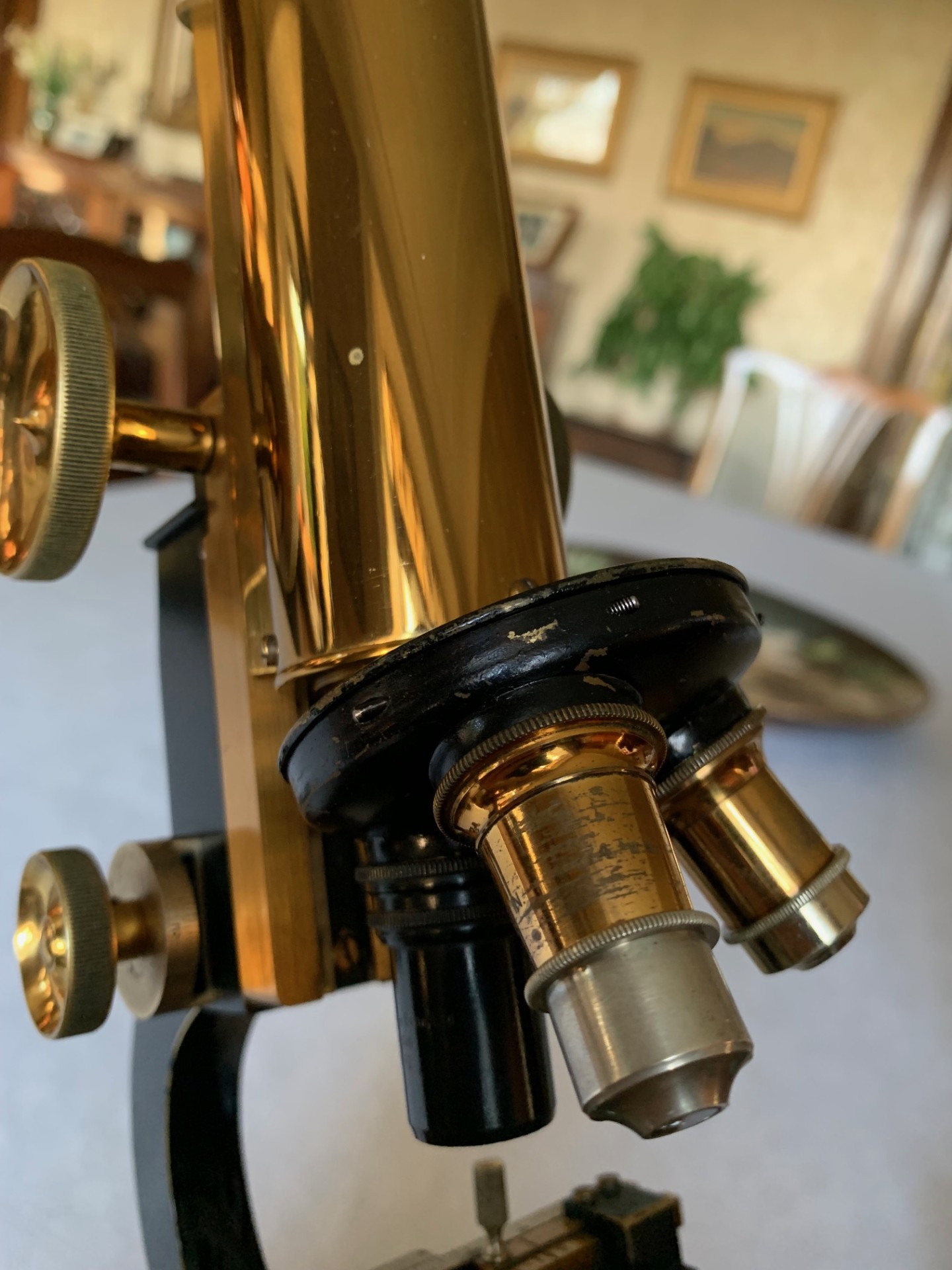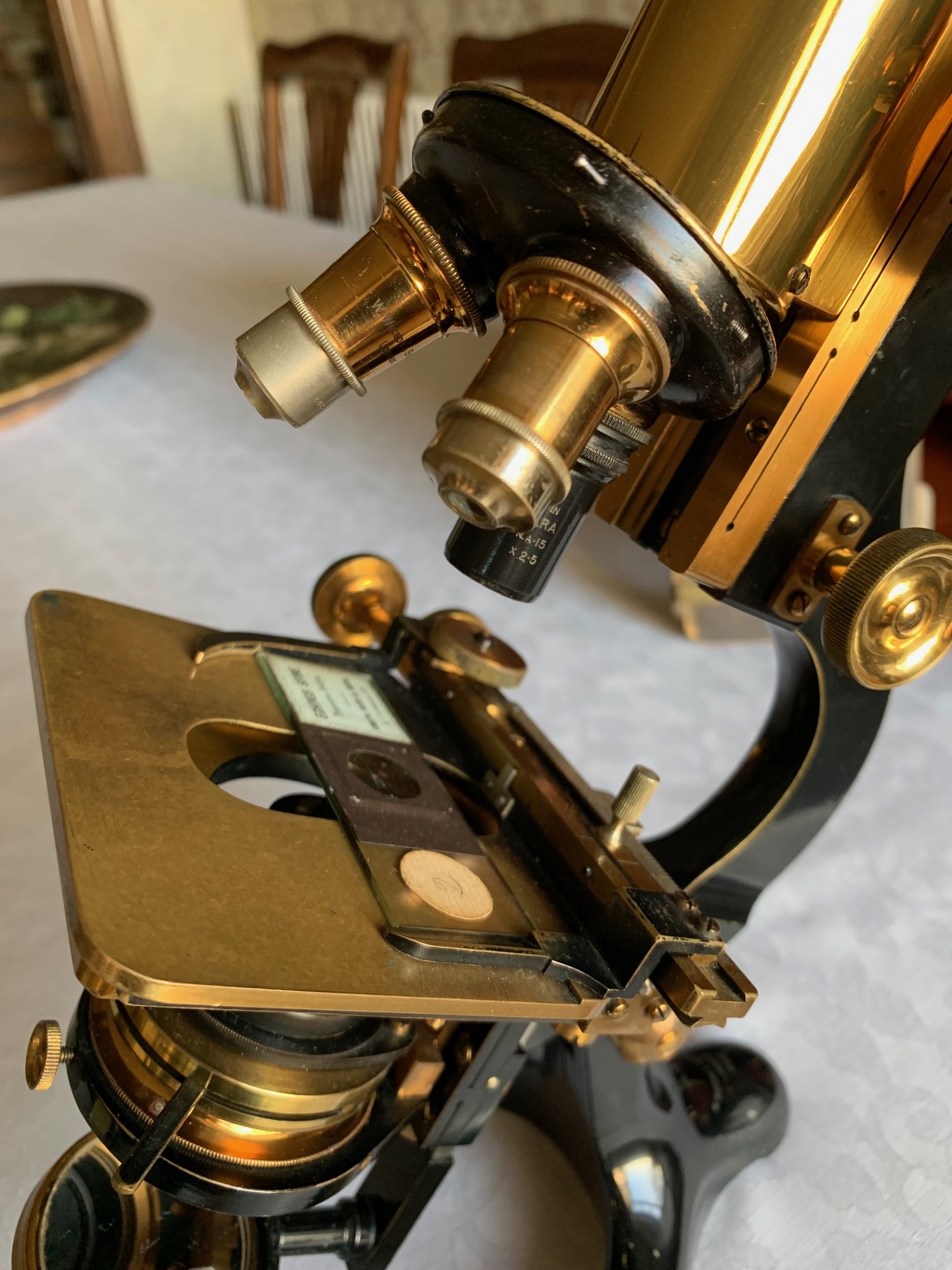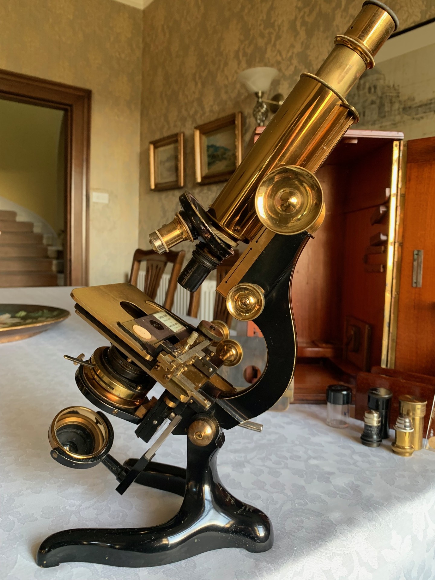 This pre-WWI example is in all-original condition as far as I can tell and has clearly been really well looked after by its former custodians. This Bactil MkIV also benefits from a good set of lenses, an original brass mechanical stage along with a plain brass stage that can be fitted as an alternative and a nice period storage case. It presents really well with hardly any age-related blemishes to its black paintwork, very few other signs of use anywhere on the instrument and probably most importantly, lovely gleaming brass-work detailing throughout. The brass-work really catches the sun and glints with a lovely warm yellow/golden glow as I hope the listing photos demonstrate.