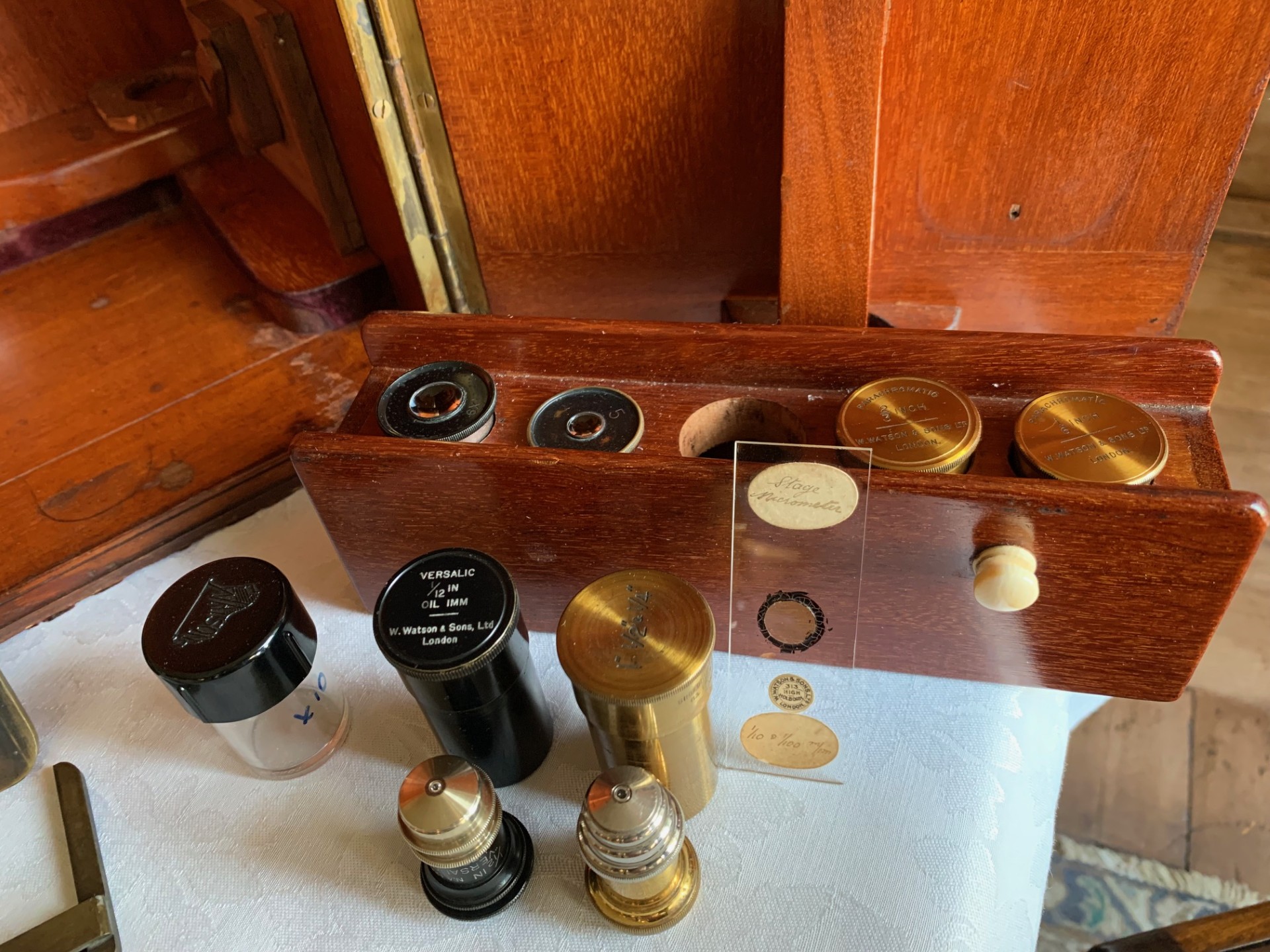 Turning to the optics, this Watson Bactil MkIV microscope comes fitted with a graduated brass eyepiece draw-tube inside an optical tube in lacquered brass. There’s a selection of appropriate vintage eyepieces all by Watson that with good illumination produce excellent images: