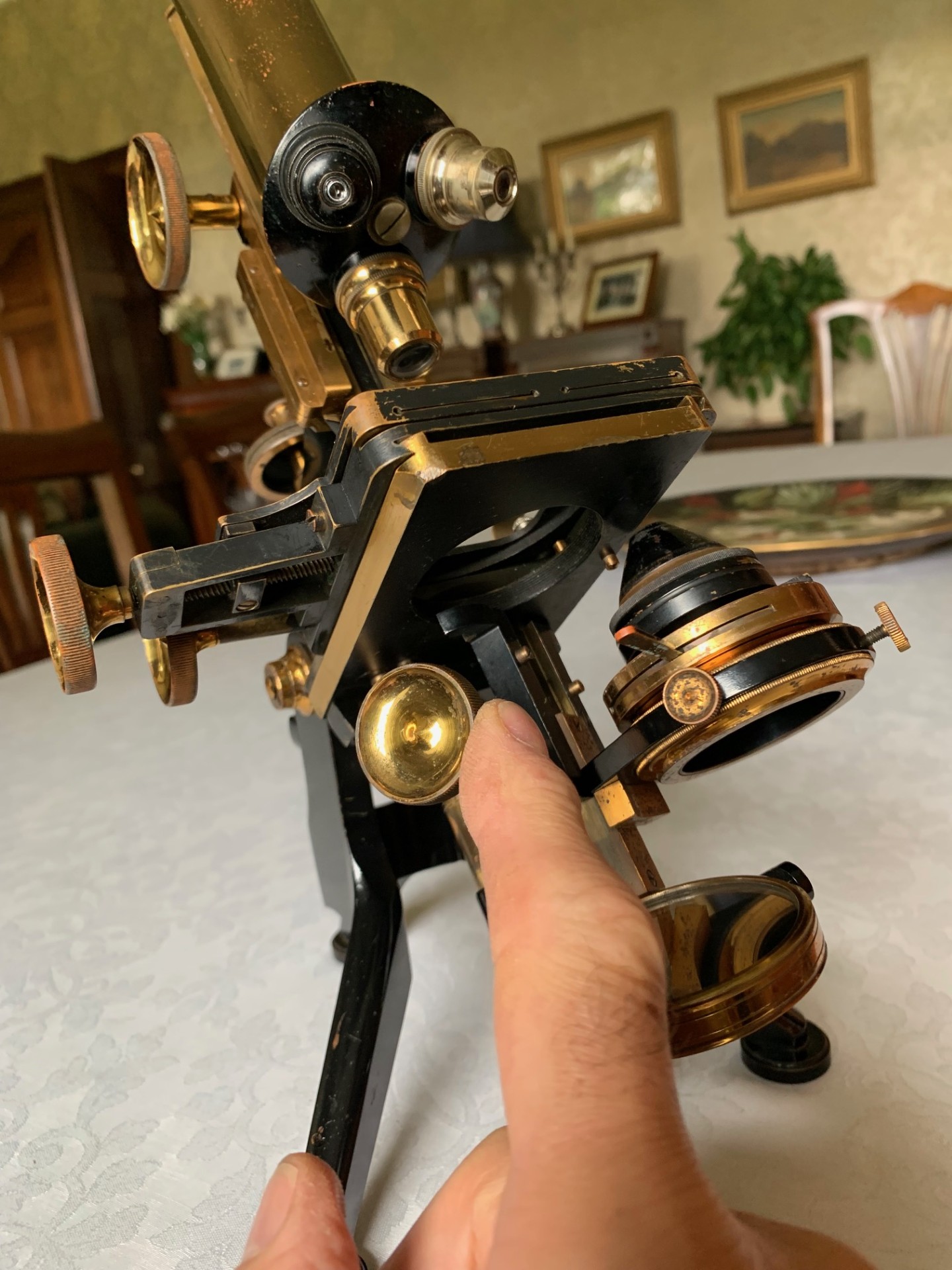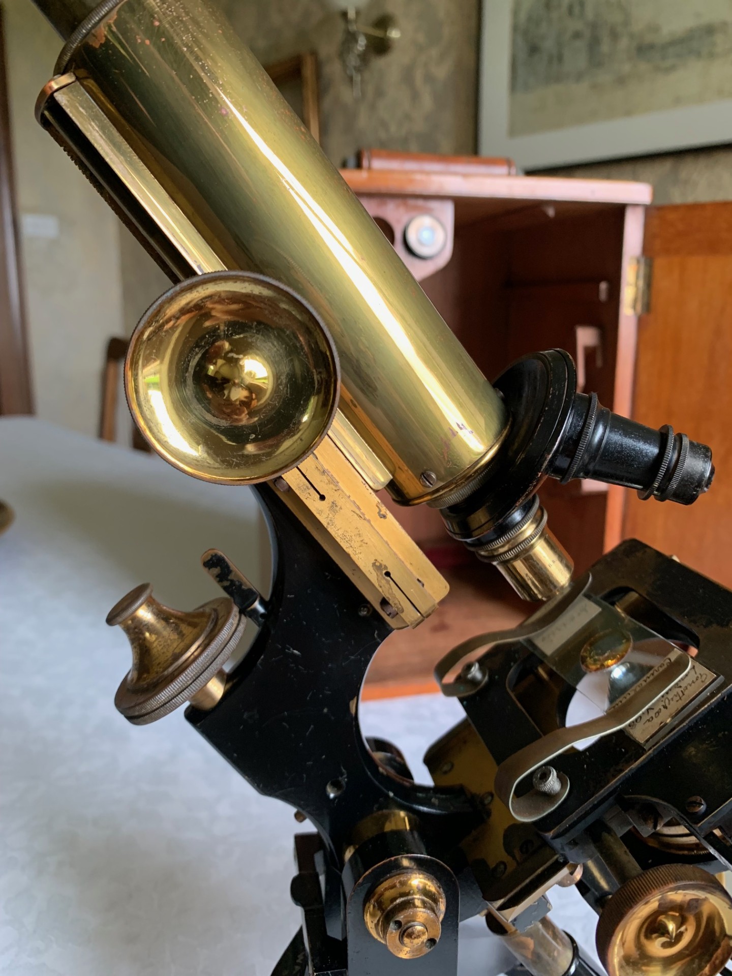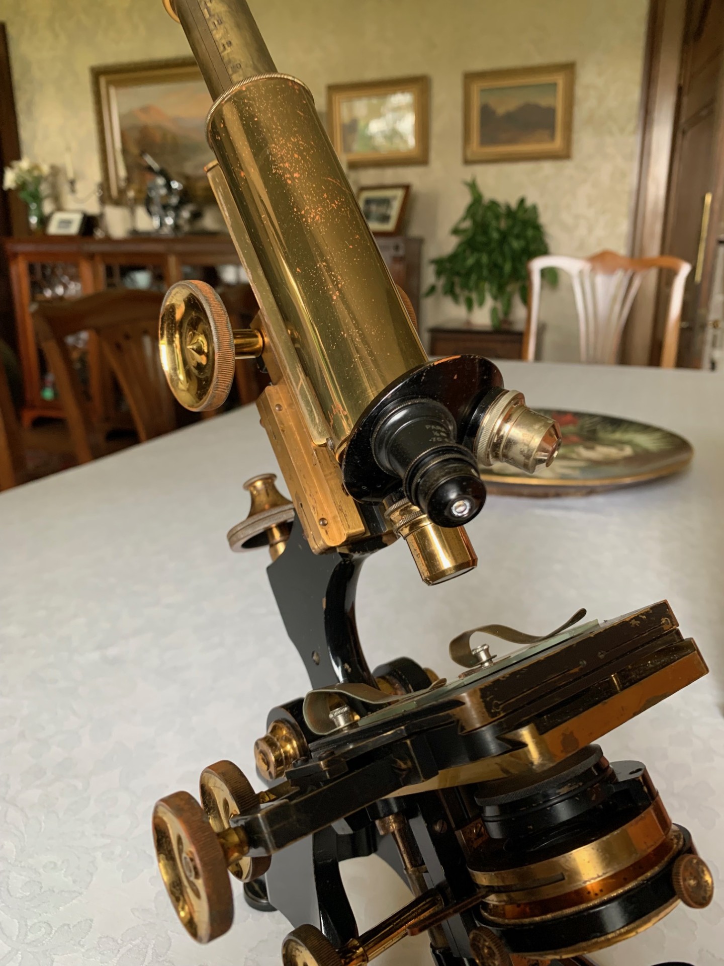 The Edinburgh pattern model of microscope was produced by Watson between 1887 and around 1945; its long production run giving us a firm clue regarding just how good this model of microscope was in its heyday and over that long production cycle Watson regularly updated and improved the model, so what you see here is a fairly early example with some of the original Edinburgh features such as: the stage attached via brass bolts to the upper limb and mirror on a swinging support arm. The Edinburgh stand was originally developed by Watson in collaboration with a professor and lecturer in bacteriology at the University of Edinburgh, hence the Edinburgh designation. With its signature rear cross-member giving that classic “H” look and nice lacquered brass-work, the Edinburgh H is a fine example of British optical engineering with a design and style essentially dating back to the Victorian era.