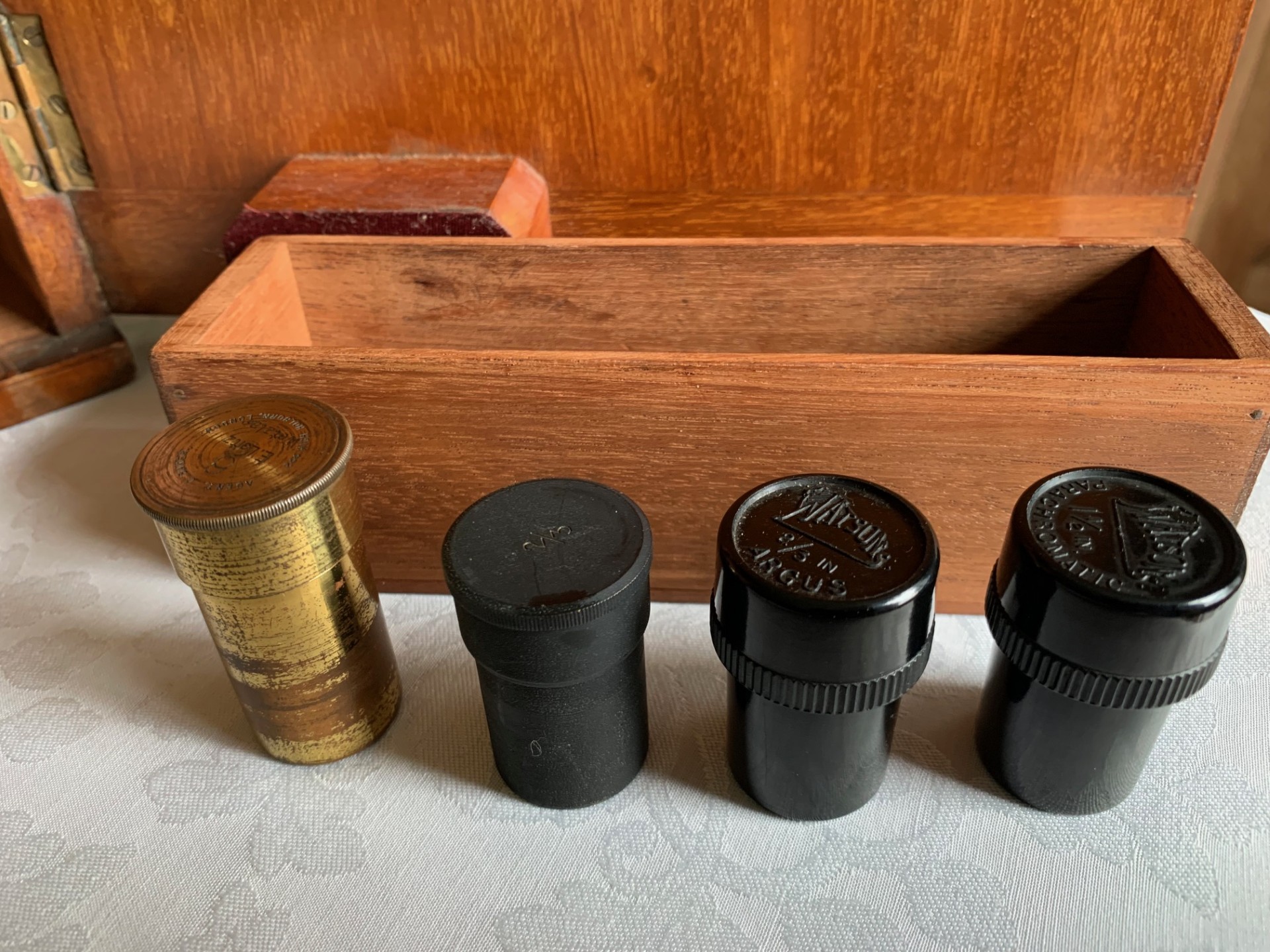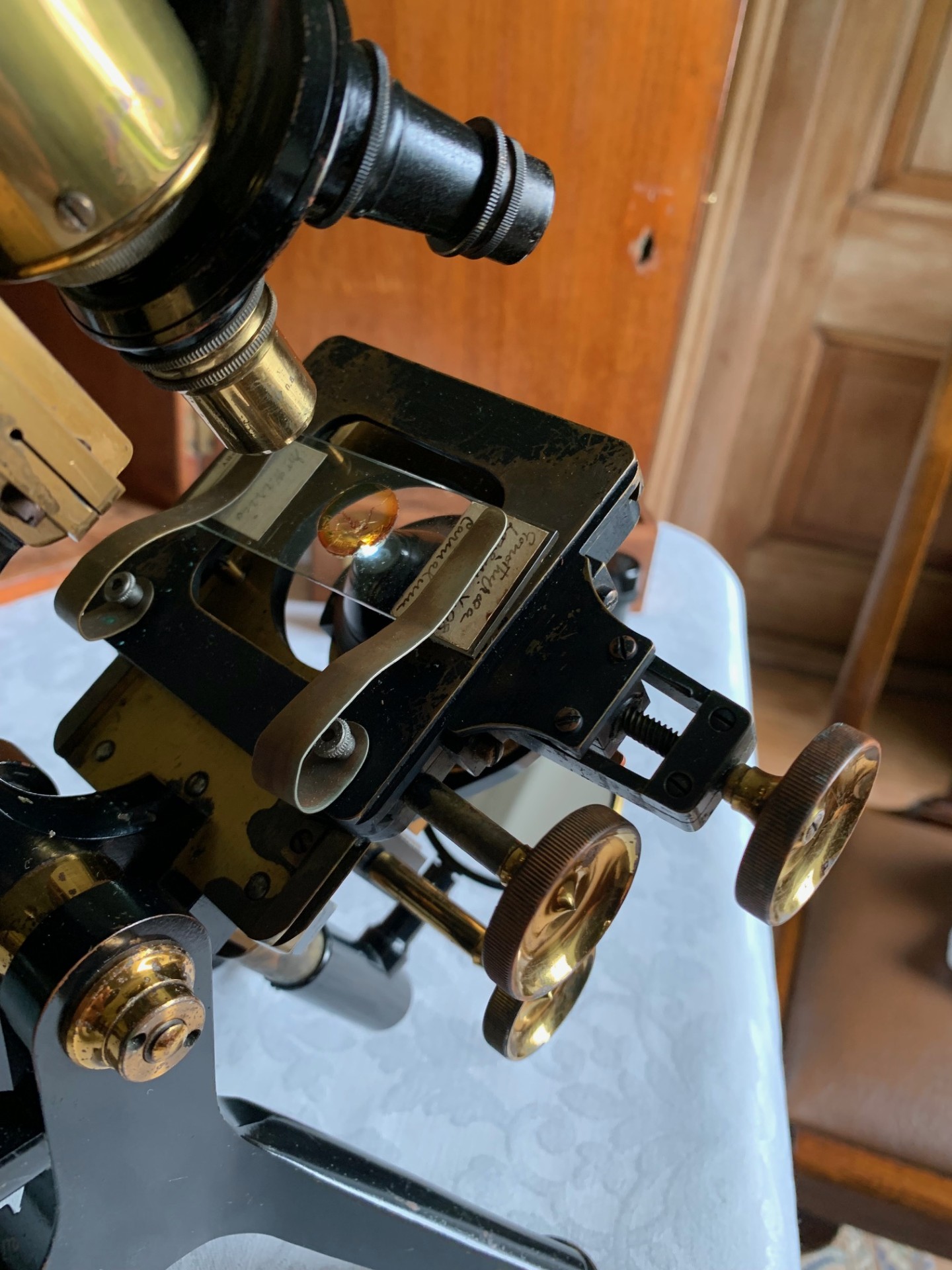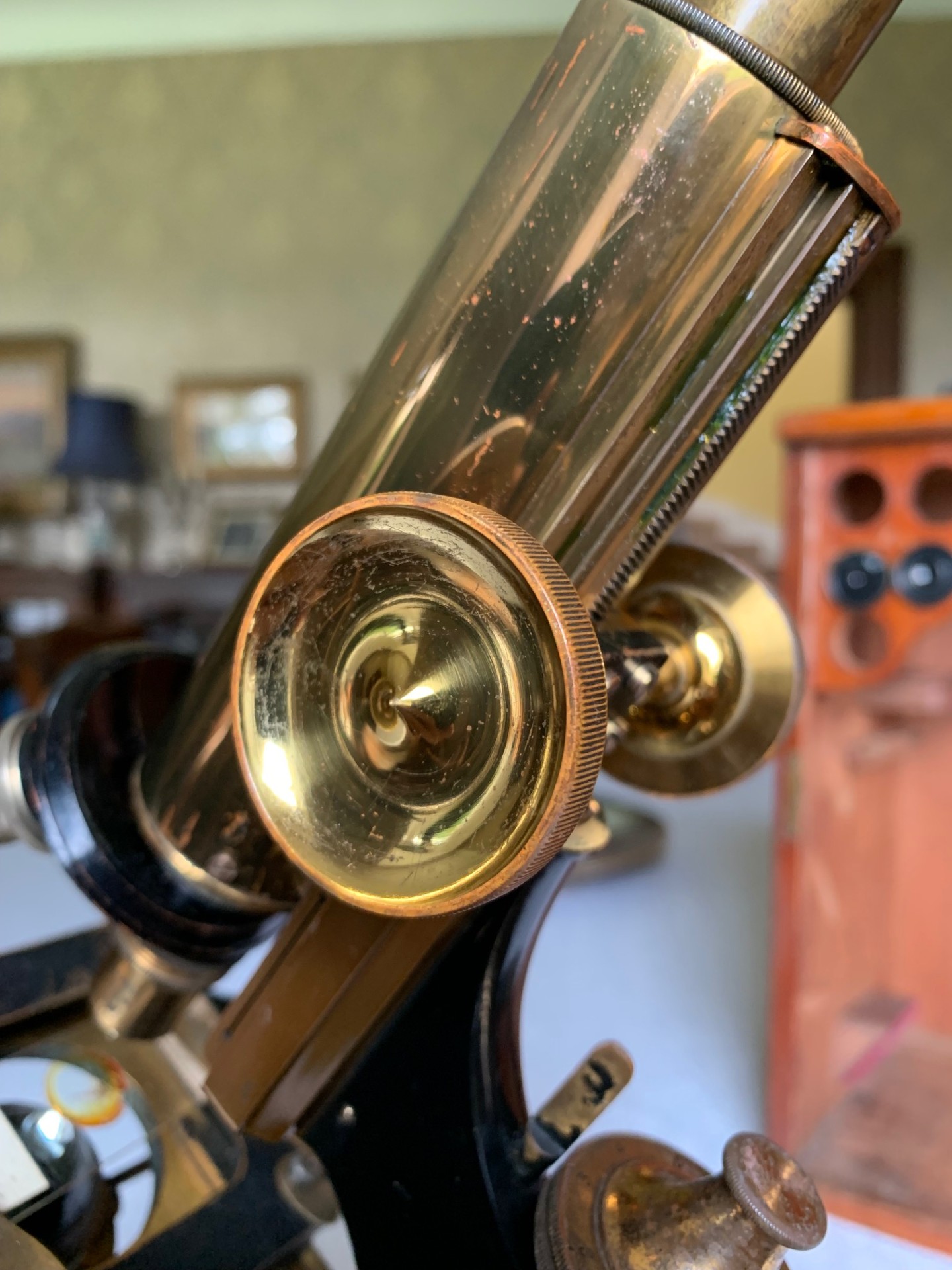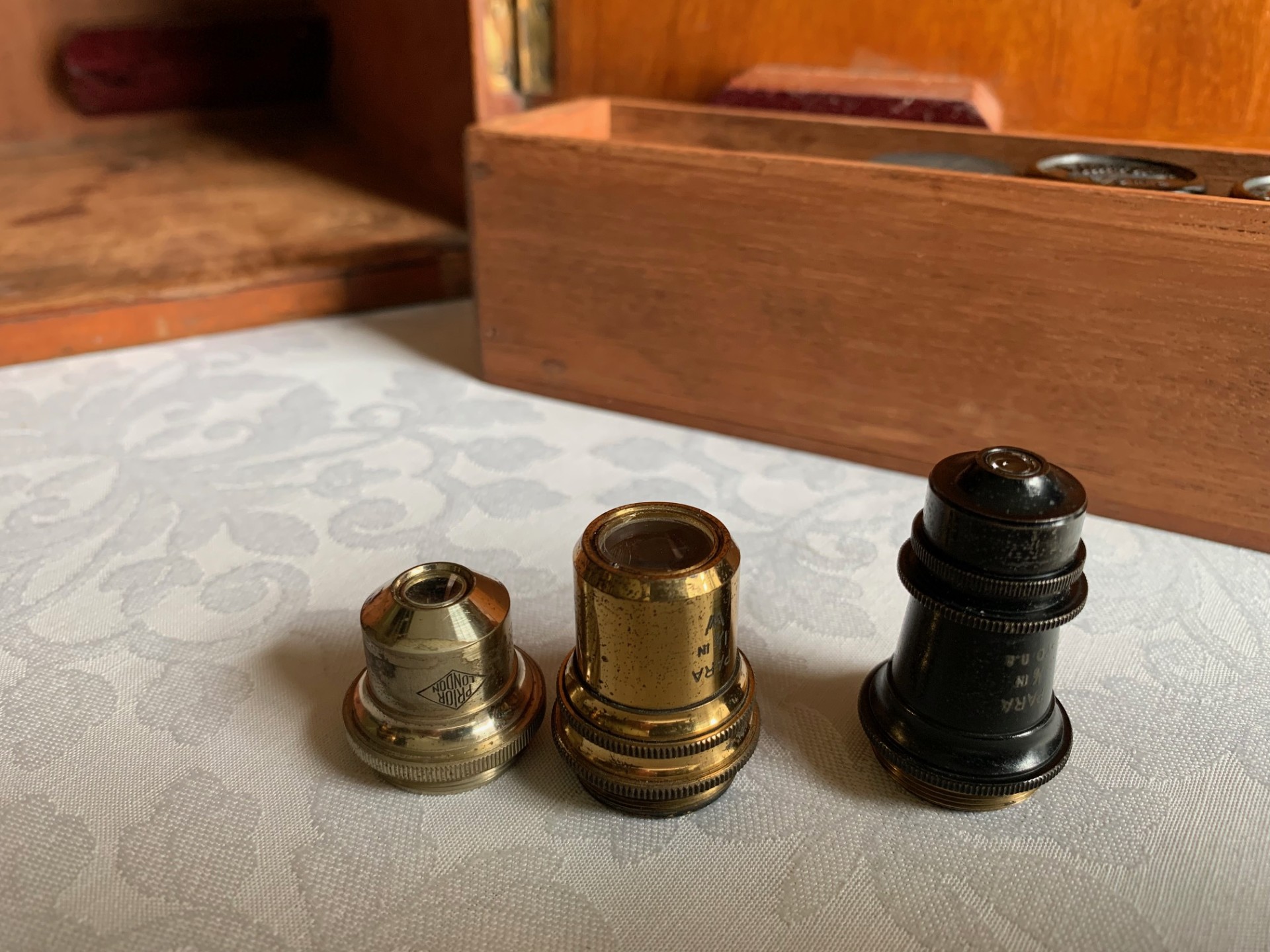 With the optics, this Watson microscope comes fitted with a period graduated brass eyepiece draw-tube inside a brass main optical tube and there’s a good selection of vintage eyepieces that with adequate illumination produce very good images: