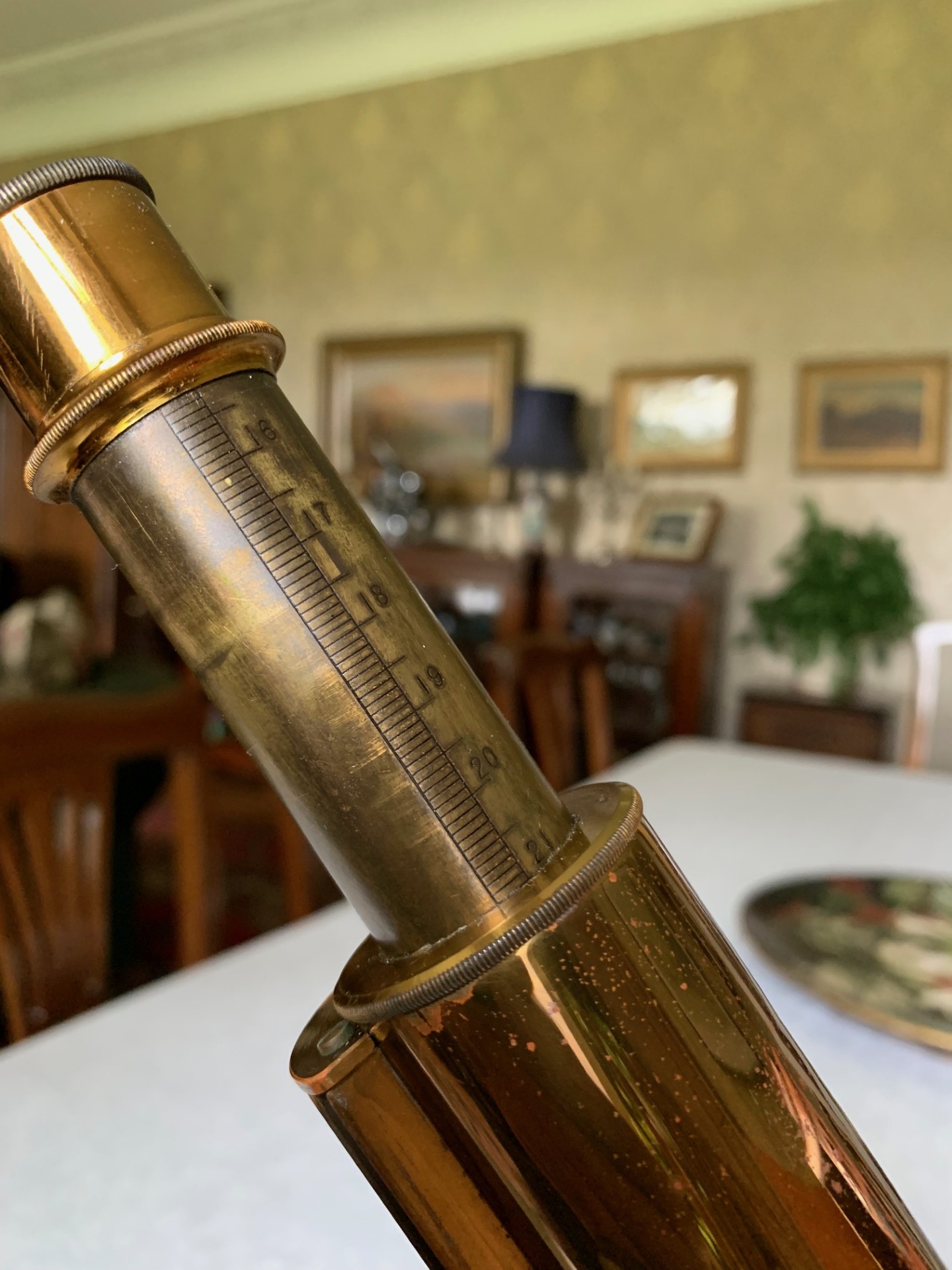 The instrument’s controls and friction surfaces have been very lightly lubricated with non-hardening grease and operate smoothly with a nice feel and there’s not much in the way of noticeable of wear to any of the moving parts. This instrument presents reasonably well for its age and usage profile, with brass-work that catches the light well. This example presents well while being used as a desk-top instrument and will also display rather nicely in a library of home office setting.