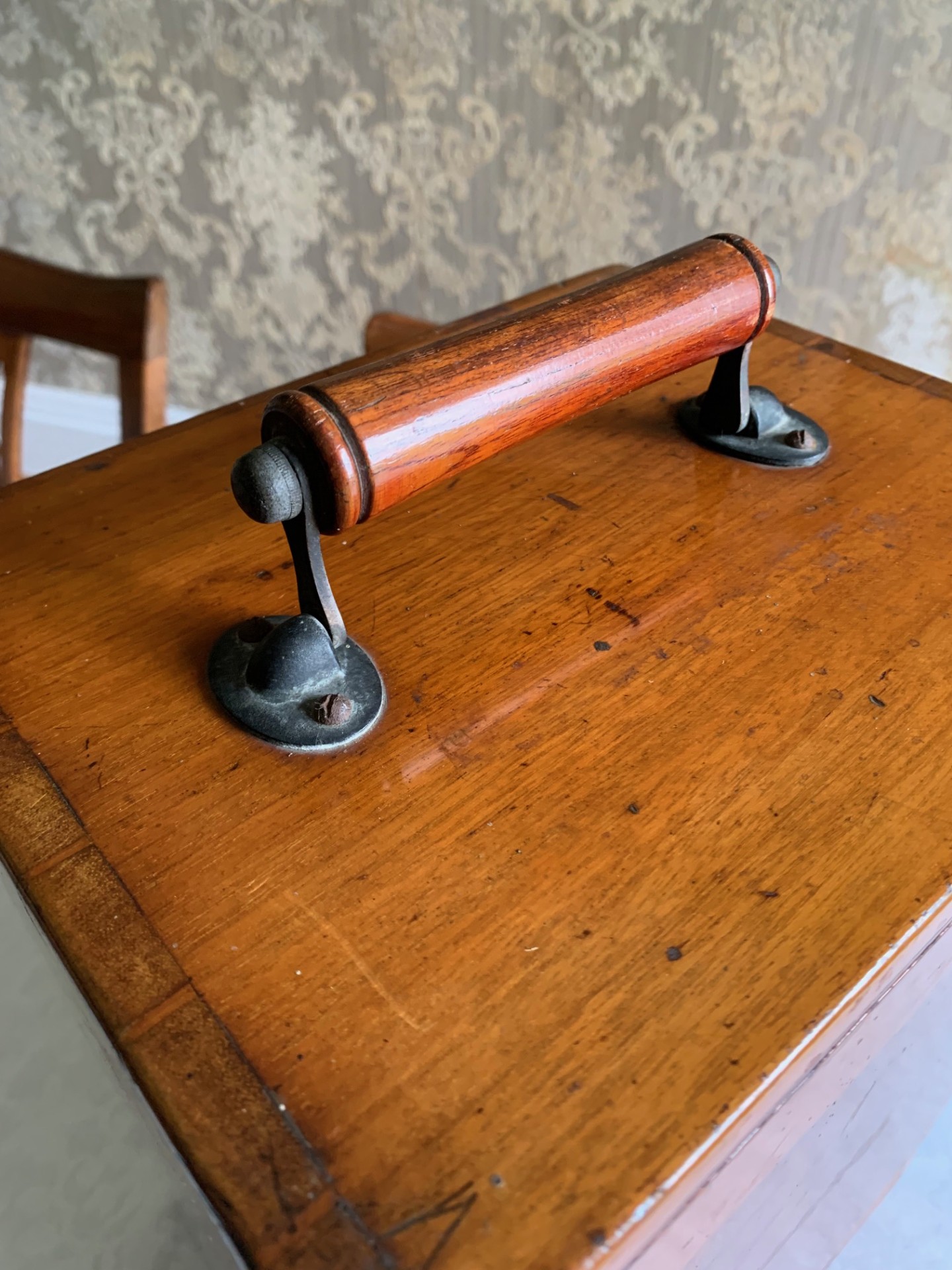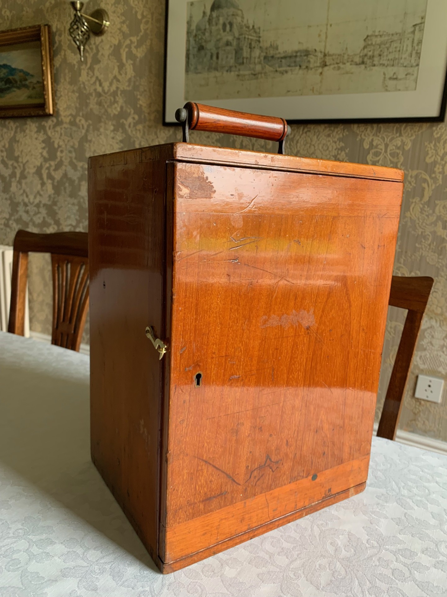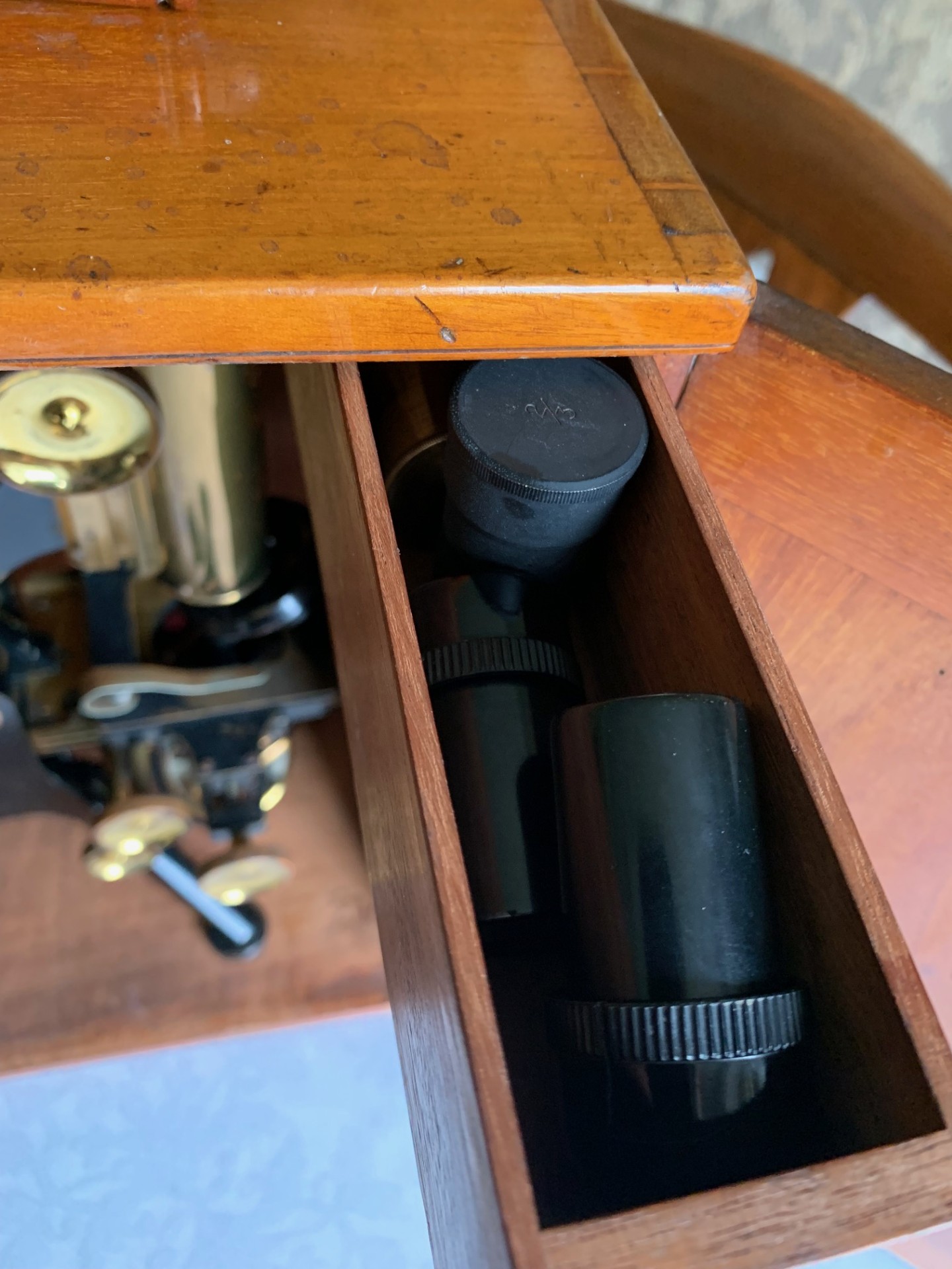 There’s an original Watson storage case with this example, with wooden carry-handle, internal racking and sundries drawer. The lock is missing so there’s a cupboard latch fitted in order to keep the door closed. Overall the case has just the right aged look with patina and some lovely exterior sheen, so complements the antique microscope perfectly.