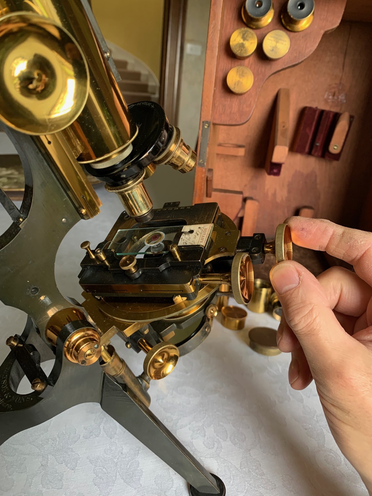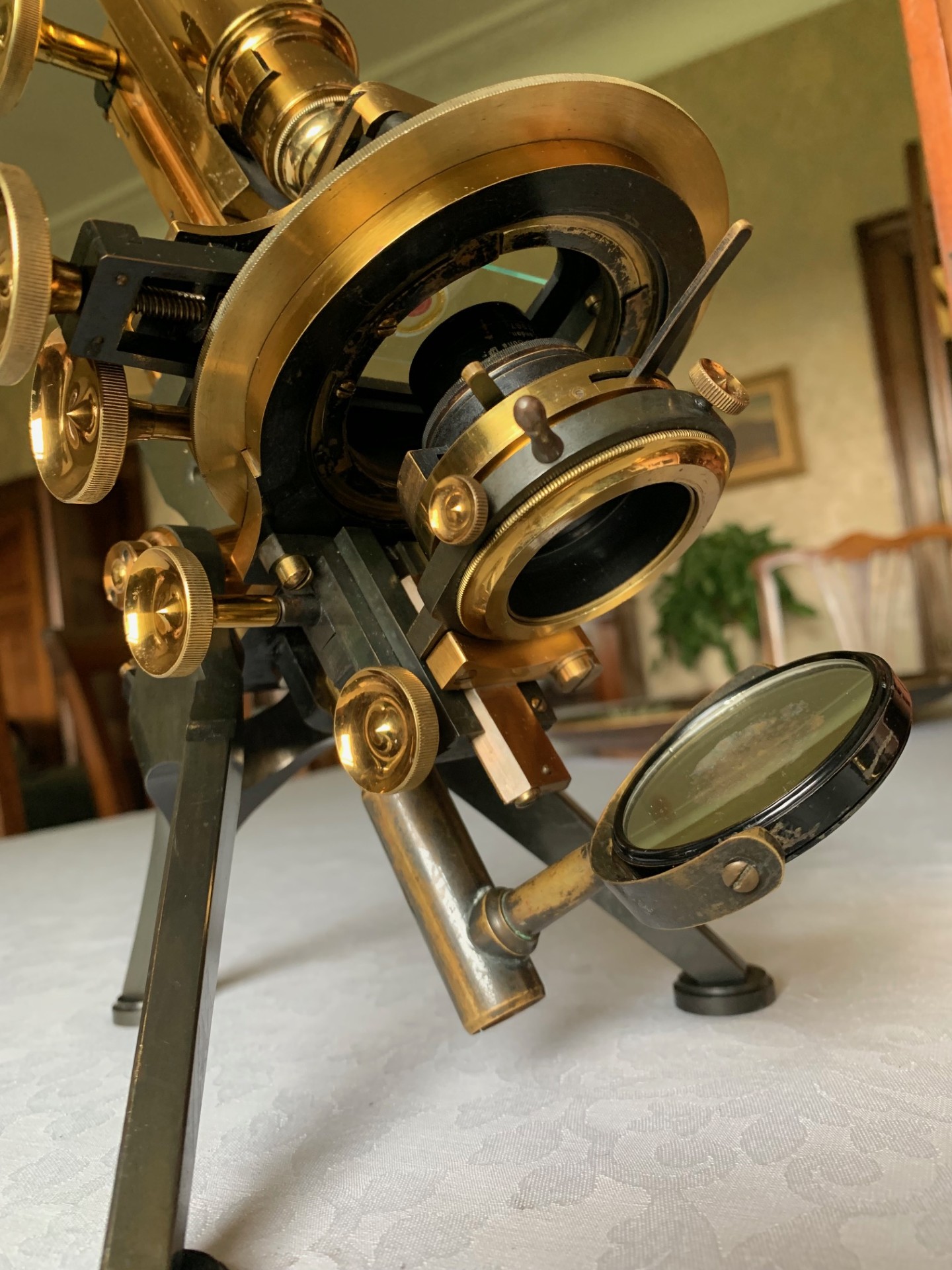 This example #6286 dating to 1901 based on its size and key features therefore appears to be a custom Royal, with the old style of tripod with more slanted twin uprights supporting the main pivot and it’s a rather special period find in such pristine condition. The Royal was designed to offer most of what the larger Van Heurck models could offer, but at a more affordable price. I’m sure that the Watson cognoscenti will have their own views, but I believe that this example is a Royal fitted with sub-stage fine adjustment with the adjustment thumb-wheel located below-stage. Further evidence of this being a Royal model is the spread of the front tripod legs, which is 6.75 inches and the tripod feet are all anodised brass and shod in cork, which was a specific Royal feature and allows the instrument to be used on a polished surface if so desired. Van Heurck models when fitted with a tripod were also shod with cork but all had shiny lacquered brass feet; they would also have a tripod spread greater than 7 inches.