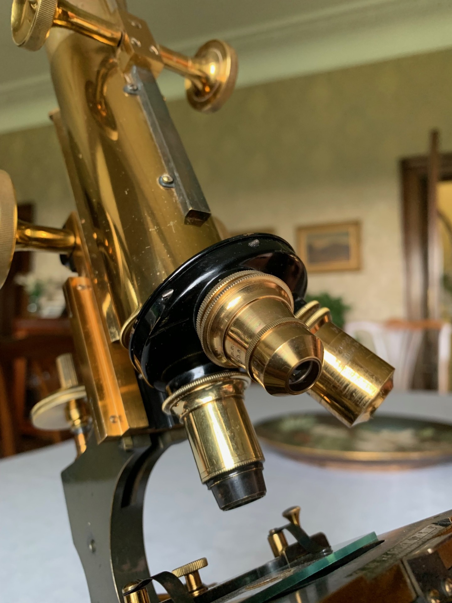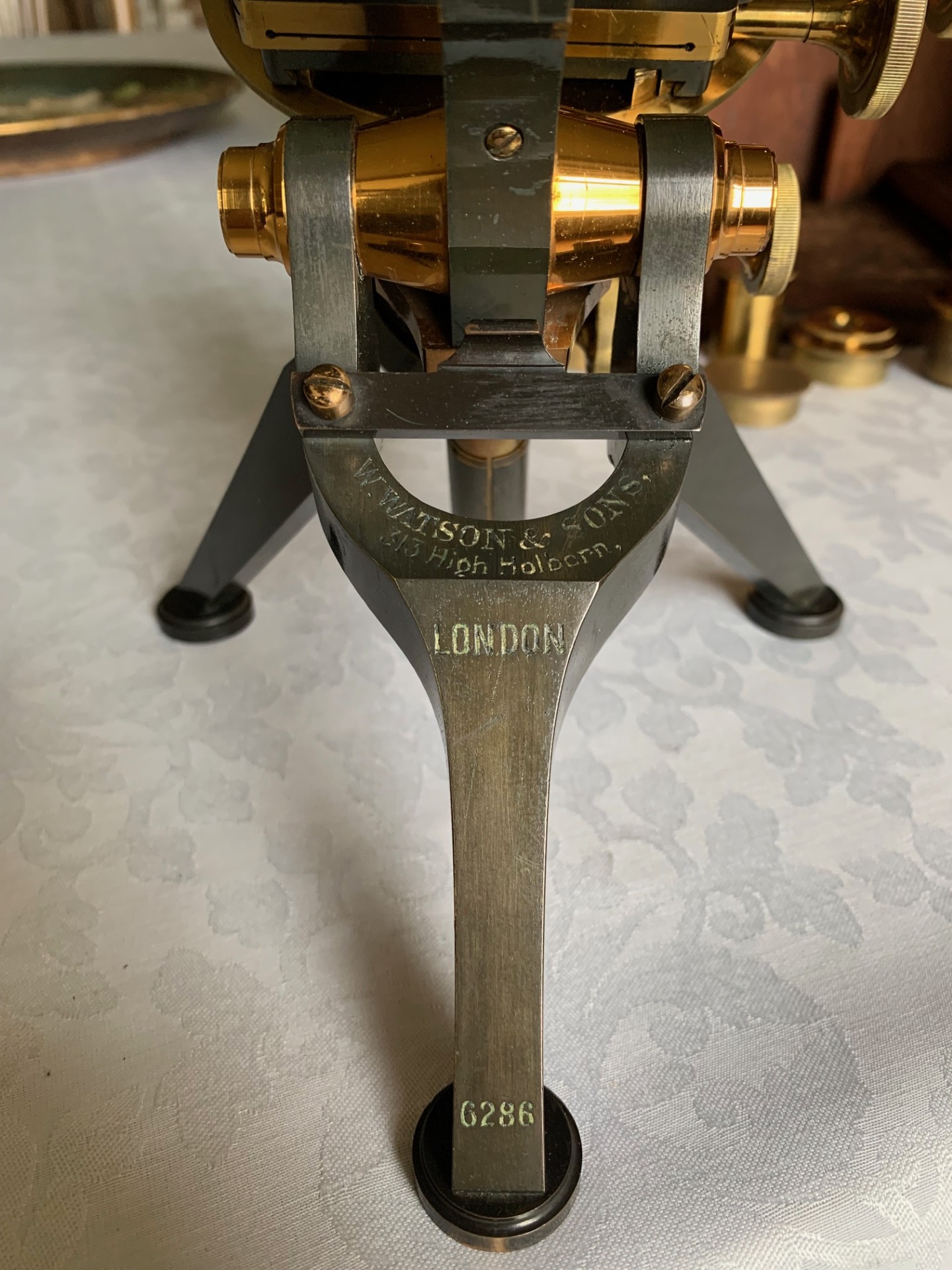 This listing is for a highly collectable example of Watson’s Royal model of brass microscope. It’s quite an imposing instrument standing over 18 inches high when the draw-tubes and coarse focus are fully racked out in monocular configuration and I hope that the listing photos do the instrument justice and showcase its excellent condition. This example dates to around 1901 based on its serial number 6286 which is engraved on the tripod just above the rear foot. In 1901 Watson traded as W.Watson & Sons and it wasn’t until 1908 that they incorporated as a limited company.