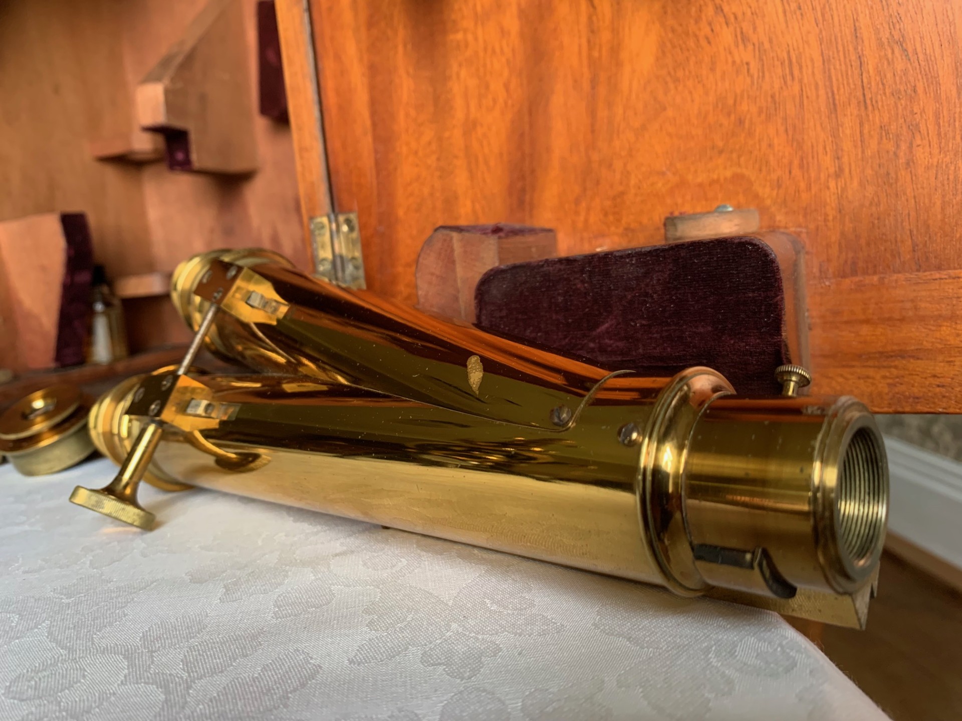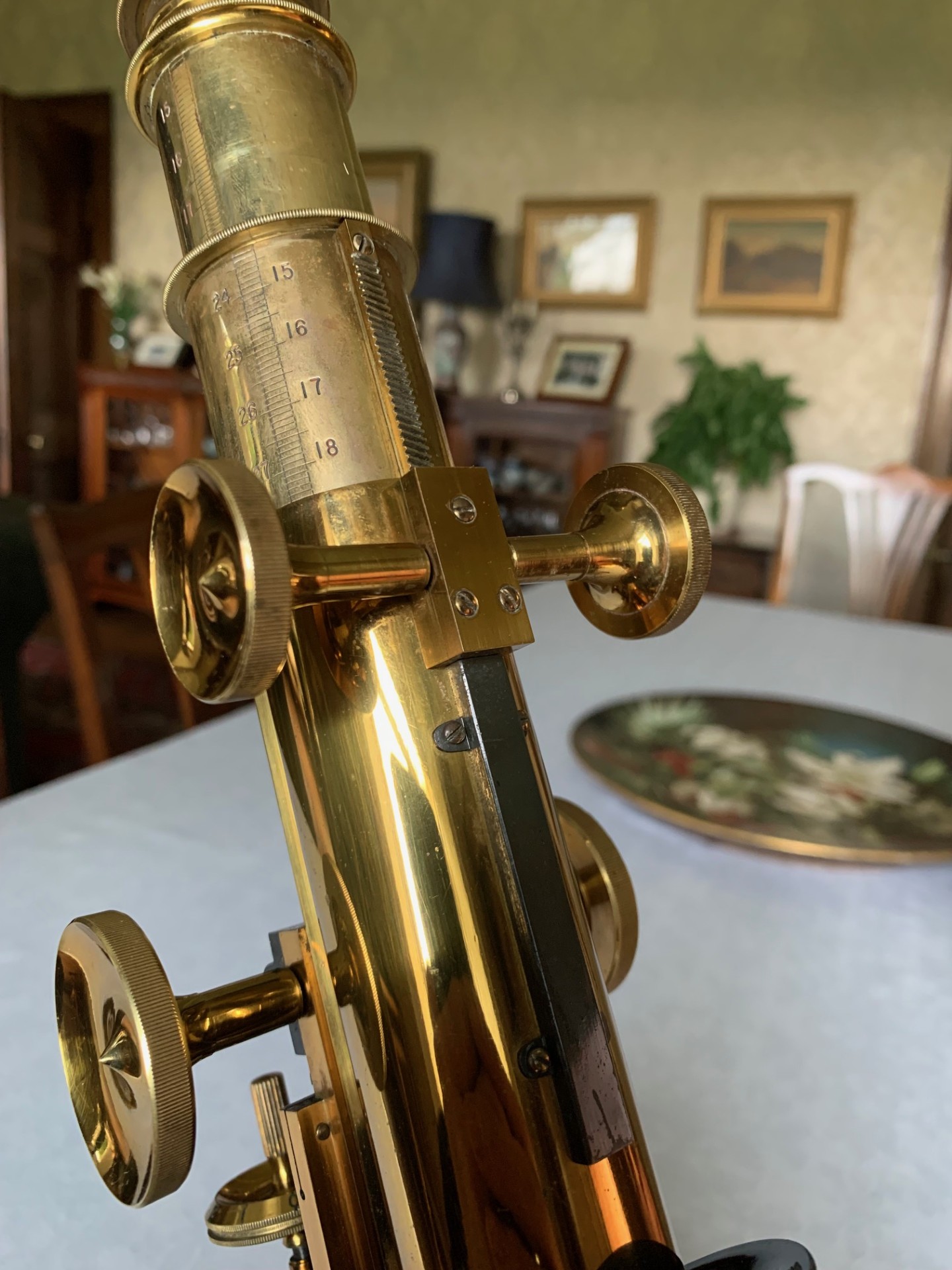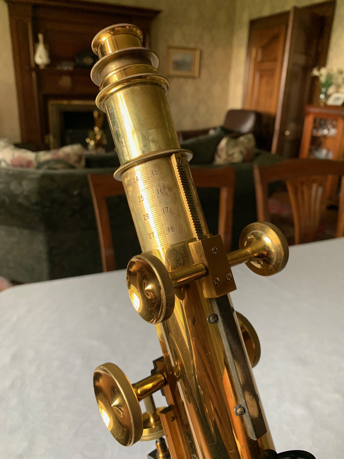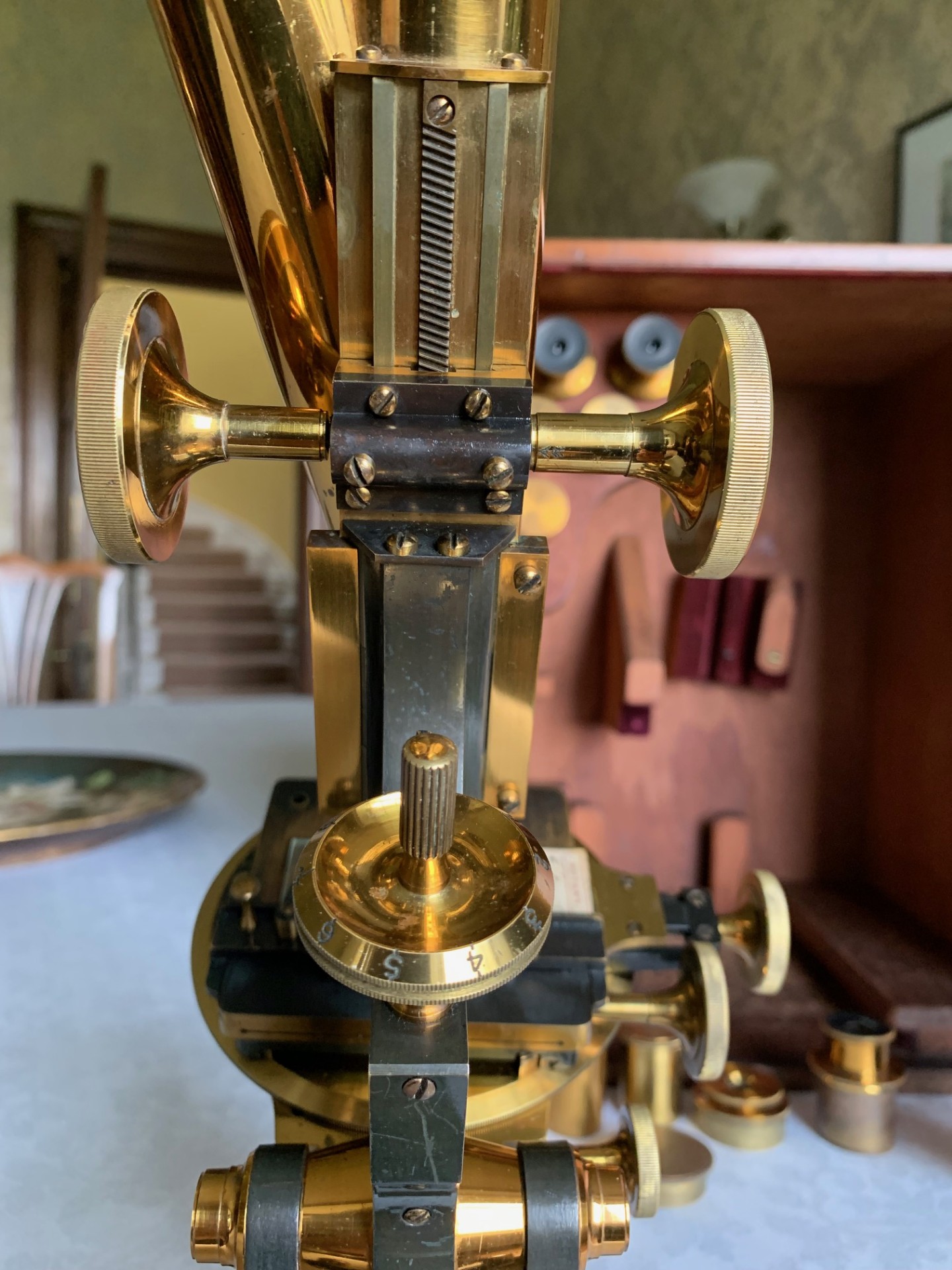 The instrument and its controls have been very gently dusted, with the friction surfaces and moving parts sparingly lubricated so that they operate smoothly with only very slight age-appropriate signs of wear. This instrument presents extremely well and is in almost pristine condition, which is remarkable for a 125 year old technical instrument of this type. The brass-work catches the light beautifully, showing only very minor wear losses, which is what you’d hope for with an antique instrument of this age and quality that’s been really well cherished and cared for through what must have been several changes of ownership. Overall, it’s in fine shape and capable of producing some nice images, catering as it does for both monocular and binocular viewing styles. This example is essentially a highly collectible and very well endowed Watson Royal model with a good selection of accessories (listed below), in near perfect condition for its period and it’ll make a very nice usable instrument and also a stunning and imposing display piece. It also presents rather well while being used as a desk-top instrument and will also look good in a library or home office setting.
