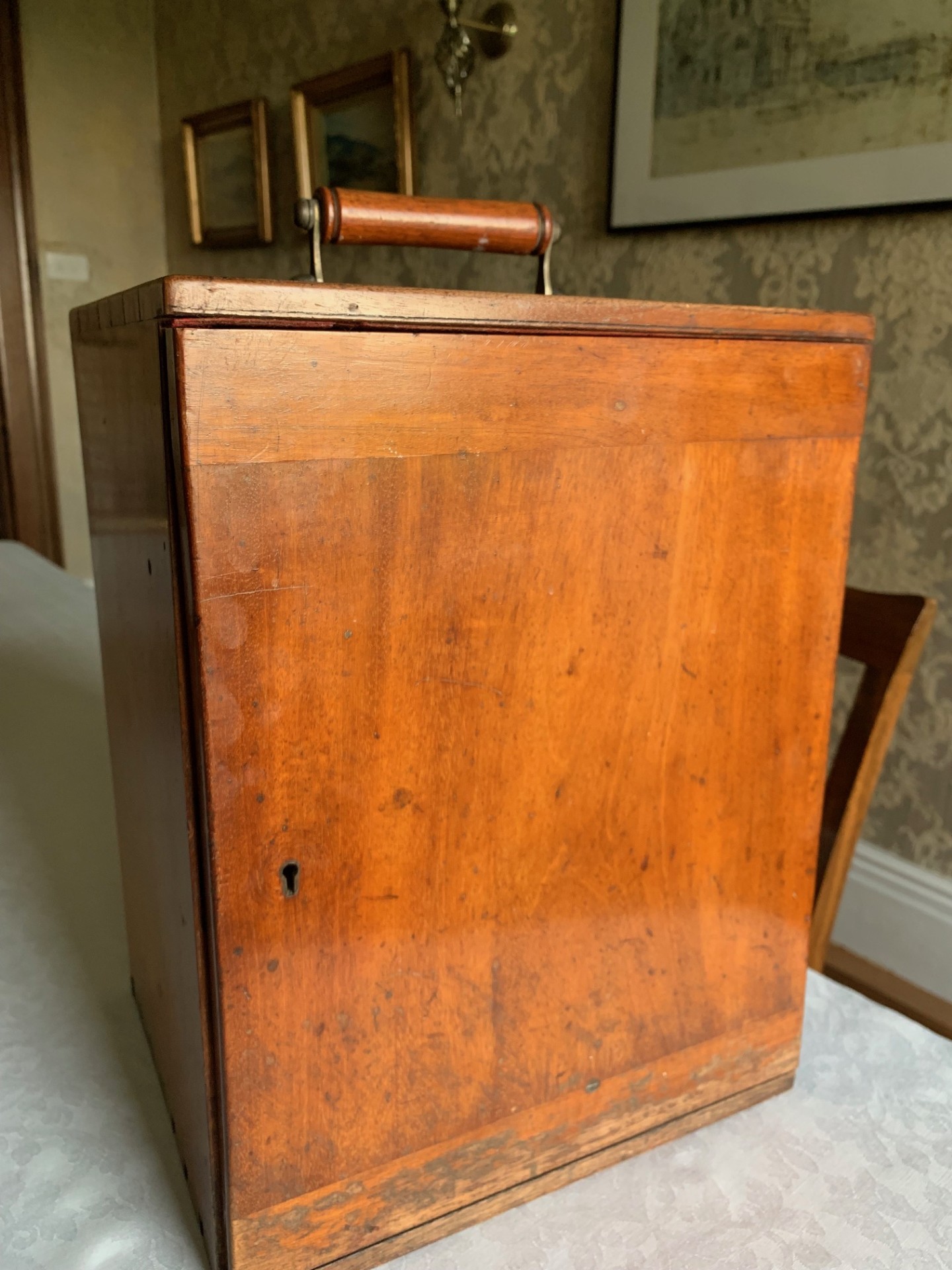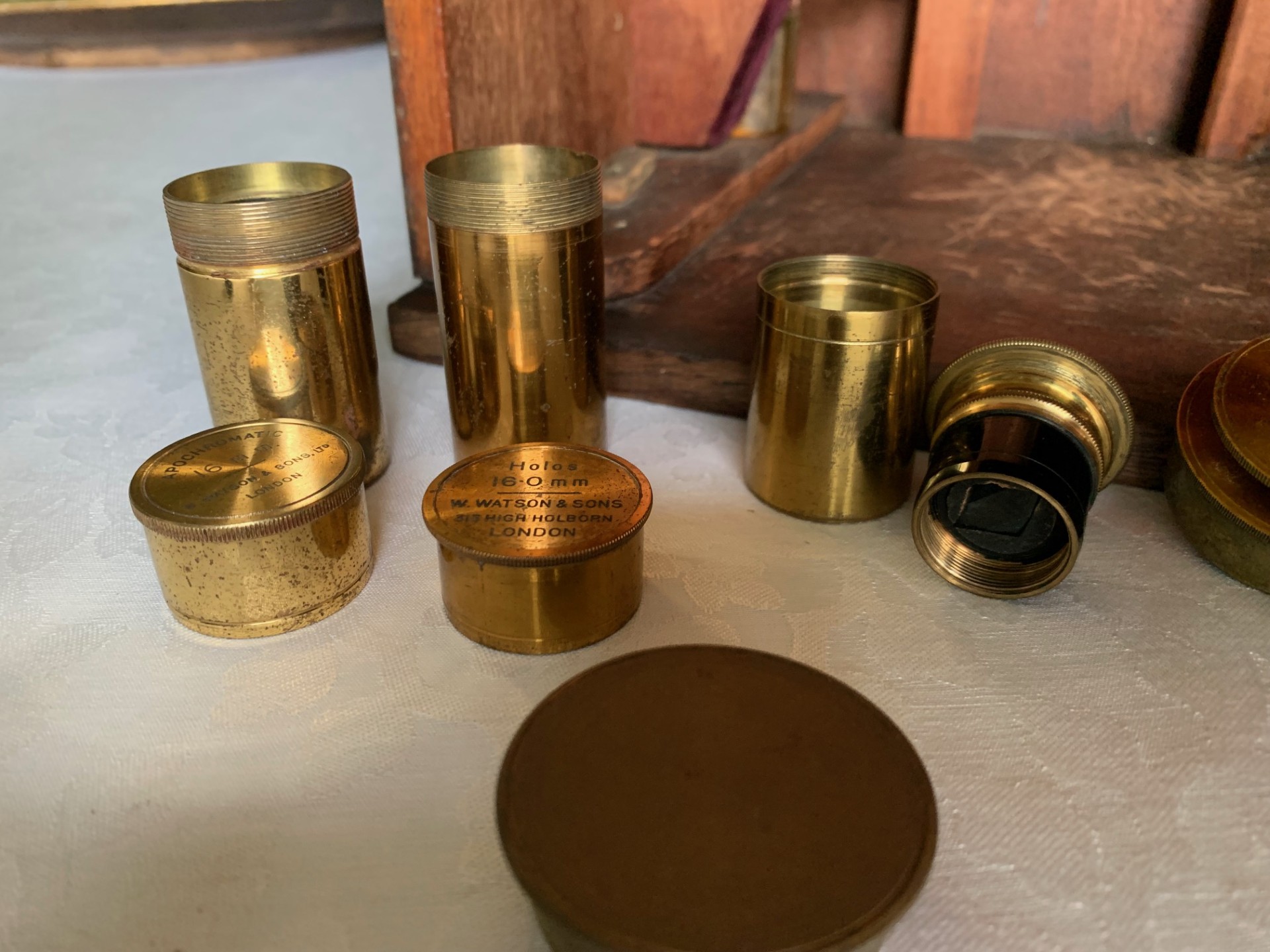 There’s a correct period Watson hardwood storage case with this instrument with wooden/brass carry-handle, internal racking and working lock that’s just missing the key. It’s also got an exterior finish that’s in keeping to complement the antique Watson microscope that resides within.