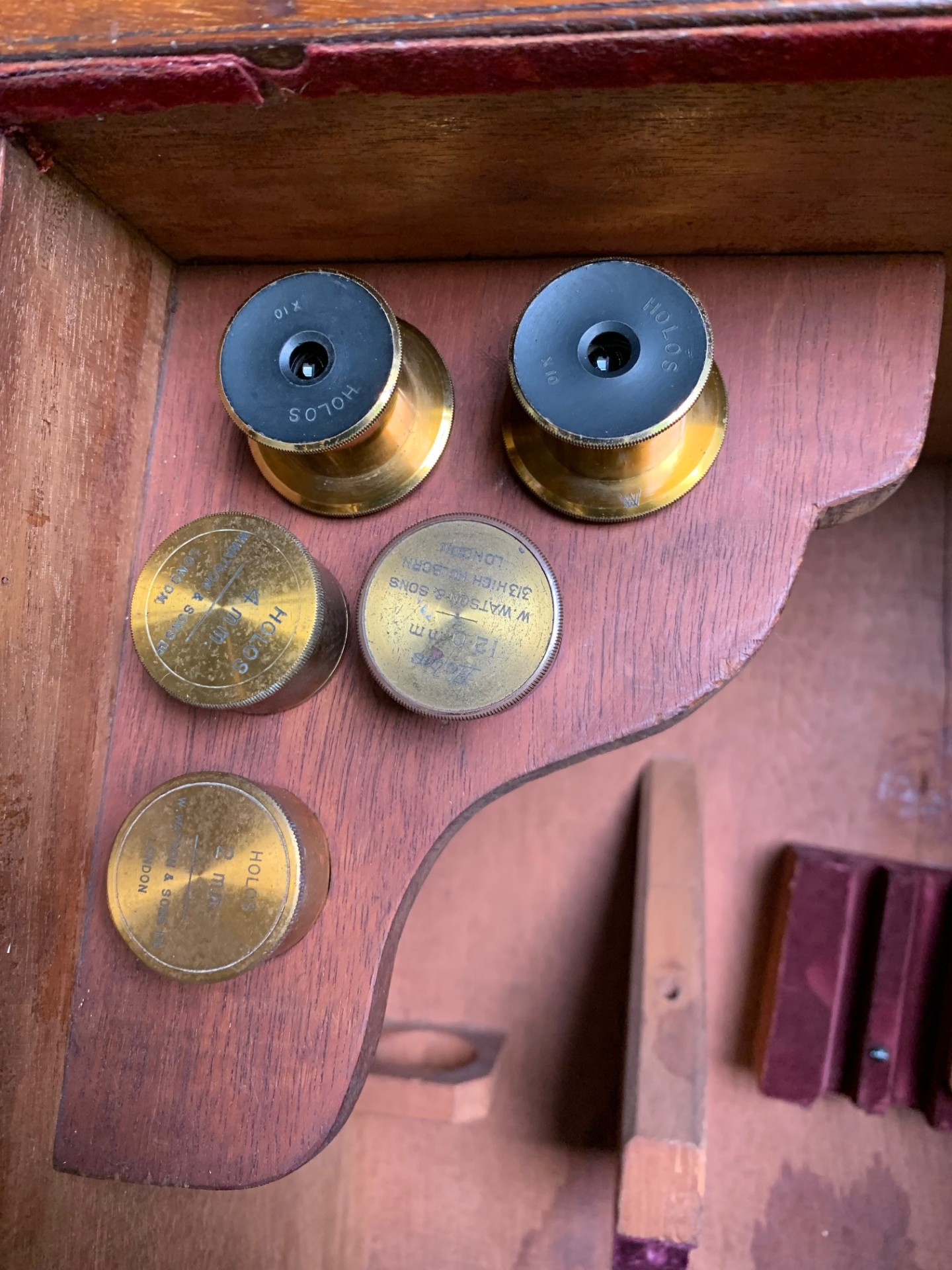 There’s a very good selection of quality objective lenses by Watson and a later 1930s Watson brass triple turret which rotates with good feel when the objectives align with the optical axis. The objective selection is as below: