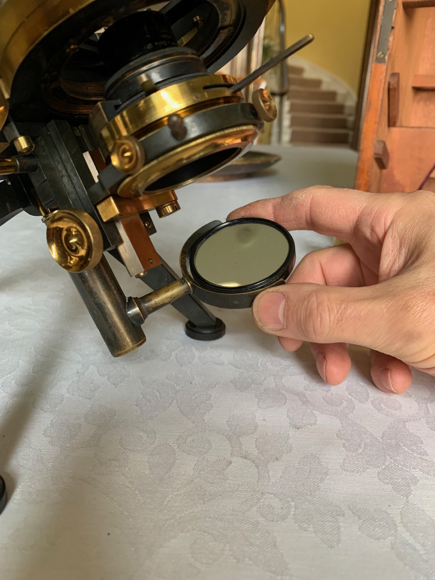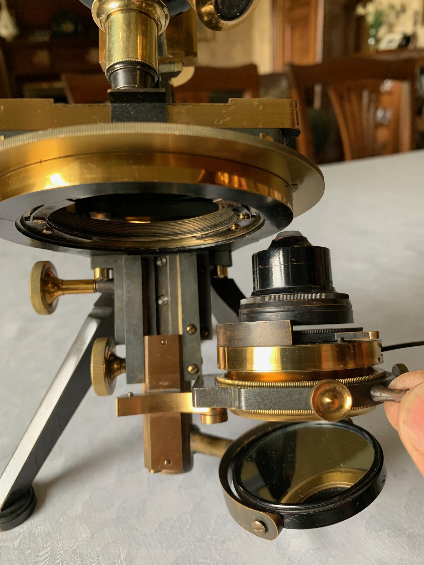 Lighting is via a later replacement plano-concave mirror on a gimballed slider, which sits on a height and swing adjustable brass support arm, with silvering that’s got some foxing, but reflectivity that’s perfectly good.