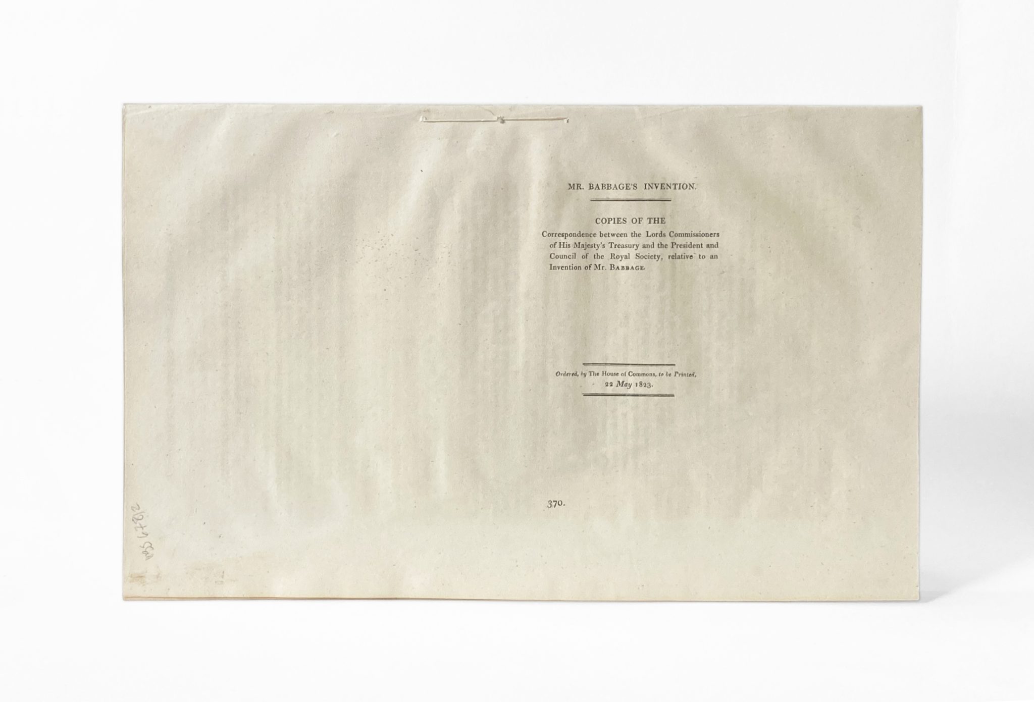 THE DIFFERENCE ENGINE GAINS THE SUPPORT OF DAVY, THE ROYAL SOCIETY, AND THE BRITISH GOVERNMENT. An exceptionally scarce and important document. This is the sole separate printing of the parliamentary record (‘Sessional Papers’) containing Babbage’s celebrated letter to Humphry Davy, as well as the favourable response of the Royal Society. Only one other copy is recorded worldwide, at the University of Illinois; however, the present copy is the only known example to retain its original stab-stitching, i.e. to be offered in the pristine ‘as issued’ state.