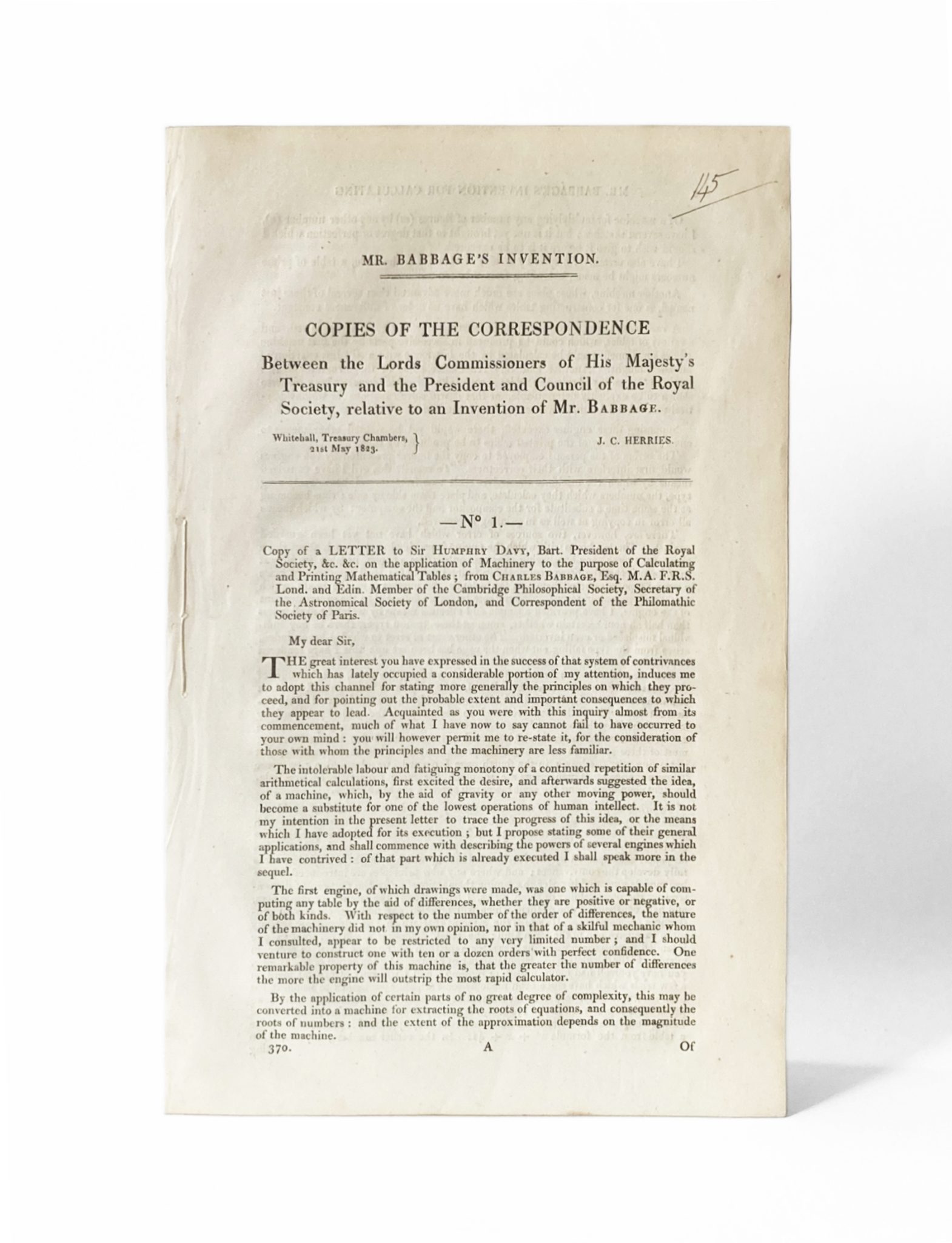 [OFFPRINT] Mr. Babbage’s Invention. Copies of the Correspondence Between the Lords Commissioners of His Majesty’s Treasury and the President and Council of the Royal Society, relative to an Invention of Mr. Babbage [INCLUDING]: A letter to Sir Humphry Davy, Bart. on the application of machinery to the purpose of calculating and printing mathematical tables