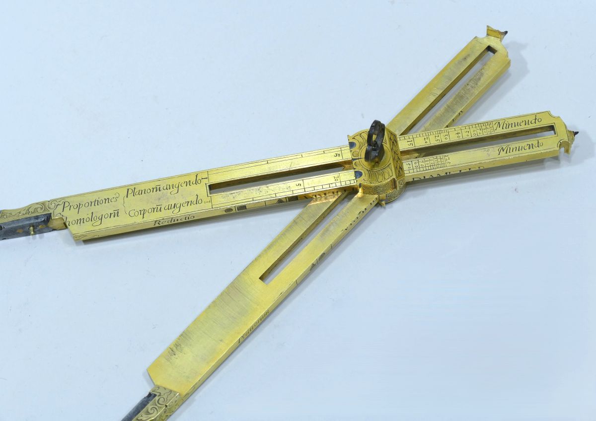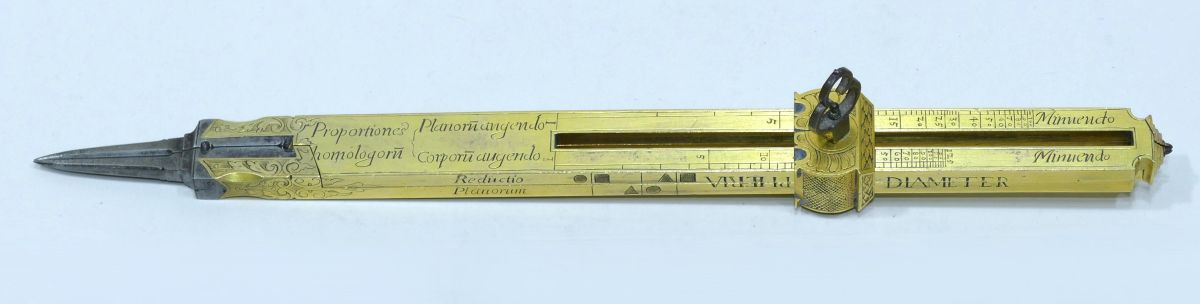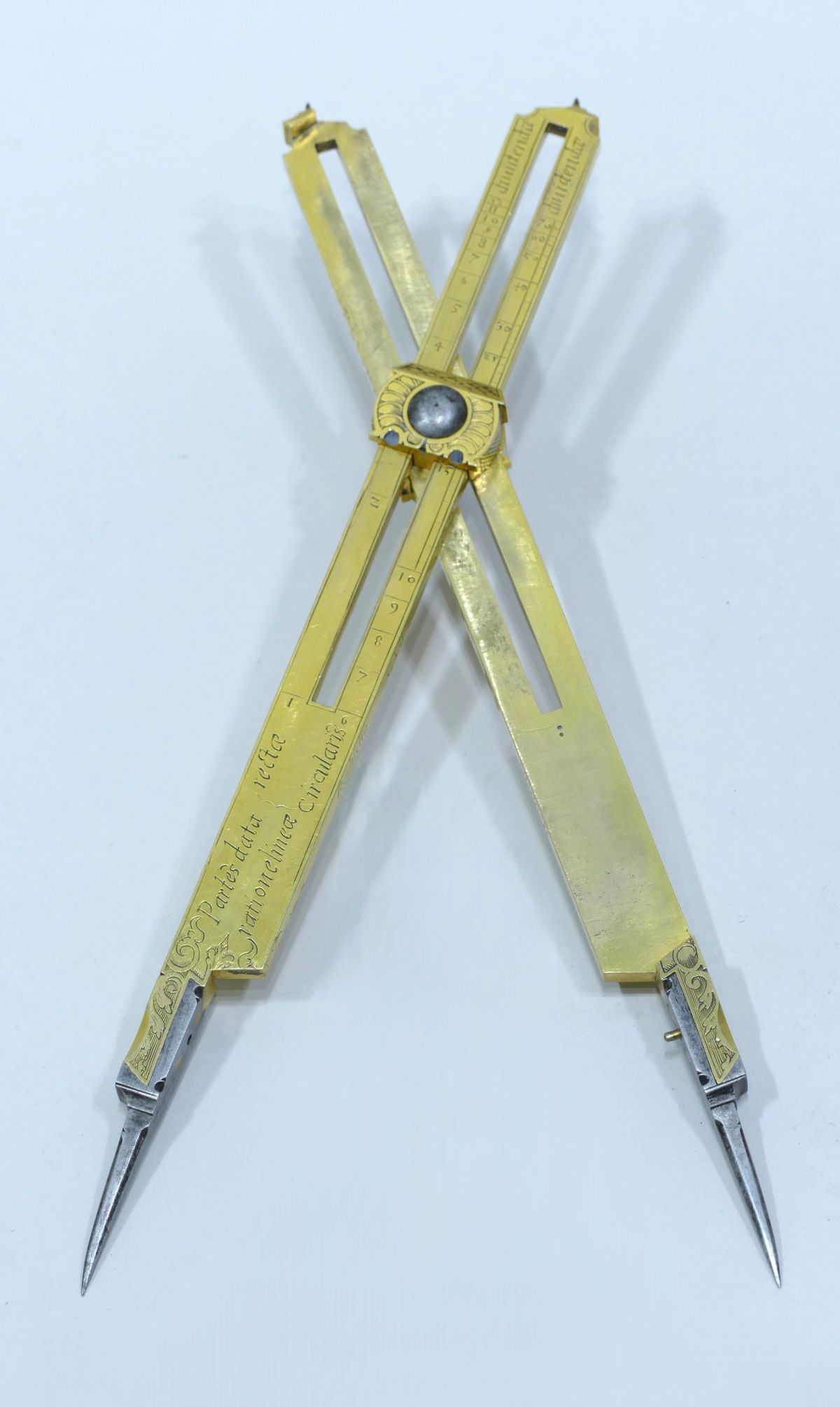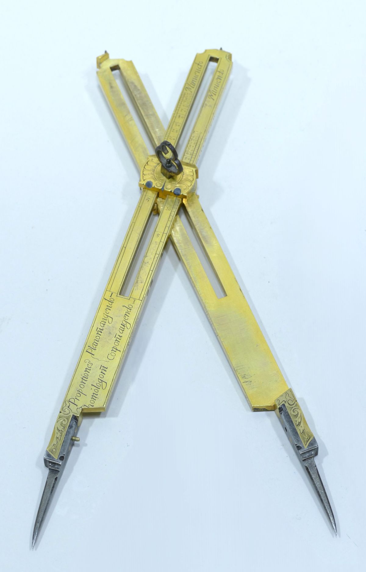 Each arm has two steel points at the ends, one longer than the other, and is engraved with different scales: one arm has two scales marked “Proportiones homologorum / Planorum angendo Minuendo / Corporum angendo Minuendo” (one graduated from 1 to 100 and the other from 1 to 125). The other arm also has two scales marked “Partes data rationelineae / rectae dividendae / Circularis dividendae” (one graduated from 1 to 12 and the other from 6 to 70).