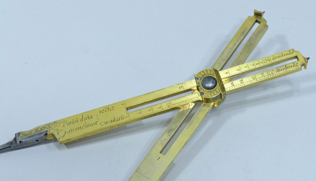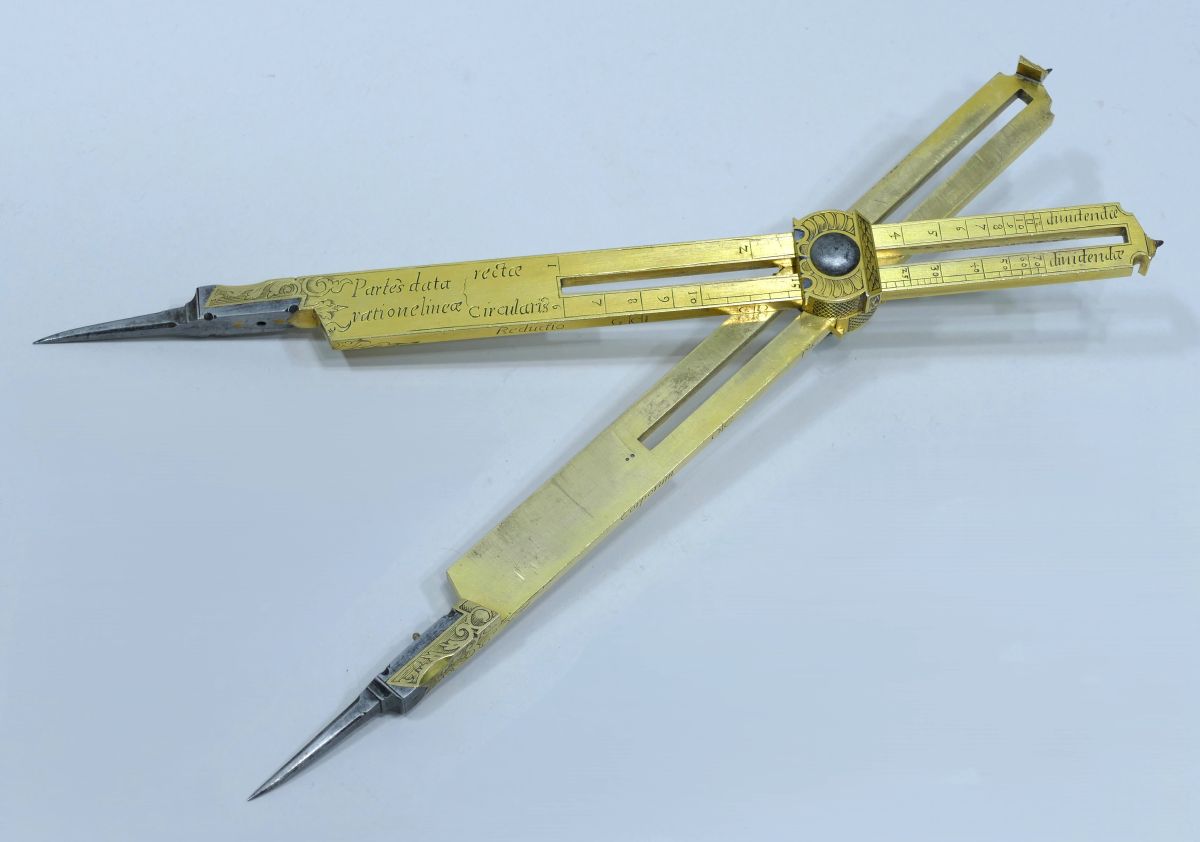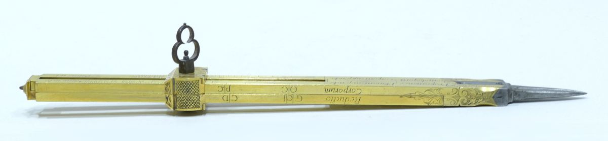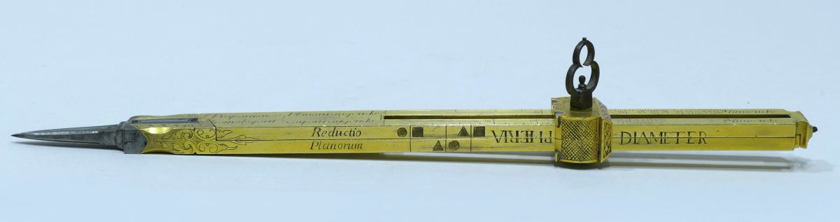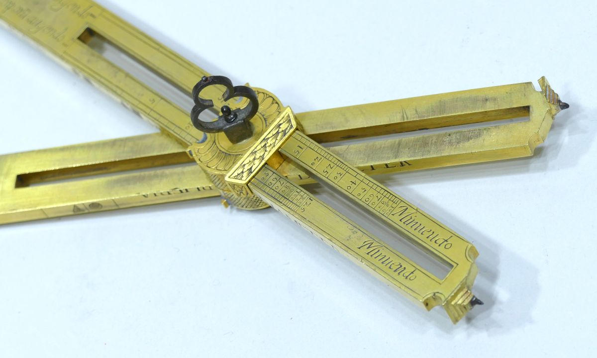 Each arm has two steel points at the ends, one longer than the other, and is engraved with different scales: one arm has two scales marked “Proportiones homologorum / Planorum angendo Minuendo / Corporum angendo Minuendo” (one graduated from 1 to 100 and the other from 1 to 125). The other arm also has two scales marked “Partes data rationelineae / rectae dividendae / Circularis dividendae” (one graduated from 1 to 12 and the other from 6 to 70).