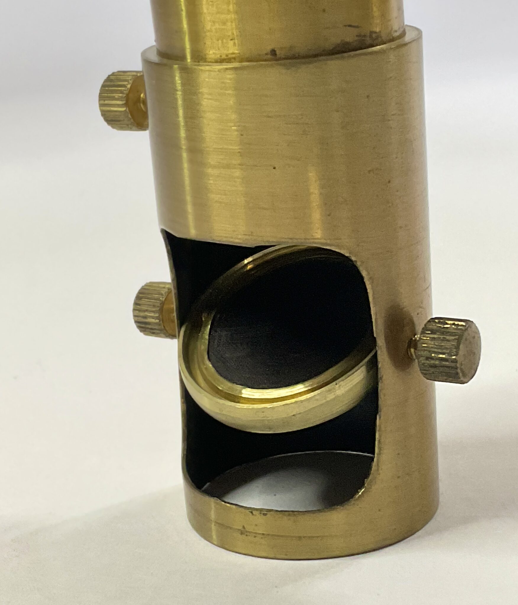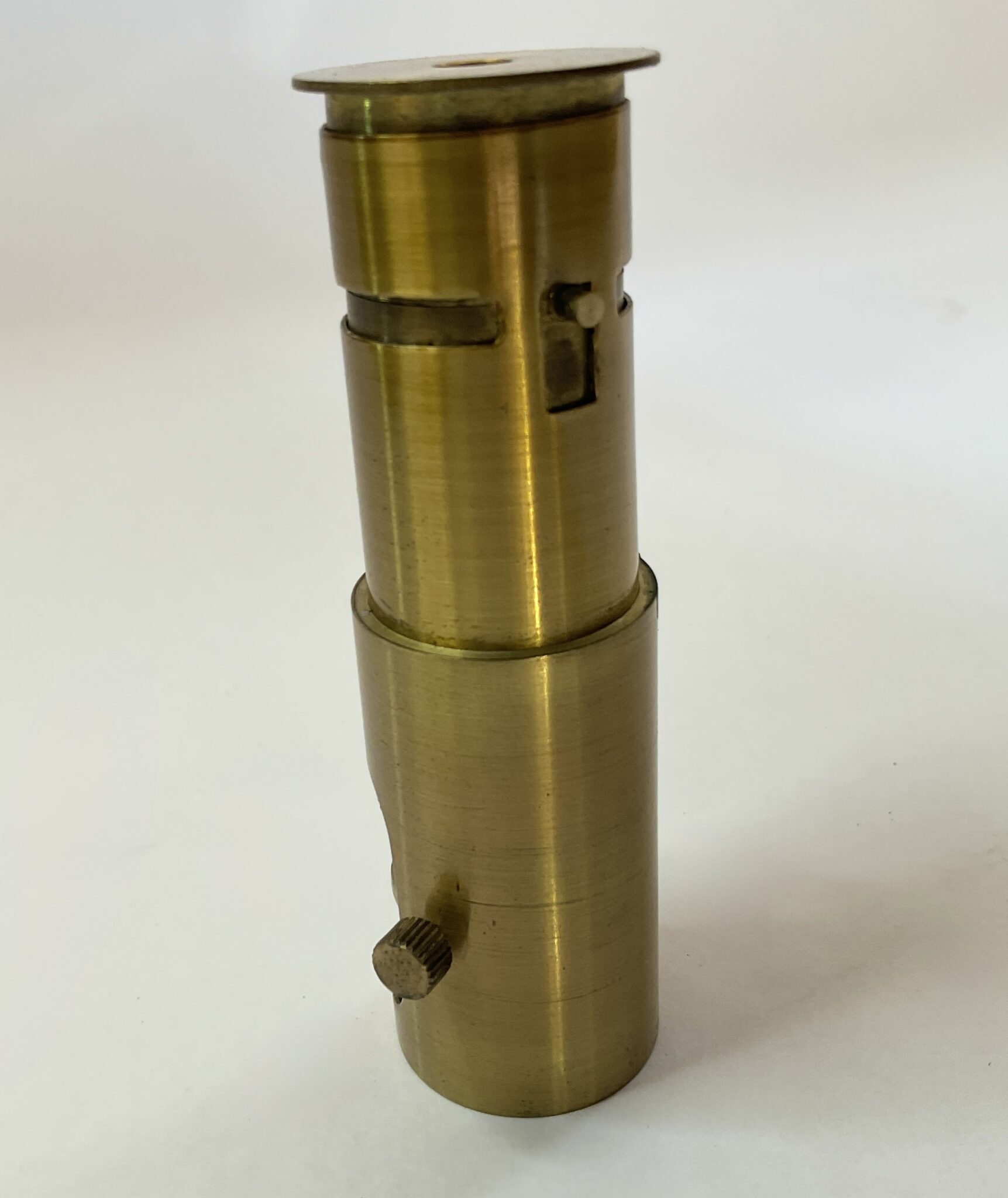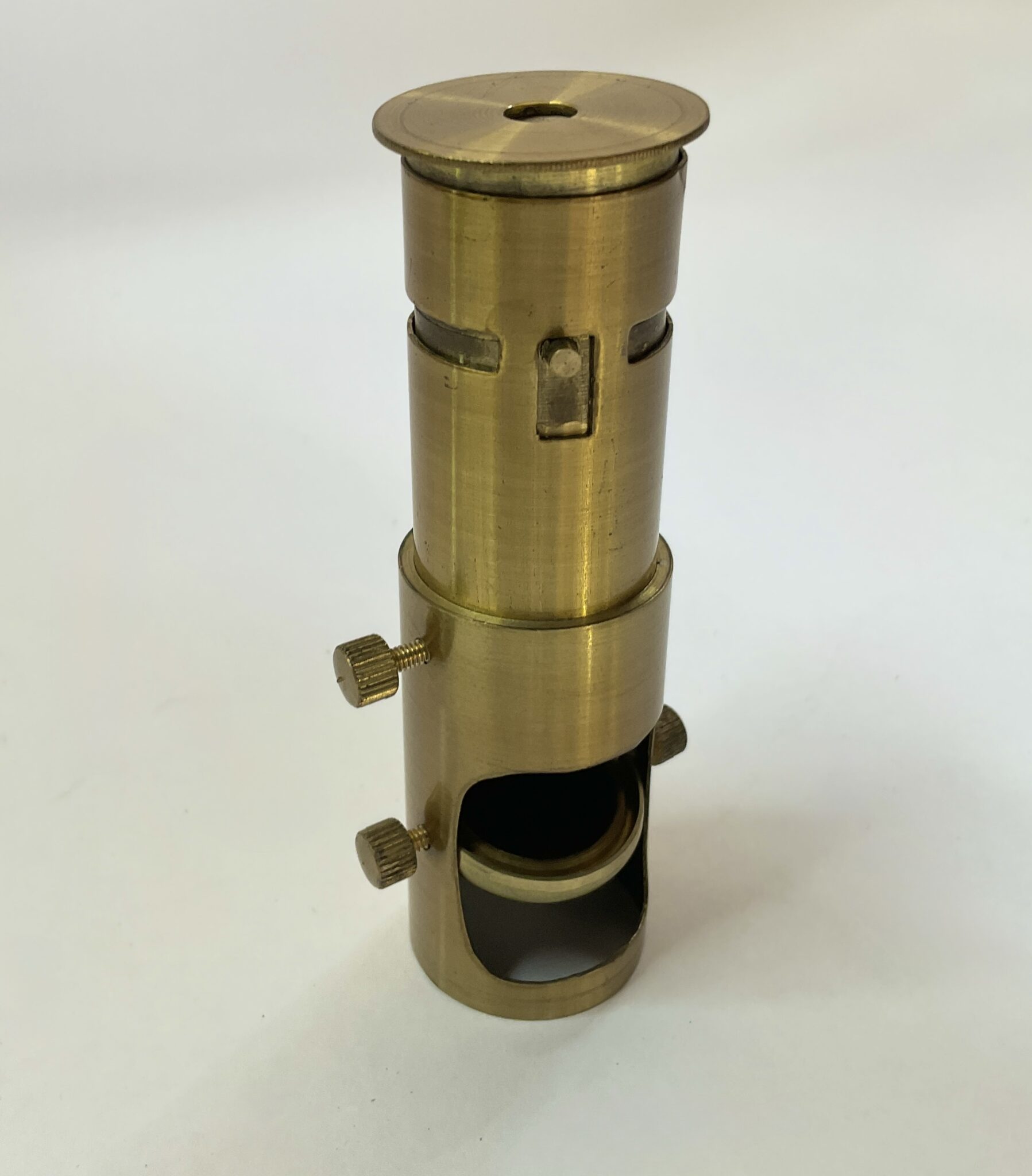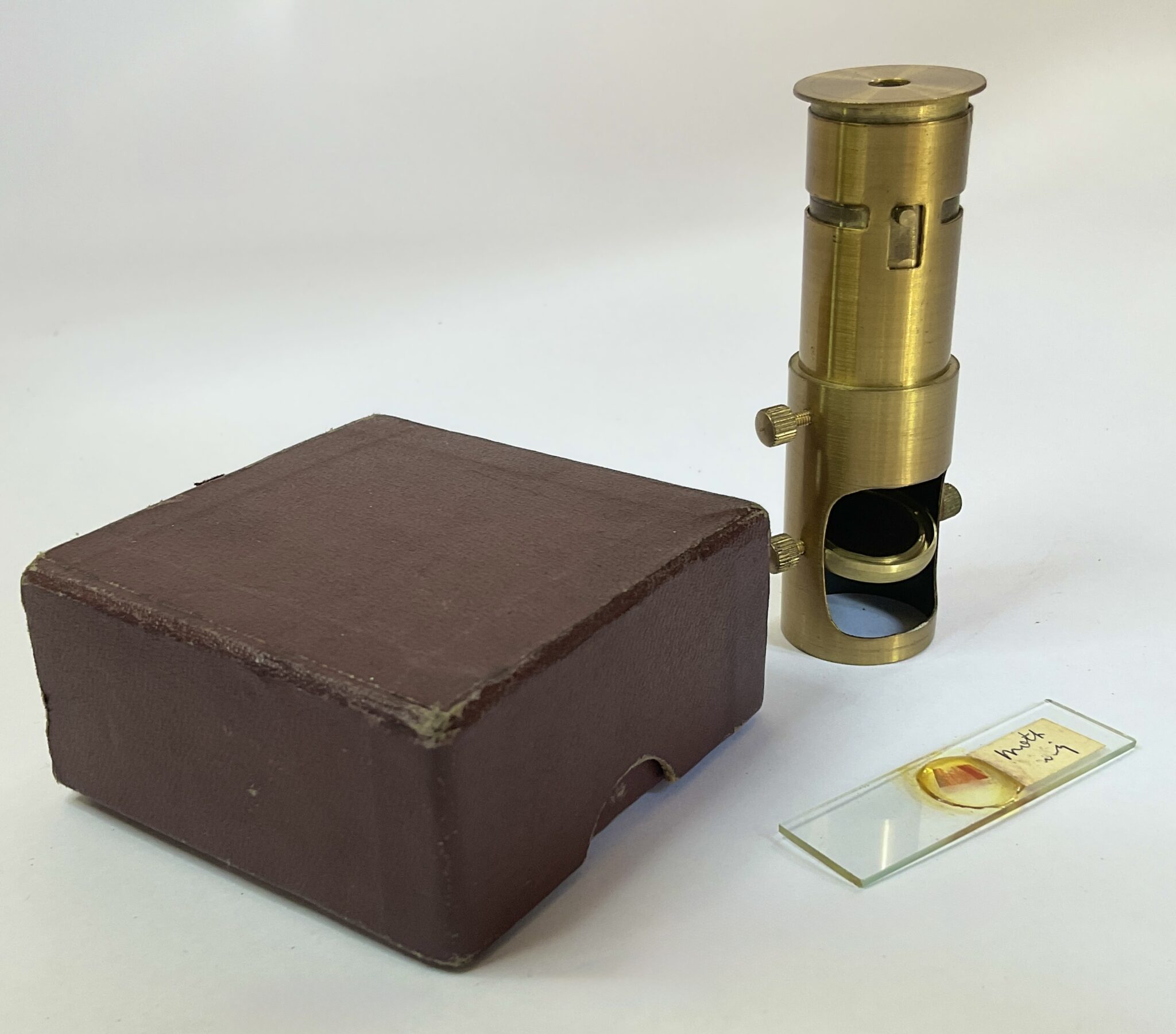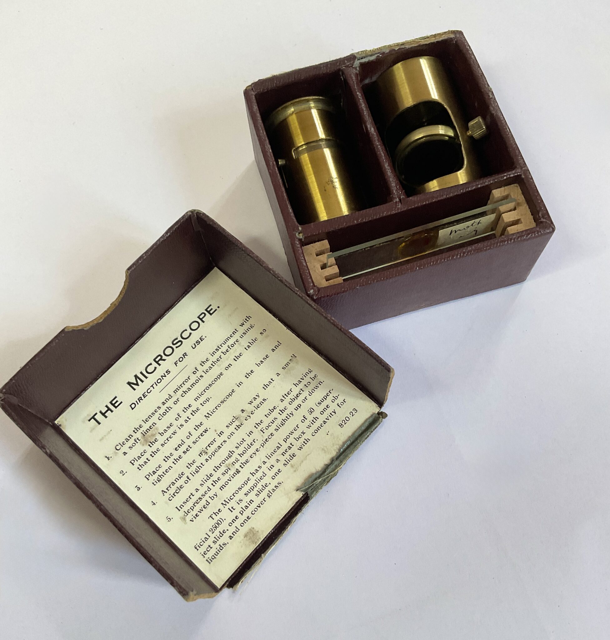 A miniature field microscope which would have been used for educational purposes in the 1920’s or possibly a little later. It comes in two parts which slot together, a sprung mechanism operated by two lugs allows for the slide to be placed below the lens for viewing, the slide included is of a ‘moth wing’. It comes in it’s original box of reinforced cardboard which remains robust however the hinge is broken, the original instructions remain inside the lid. The microscope is in working order.