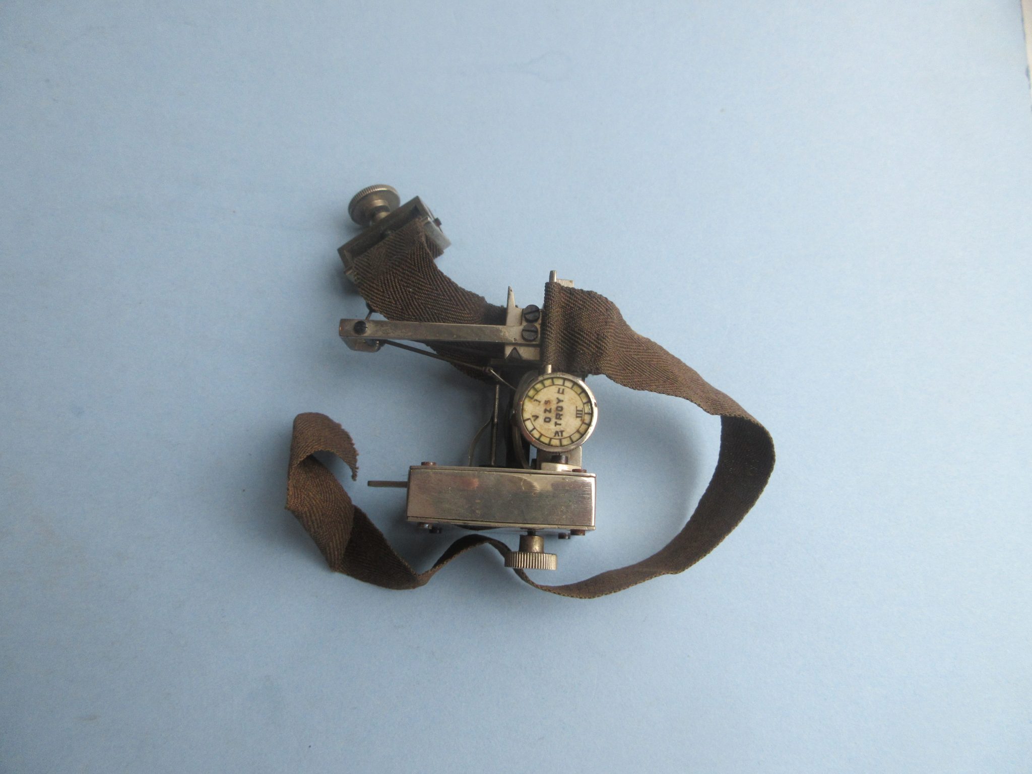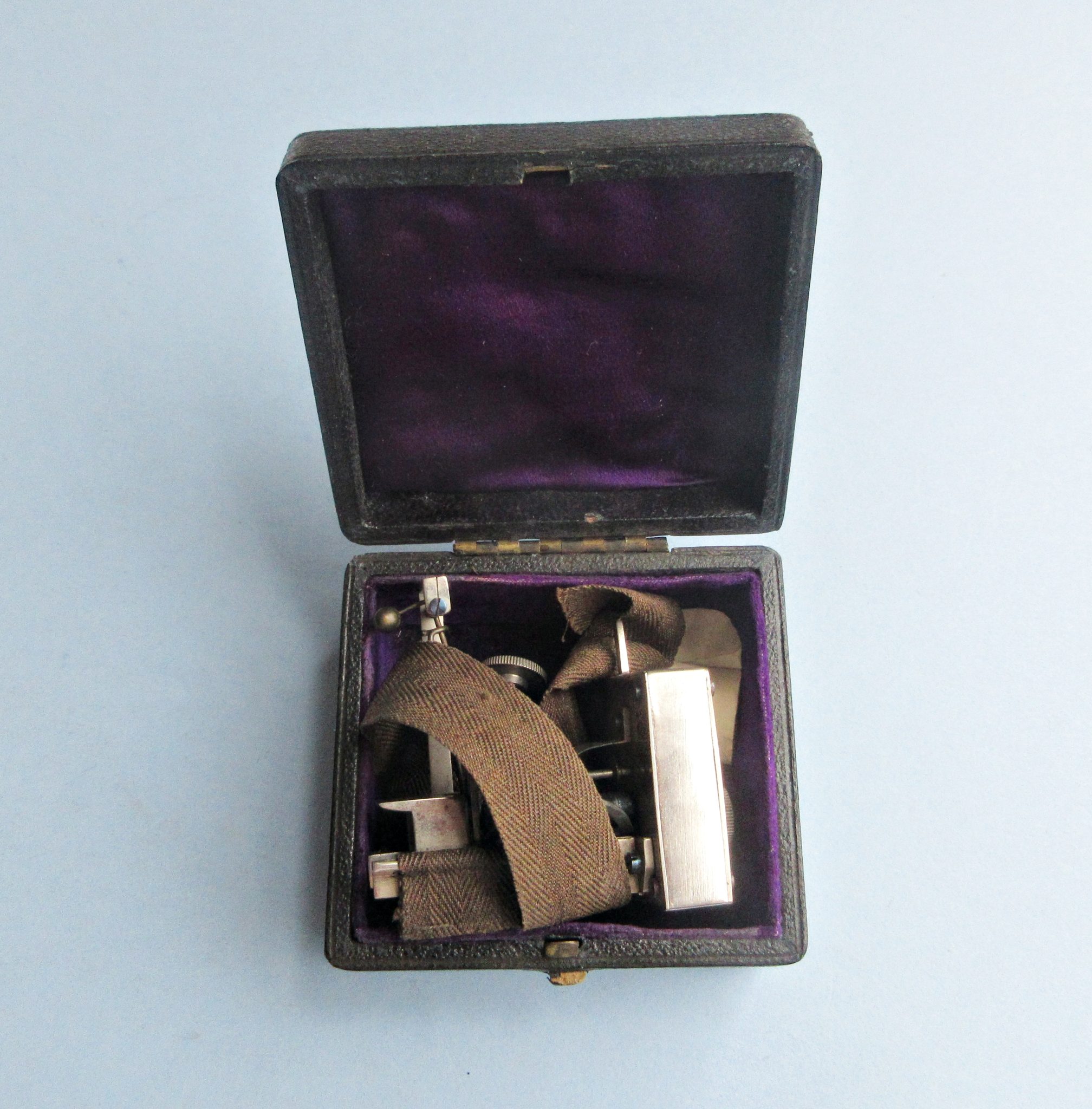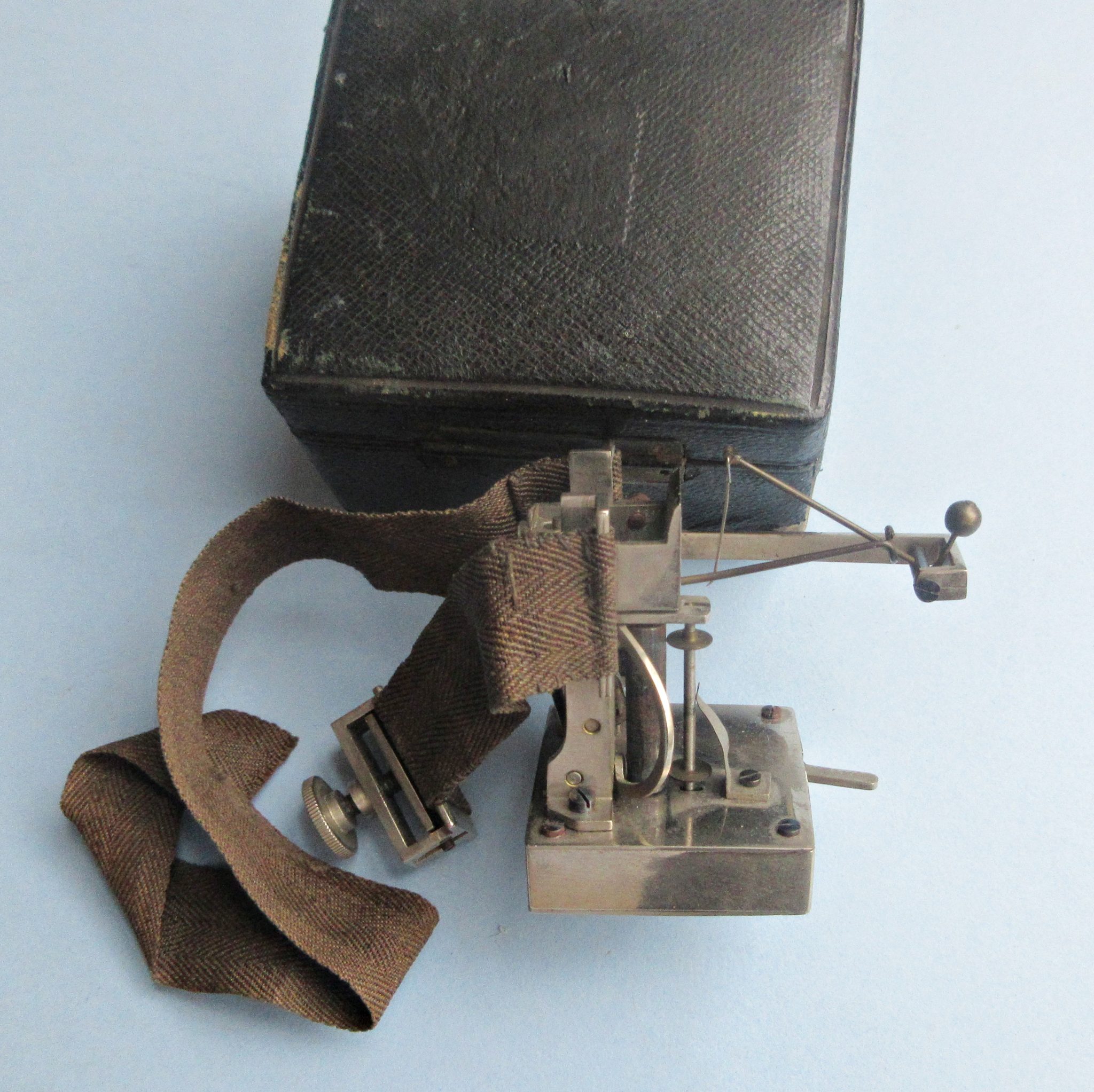 Classic nickle-plated Dudgeon’s sphygmograph with intact clockwork mechanism in a square housing, bone inset tension knob, ribbon strap and pressure sensor and recorder for pulse on smoked paper. No maker evident but it almost certainly English in origin and C1880 in date. Mechanism works well. Case shows some wear. Dimensions of case: 3″ x 2″ x 3″. Wellcome Collection site notes: