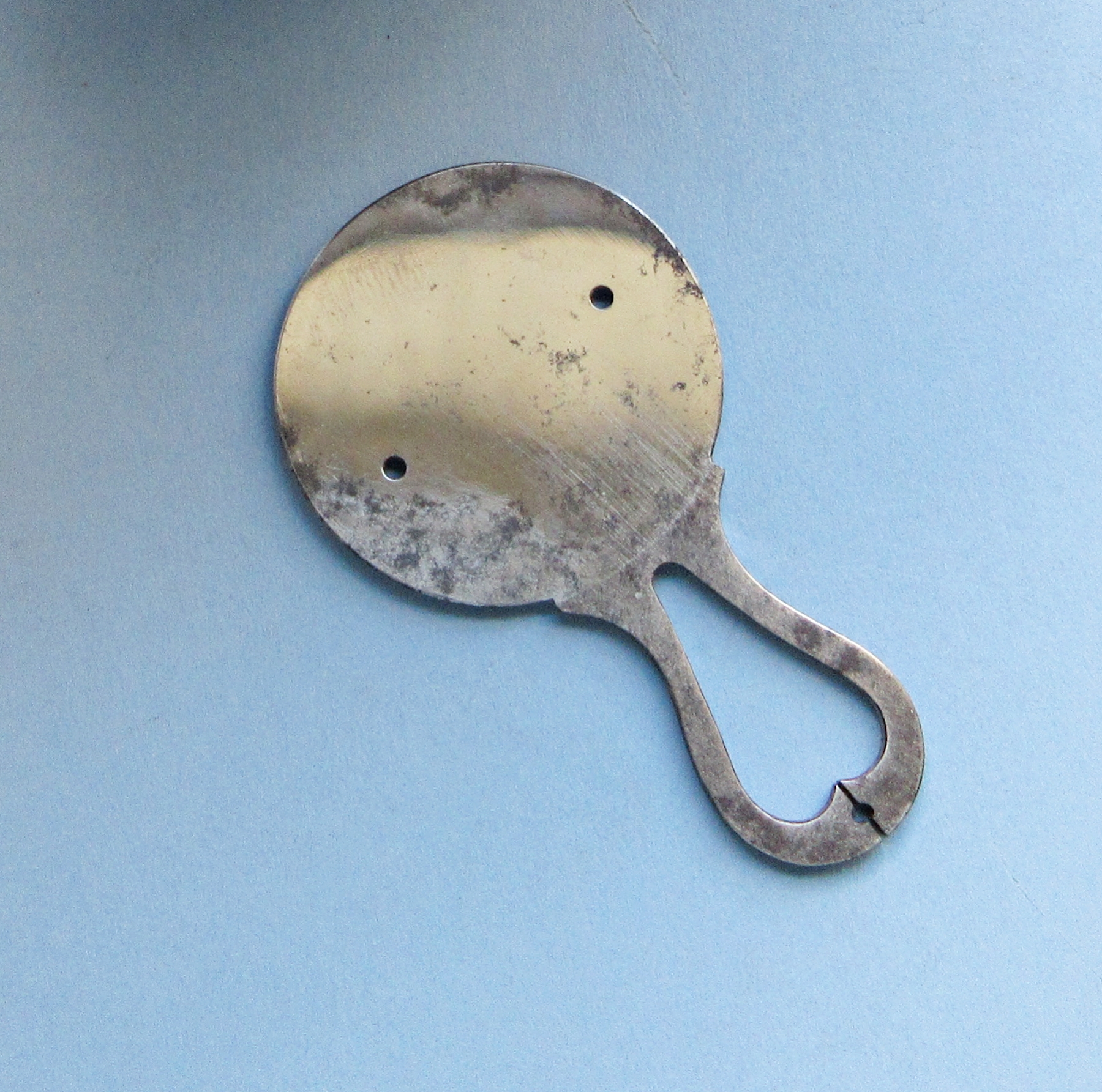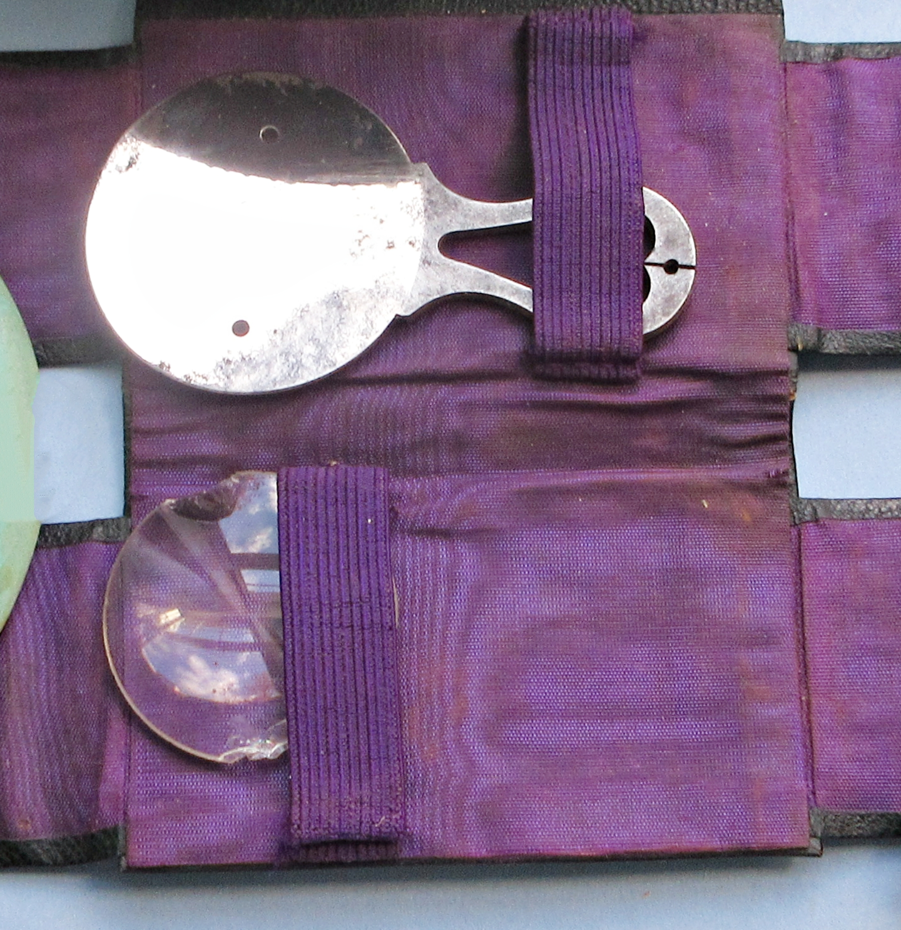 Desmarres’ opthalmoscope was introduced in 1856. Initially it was made bu Lerebours & Secretan and employed a glass mirror. Schett (The Ophthalmoscope, 1996, p. 161) notes that Desmarres was unhappy with the functioning of this model and its cost. He had Charriere produce the second and much more widely adopted model, which employed a polished metal mirror.It has two para-central apertures: one was used for looking at the left eye, the other for the right eye. It lacks the Coccius clip but retain a reversing lens, which is chipped. Length: 3″ or 7.5cm; diameter :1.75″ or 4.4cm. We are offering a good example of the second model in its original case. Desmarres’ ophthalmoscopes do not turn up often!
