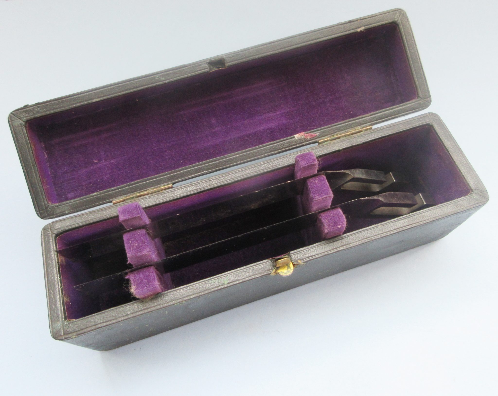 A good cased pair of steel microtomes buy Charles Frank, working in Glasgow, c1920. Length of the very sharp blades: 4.5″. Overall condition very good, noting some tiny chips on one blade and a couple of minor spots of corrosion. No rust.