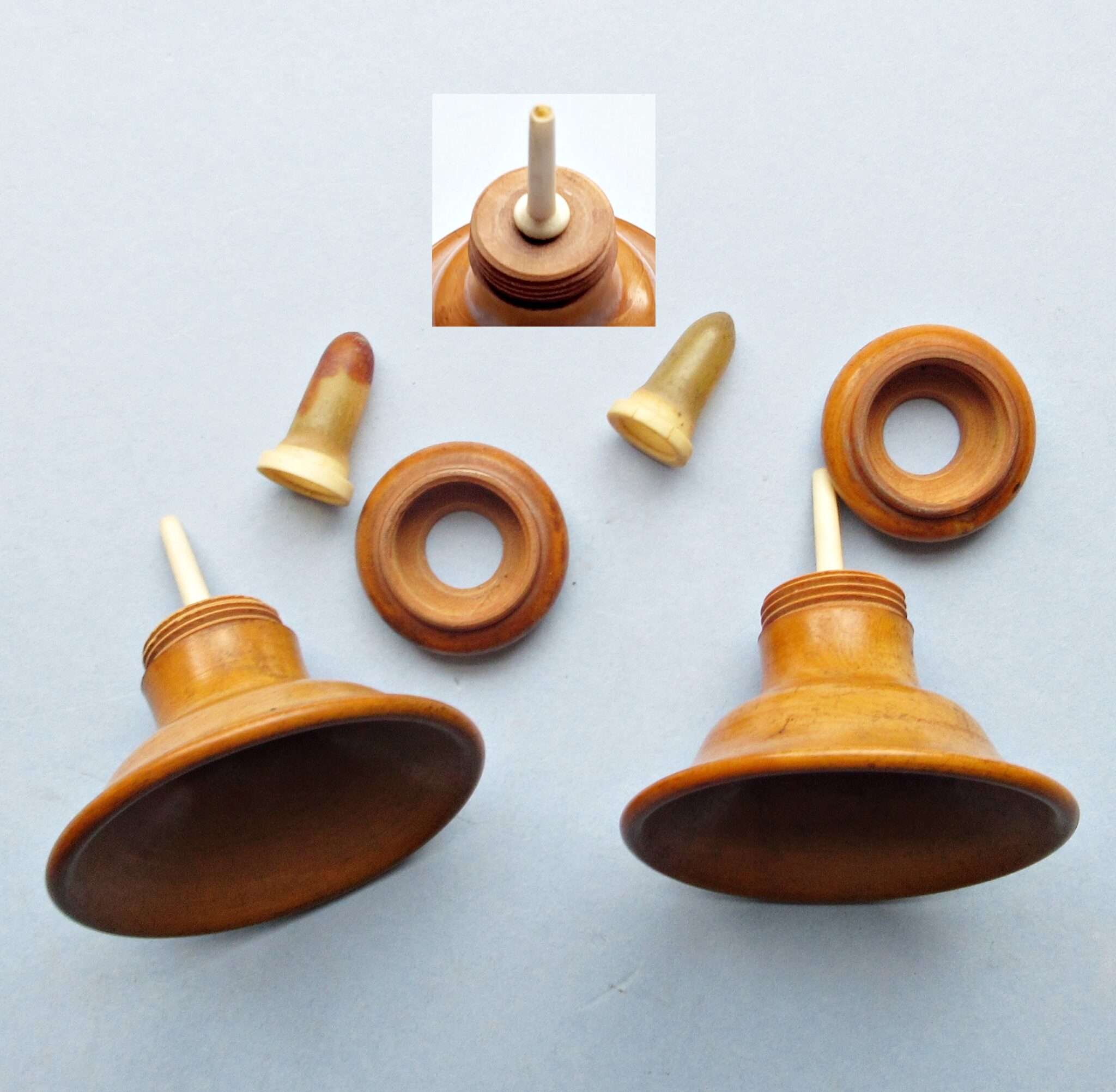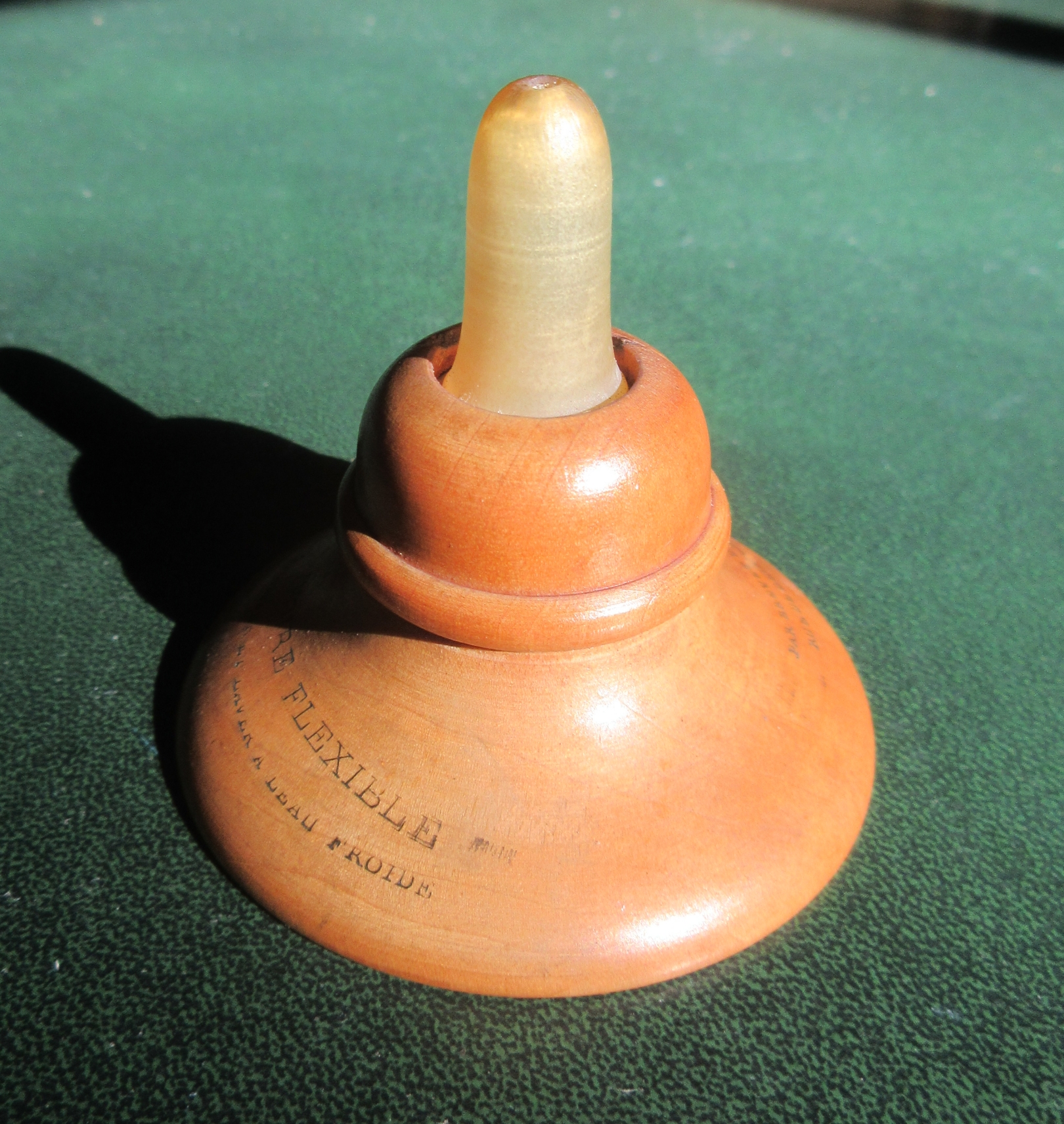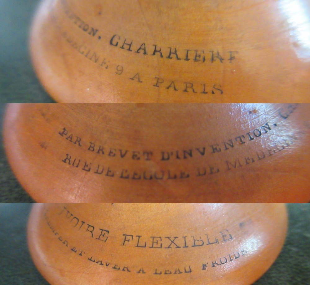 A pair of boxwood nipple shields with flexible ivory nipples. When we acquired the shields, our assumption was that the nipples were rubber that miraculously had not deteriorated over time. A colleague brought to our attention a similar pair in his collection that were marked “IVOIRE FLEXIBLE”, using a process that had been patented by Charriere, and indicated that they should be soaked and washed in cold water, presumably after use–see last image. We’ve not been able to establish a date for this patent. The pair we are offering are not marked but may well be a product of the Charriere workshop An AI search yielded the following: