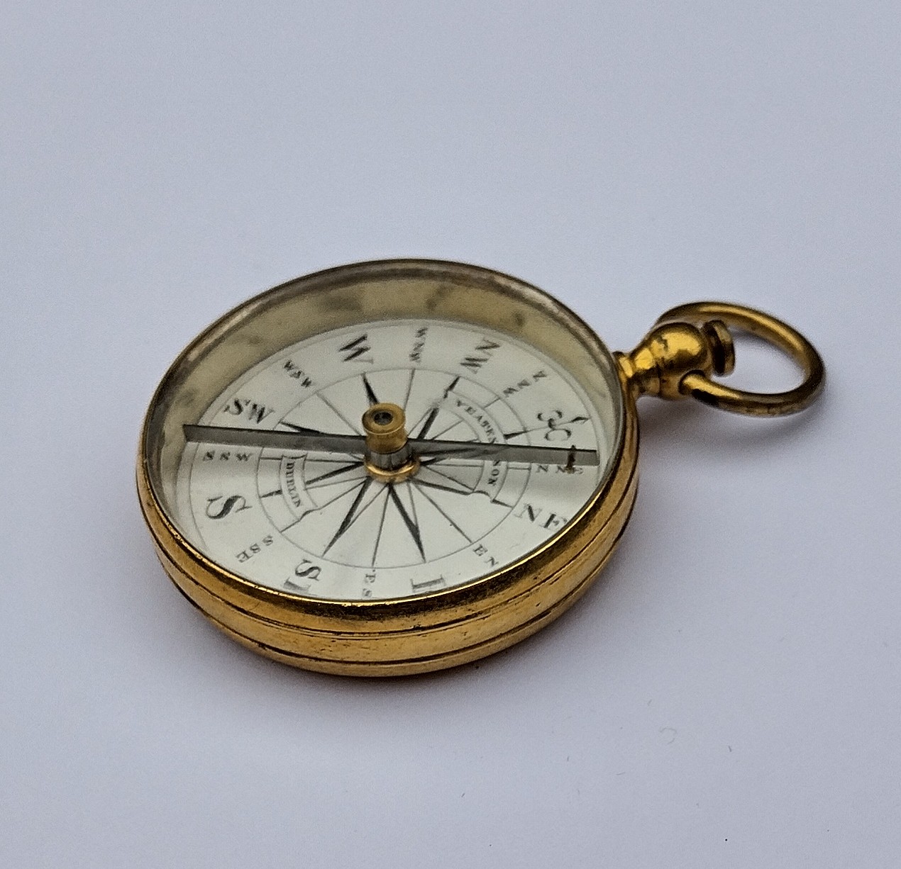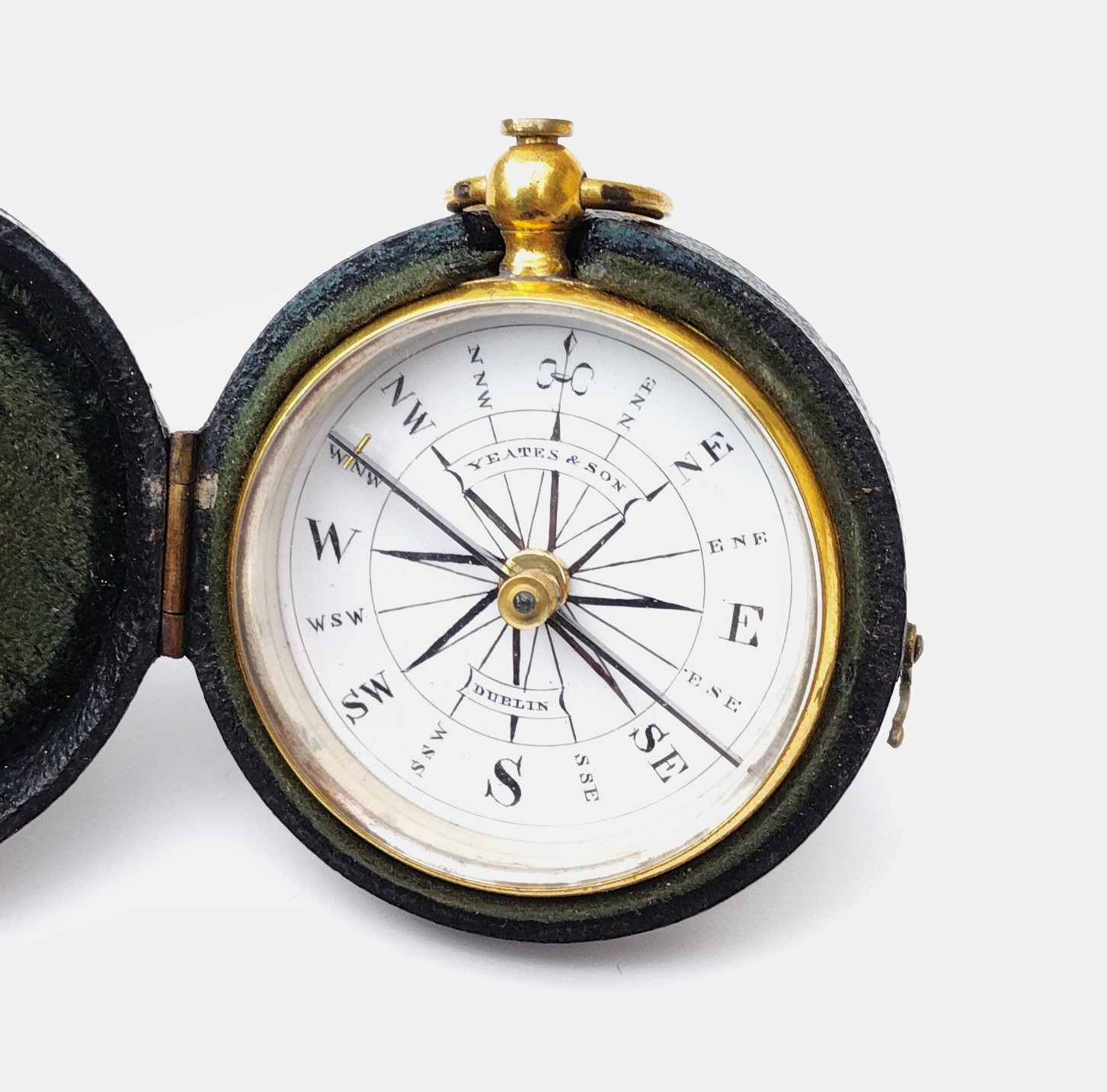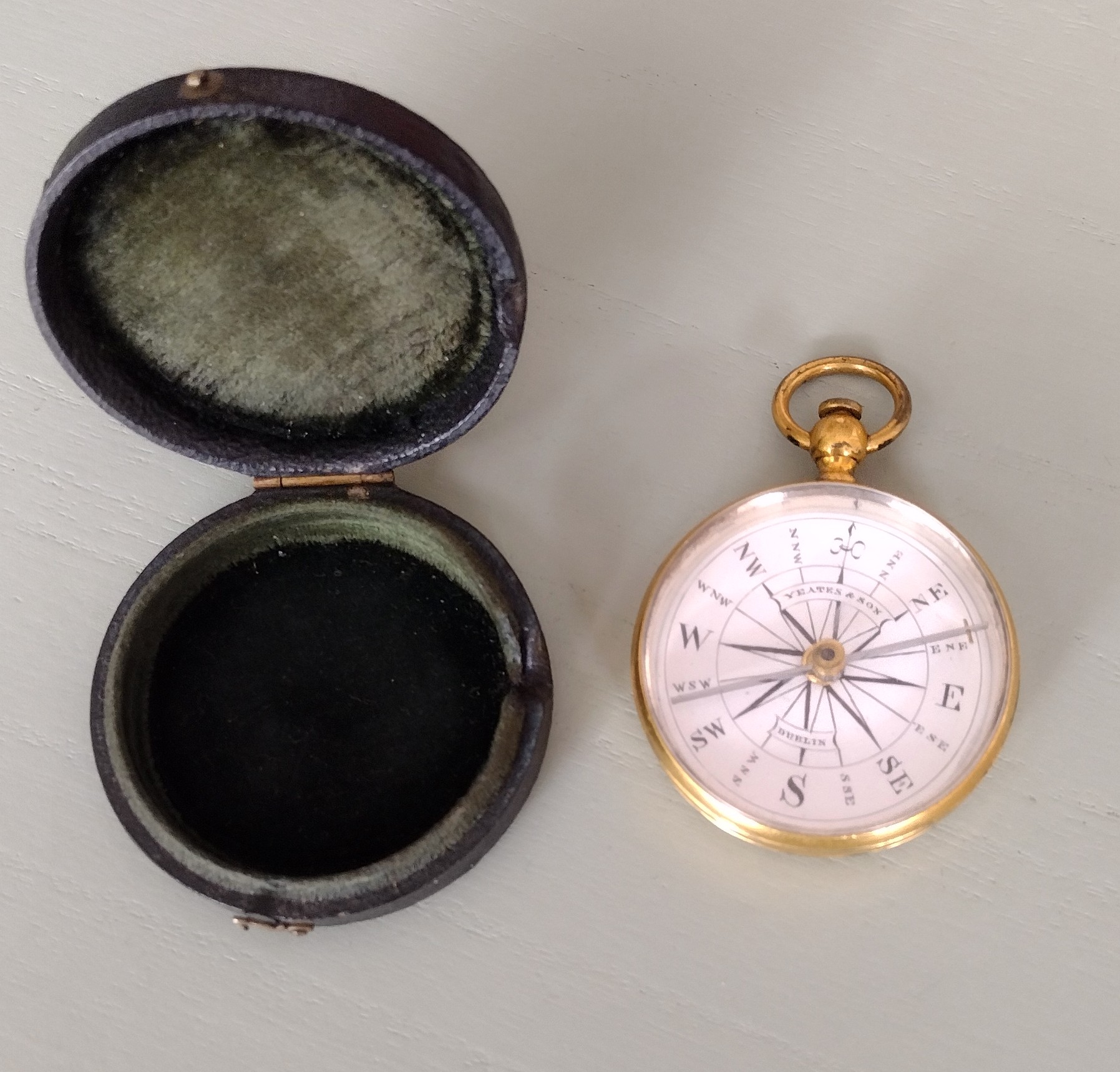 SOLD – A very nice gilt case compass in a leather case signed, ‘Yeates & Son, Dublin’ on the porcelain dial. The needle is locked by pushing the button to the top (pull out to free the needle).