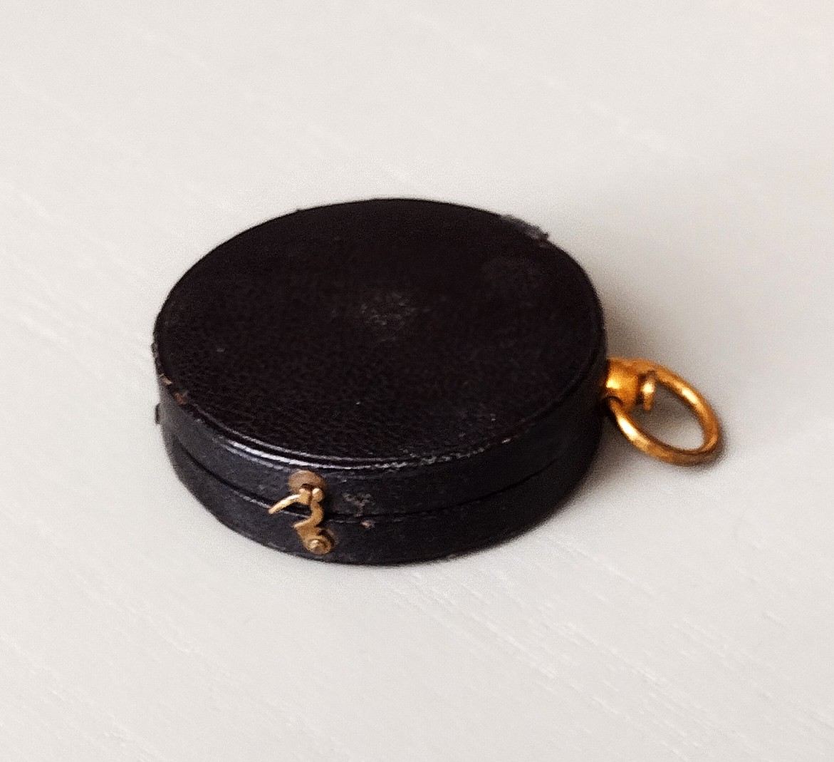 The compass measures 40 mm across and is contained in its felt line leather case with fastening hook.