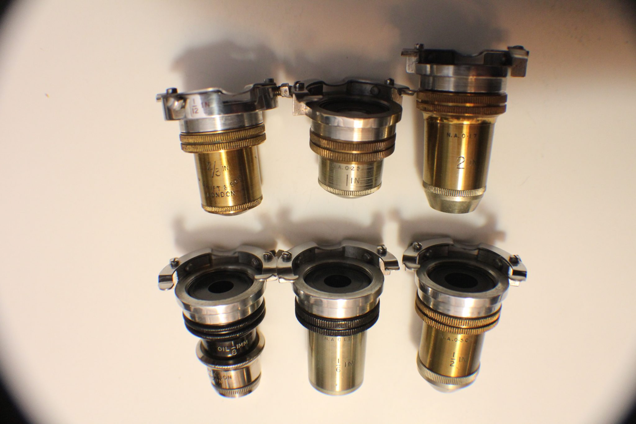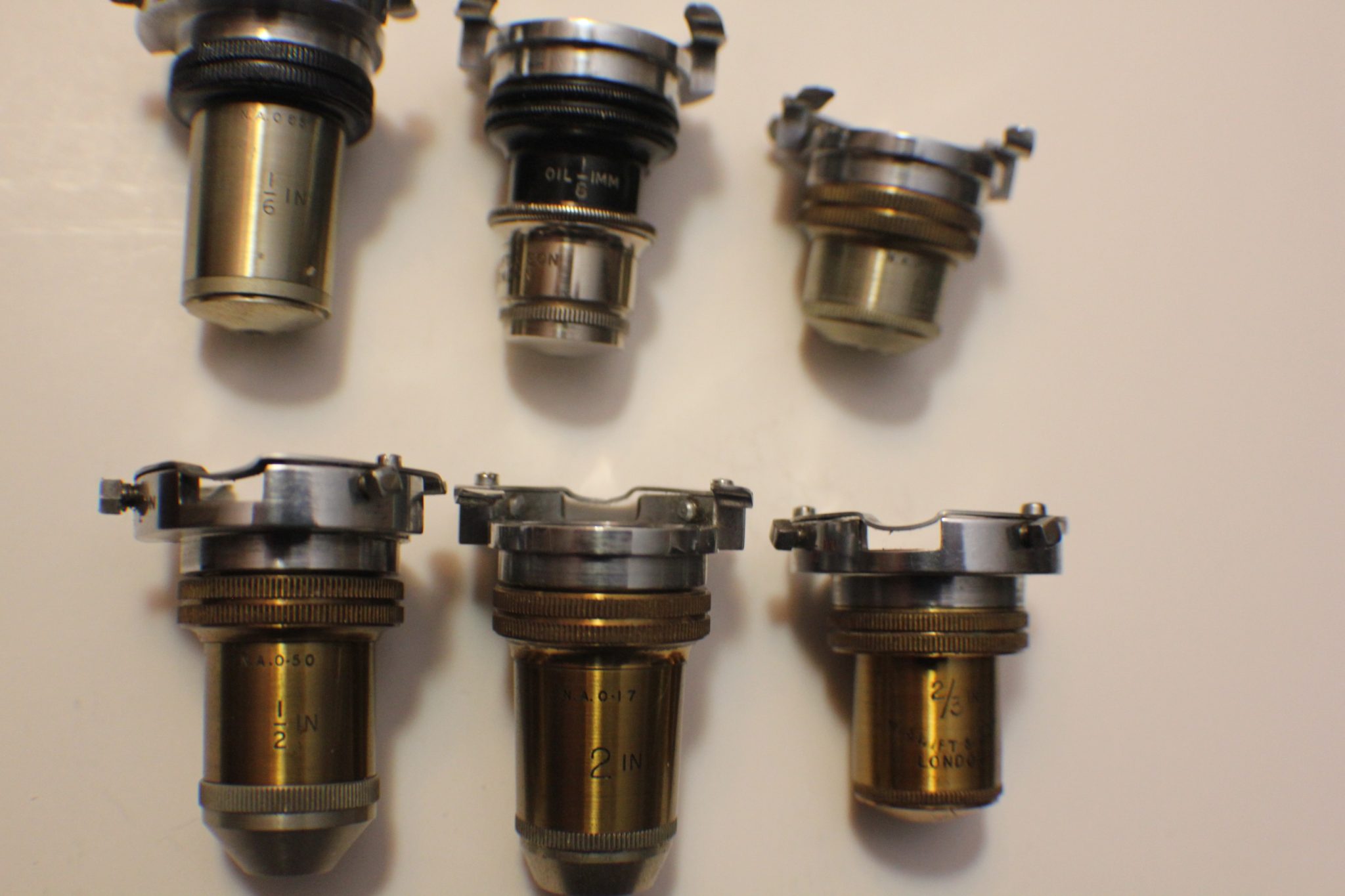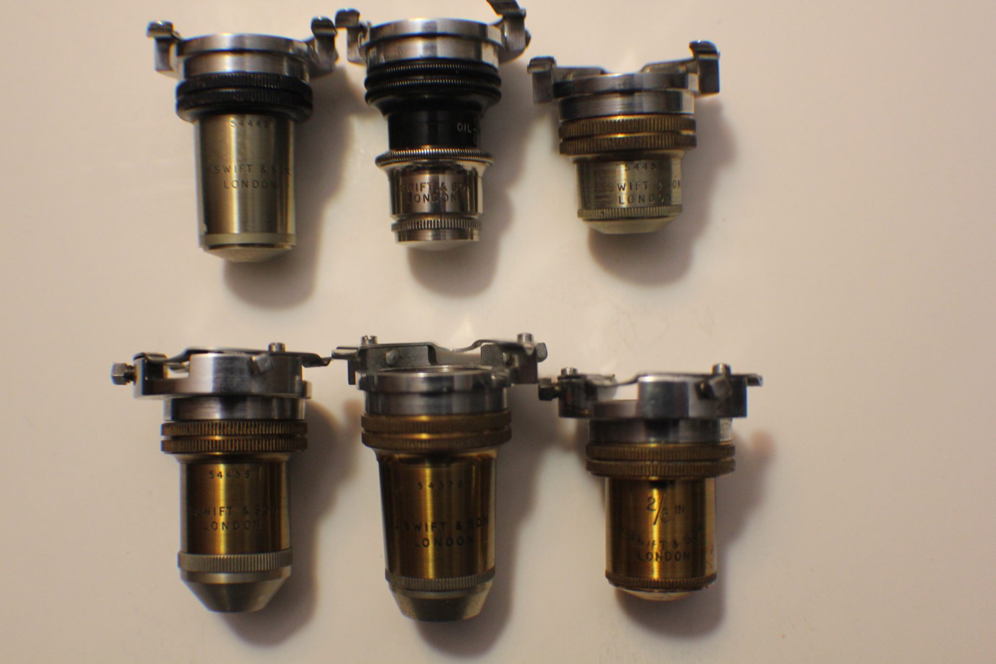 The objectives (of various age) are 2 inch, 1 inch, 2/3 inch, 1/2 inch, 1/6 inch and 1/8 Oil Immersion in two parts. Excellent condition. Rarely used. The objectives require a specialized nosepiece adapter often with a spring loaded bayonet quick changer. All signed Swift and Son. Boxed with two wrenches.