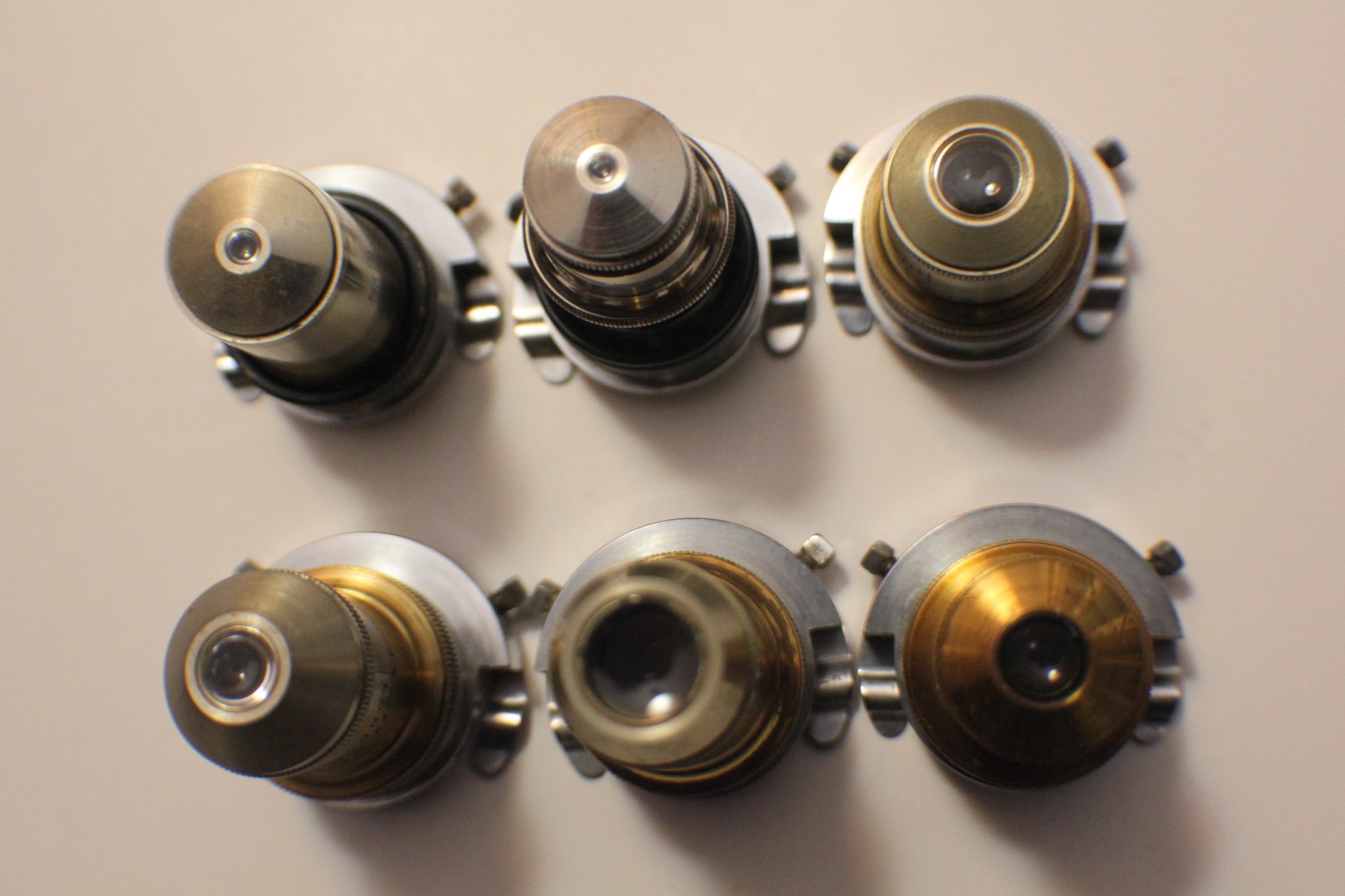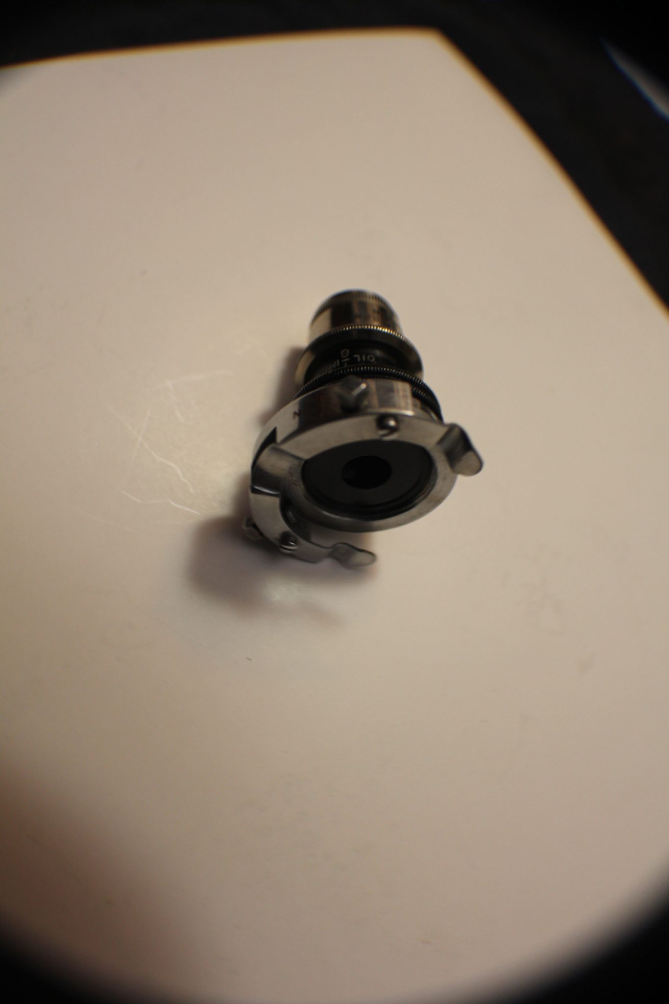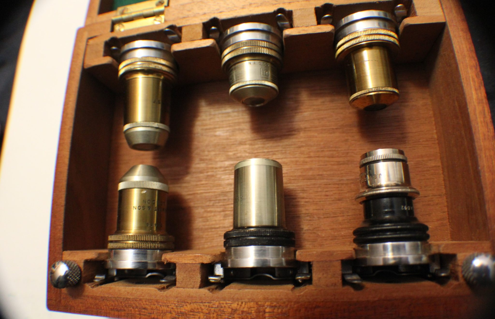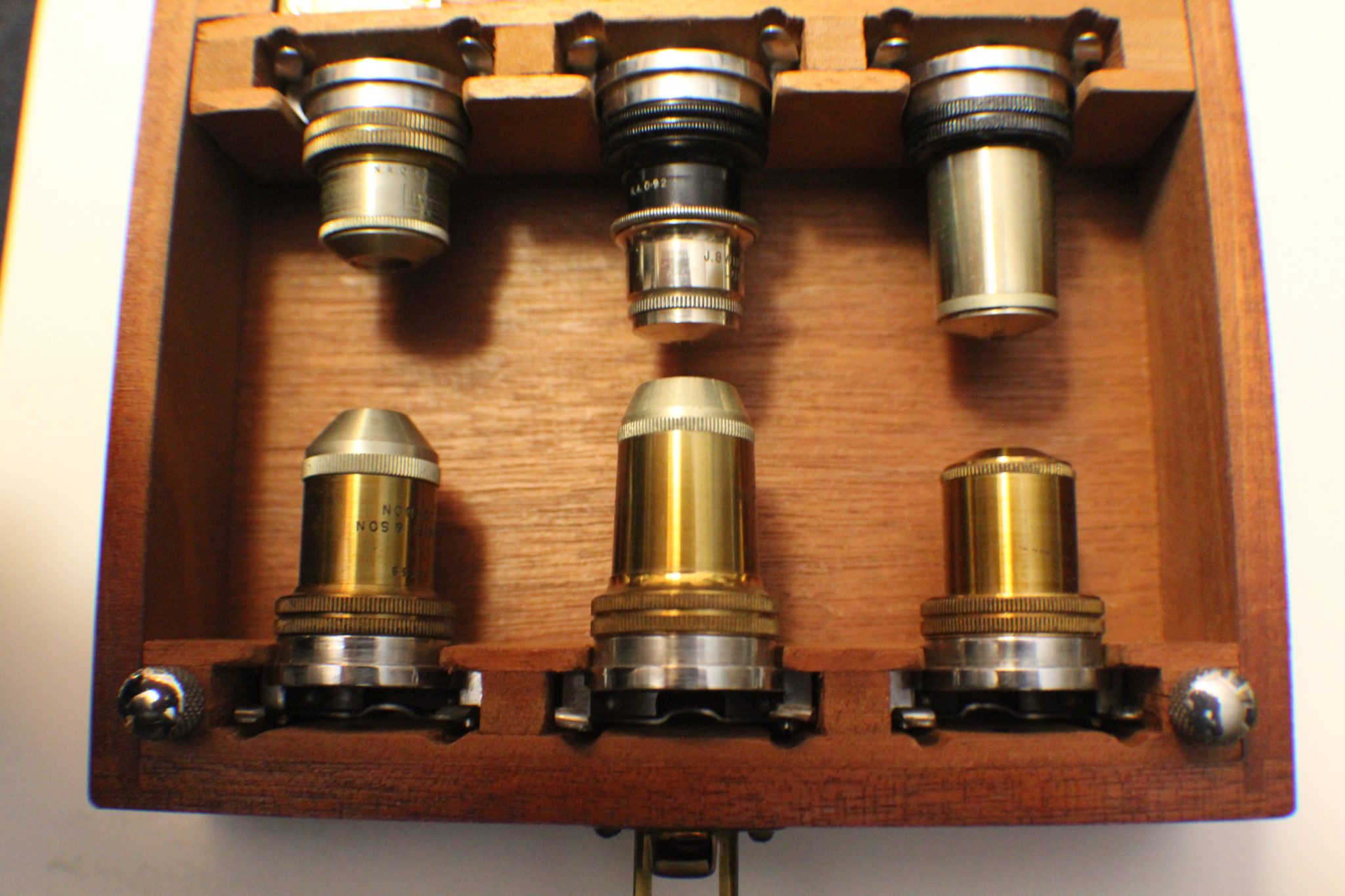 The objectives (of various age) are 2 inch, 1 inch, 2/3 inch, 1/2 inch, 1/6 inch and 1/8 Oil Immersion in two parts. Excellent condition. Rarely used. The objectives require a specialized nosepiece adapter often with a spring loaded bayonet quick changer. All signed Swift and Son. Boxed with two wrenches.