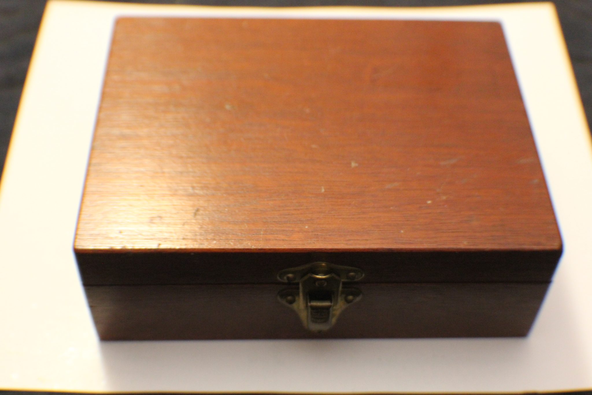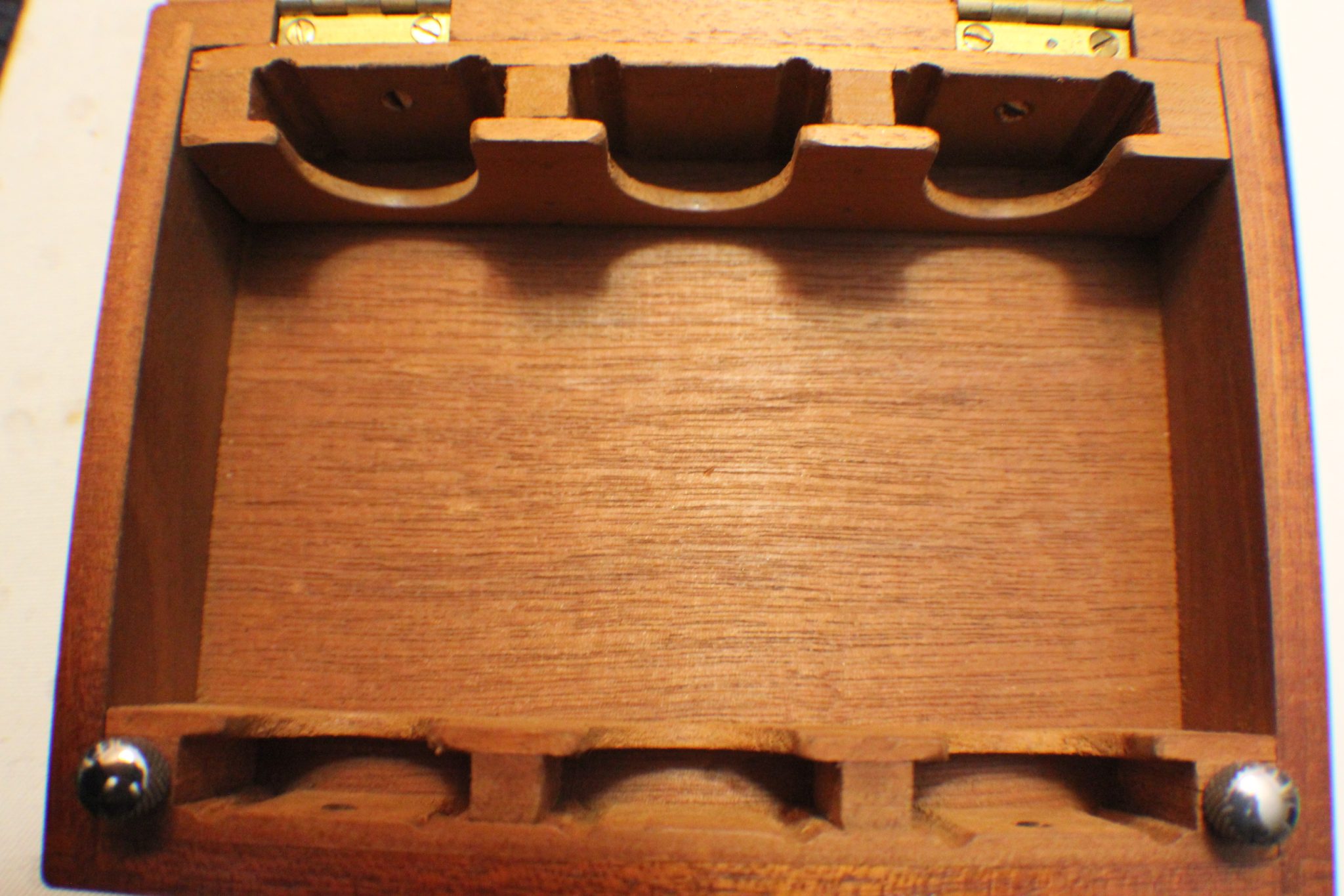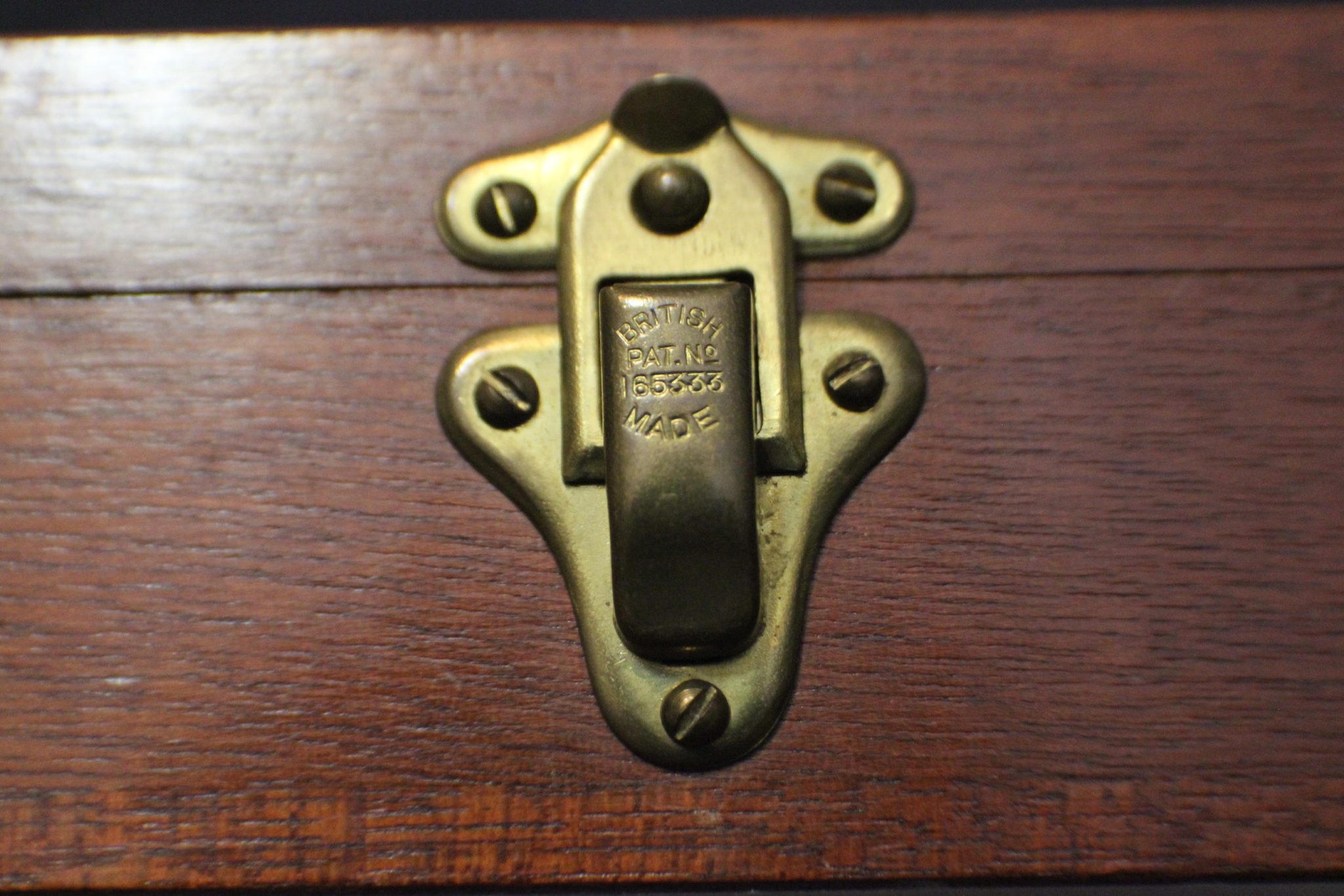 Mahogany case is marked British made and patented by Swift and measures 15 x 10 x 5 cm. (6 x 4 x 2 inches).