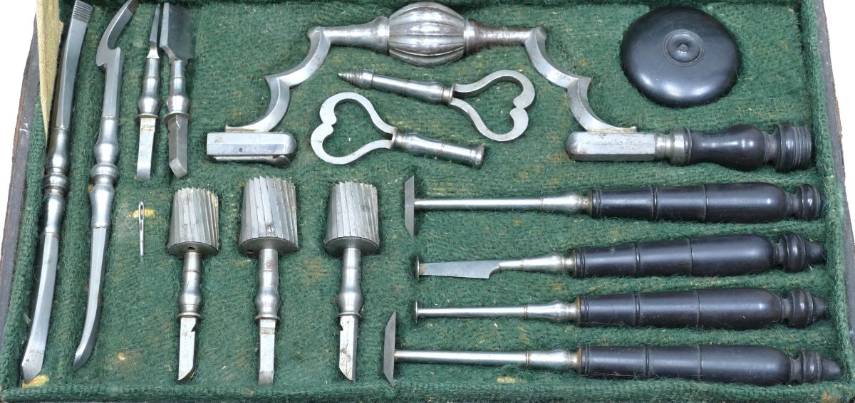 Complete trepanation case with 14 instruments (scalpel, scrapers, elevators, crank, drills,