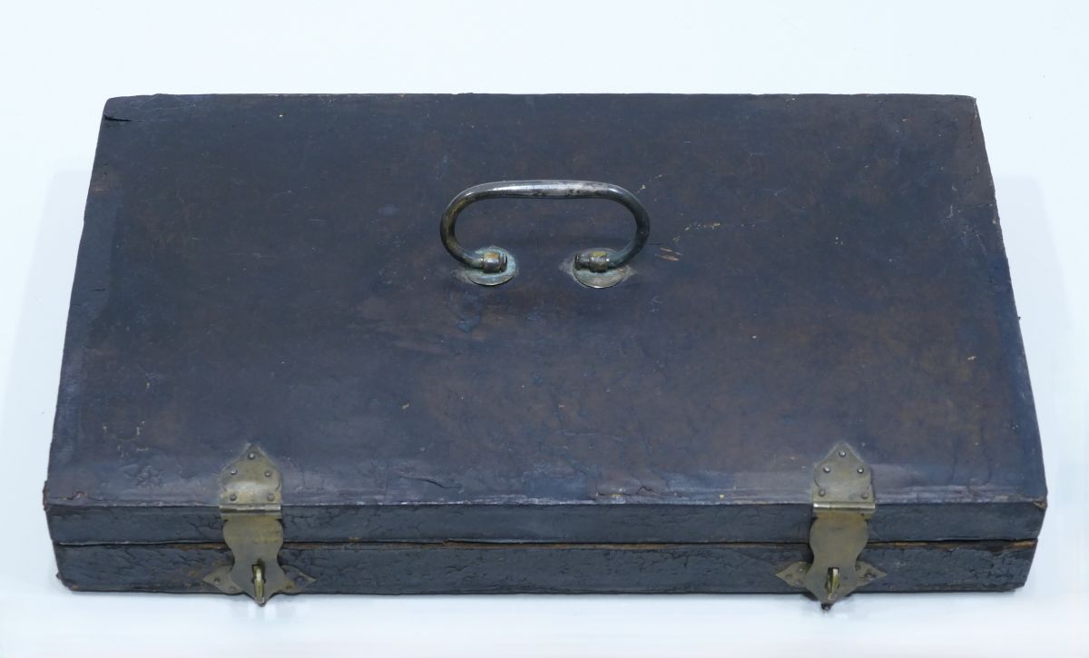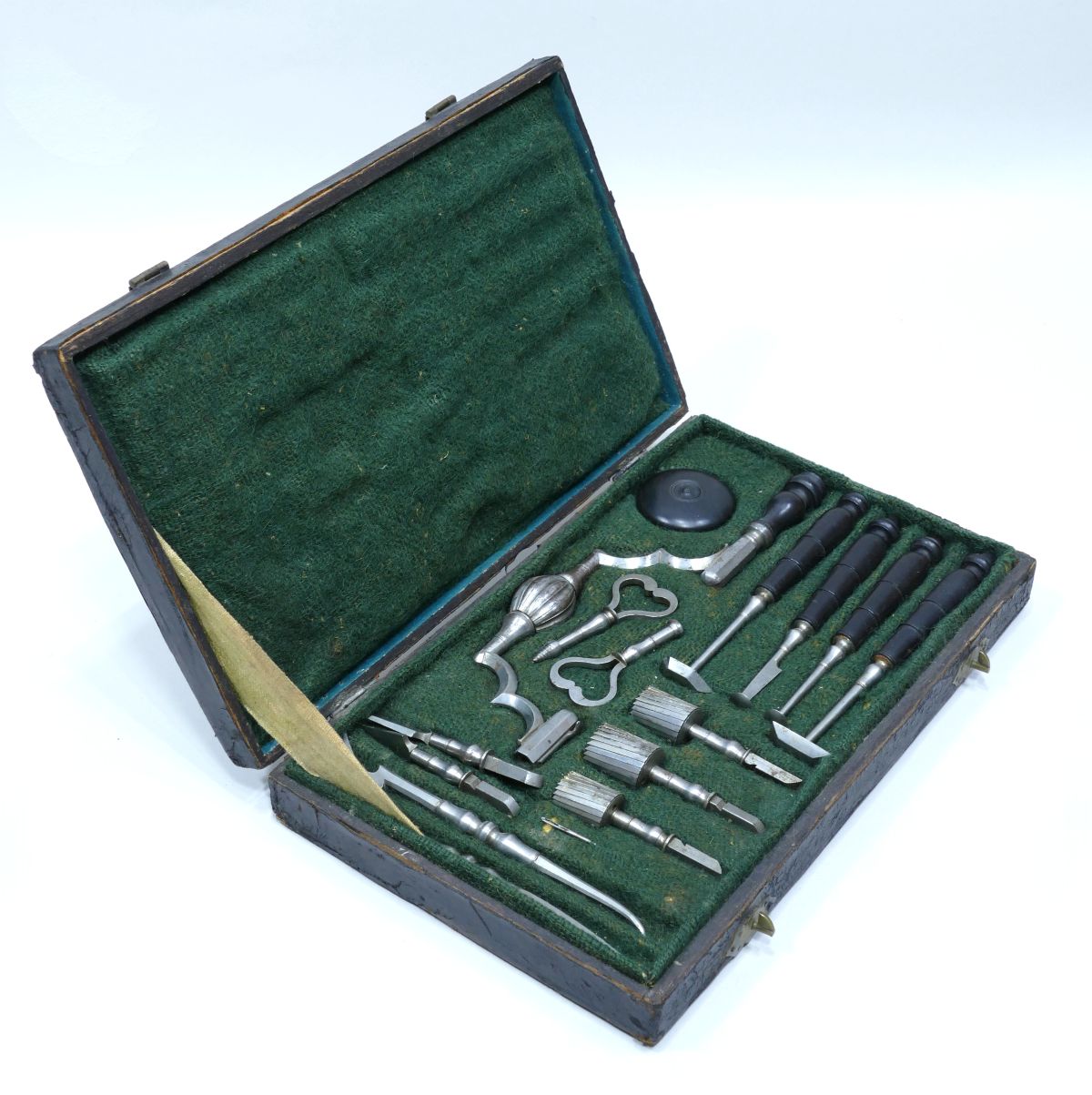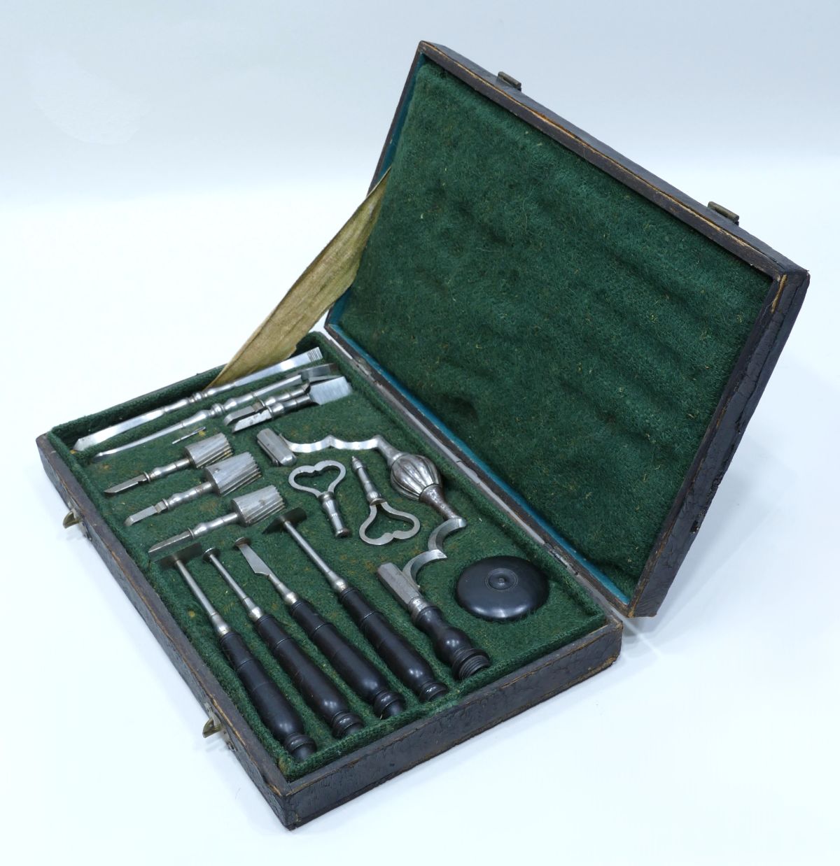 trephines, needle). The case is covered in leather with a handle and brass hooks, and has a green