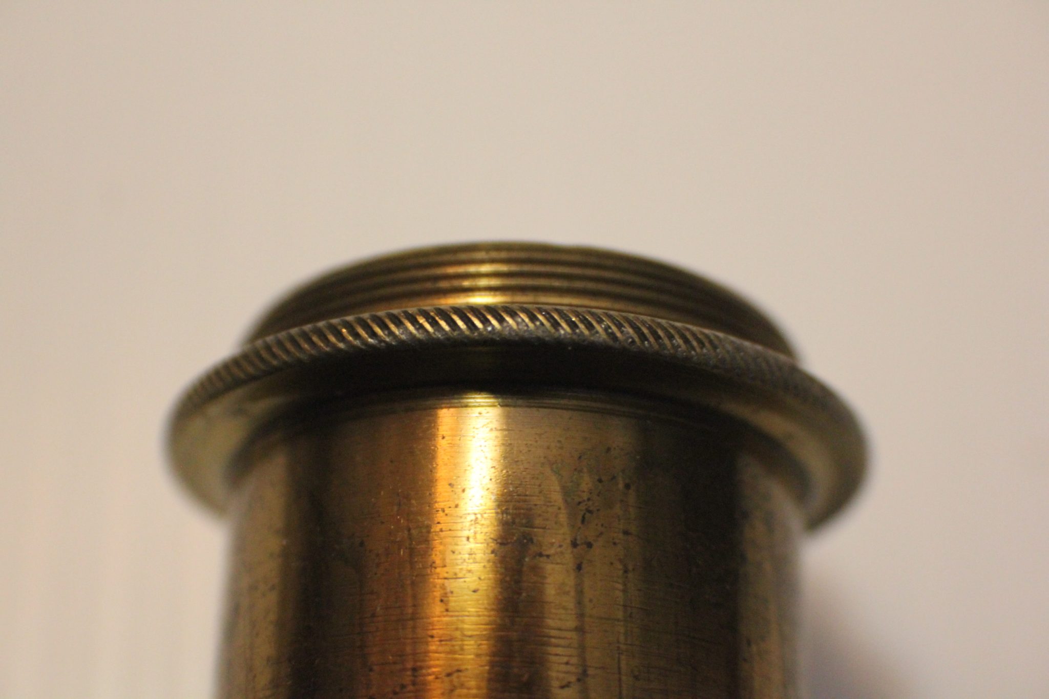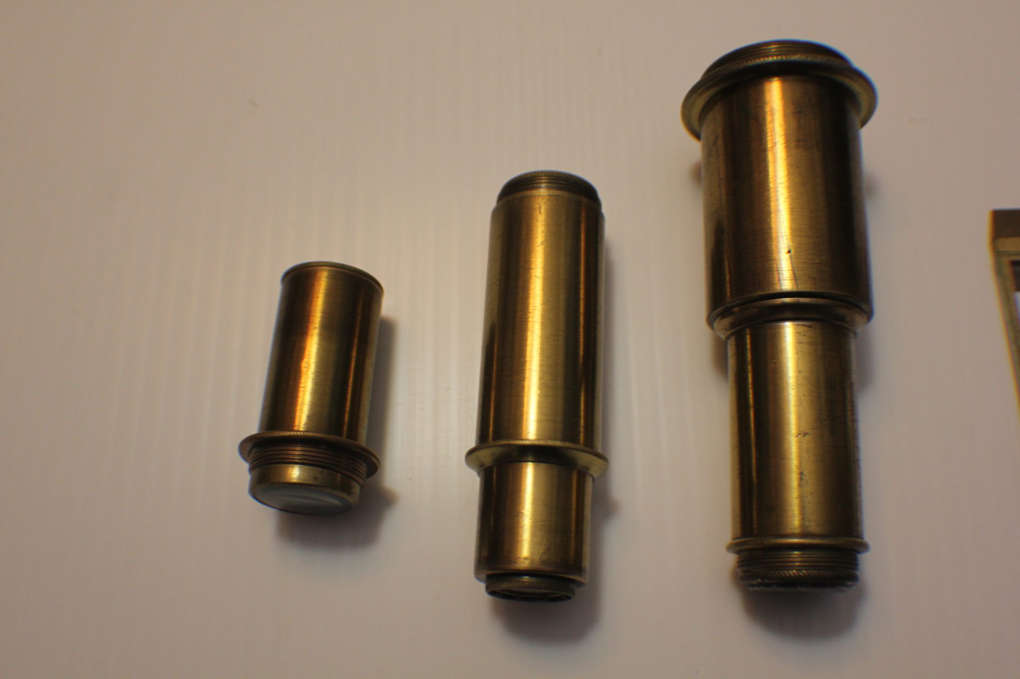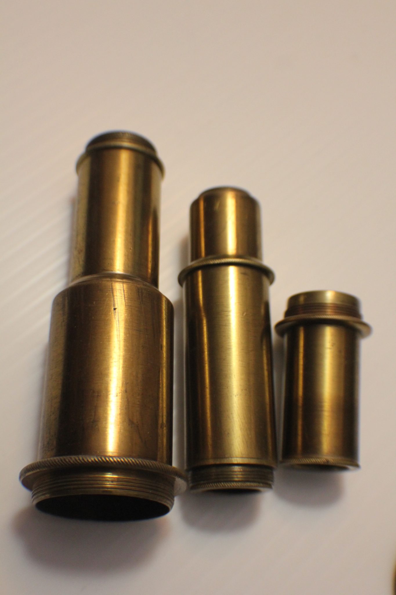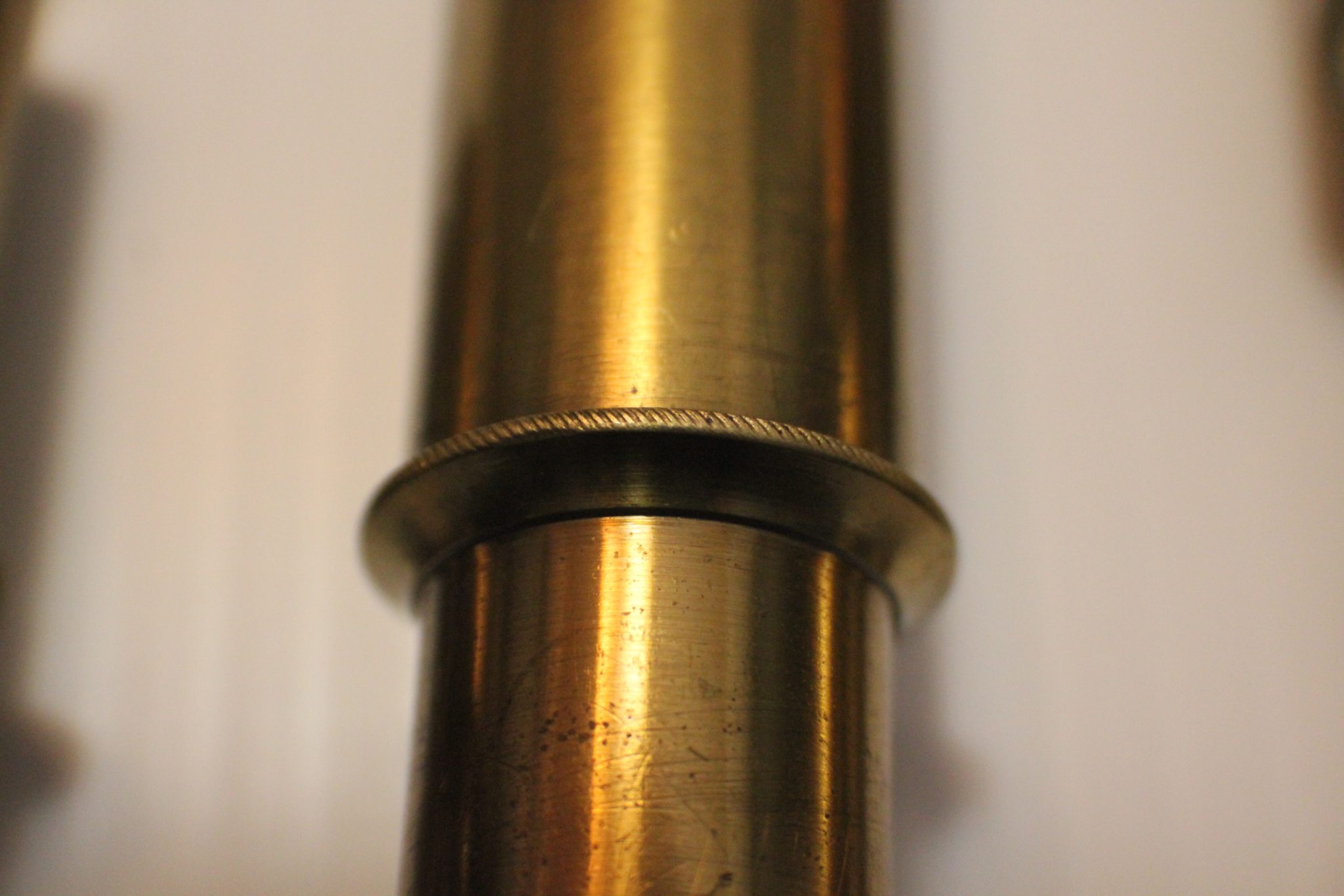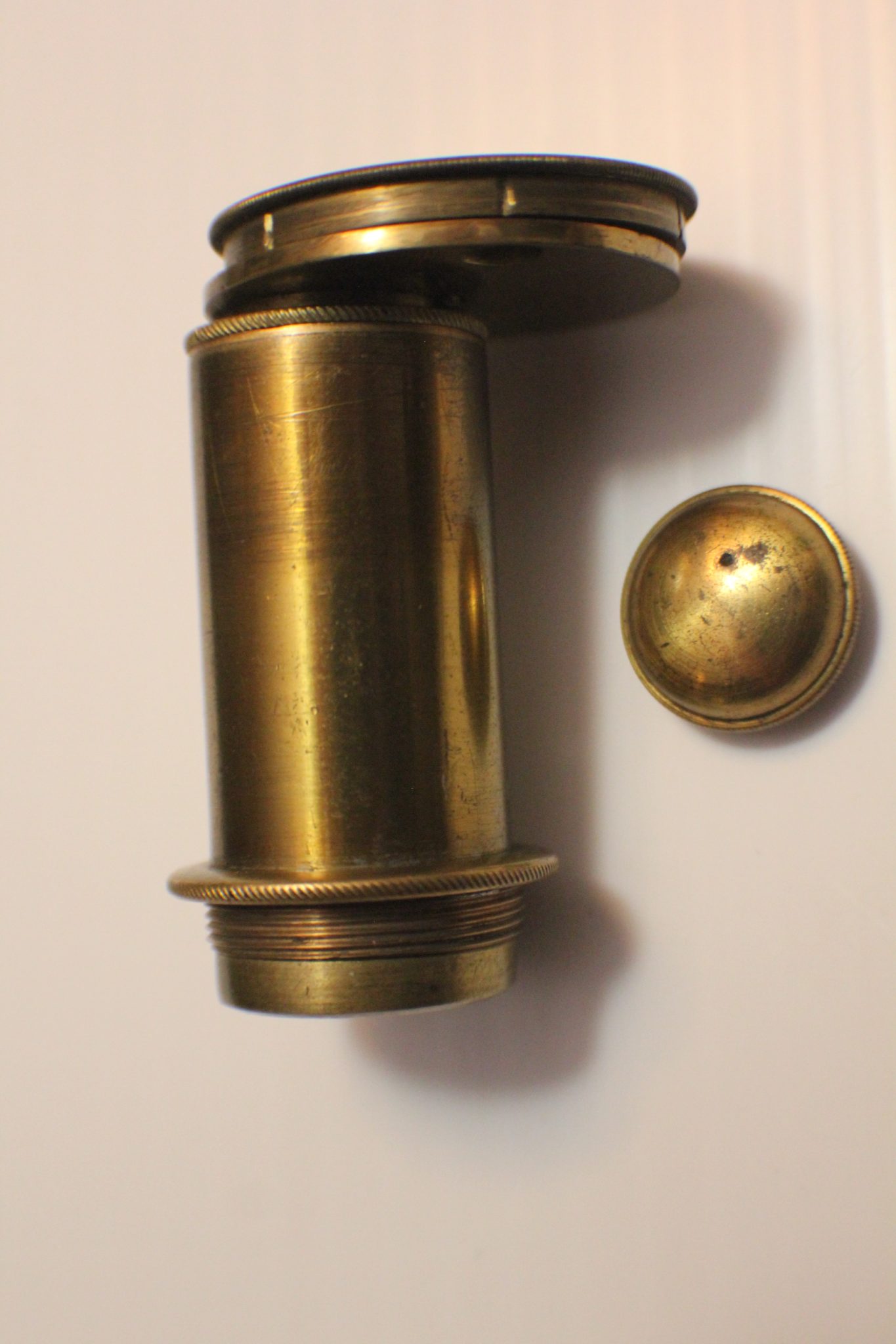 A collector/museum has a very large compendious microscope case once containing Cuff-type/Jones-type/Solar microscopes and these are perhaps the missing spares. Judging by the dimensions, the Jones-type (probably by Adams/Bleuler/Dollond) would have been close to 50 cm. tall, fully assembled. These parts all exhibit early diagonal roping/knurling of the brasswork and are abnormally large. The part solar microscope is now included for the same price + postage. (see last 4 photos).