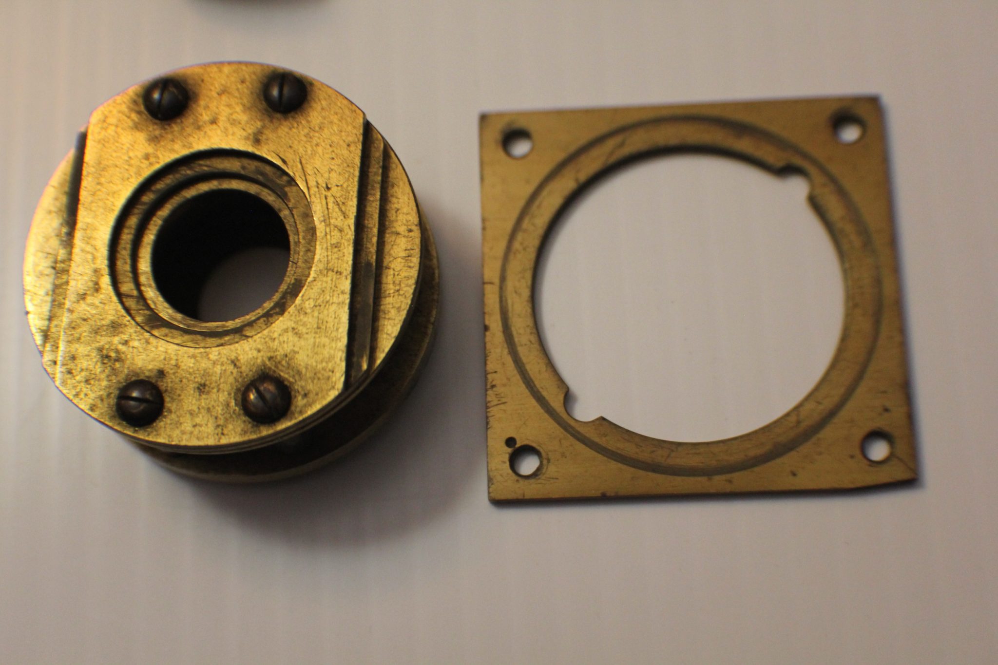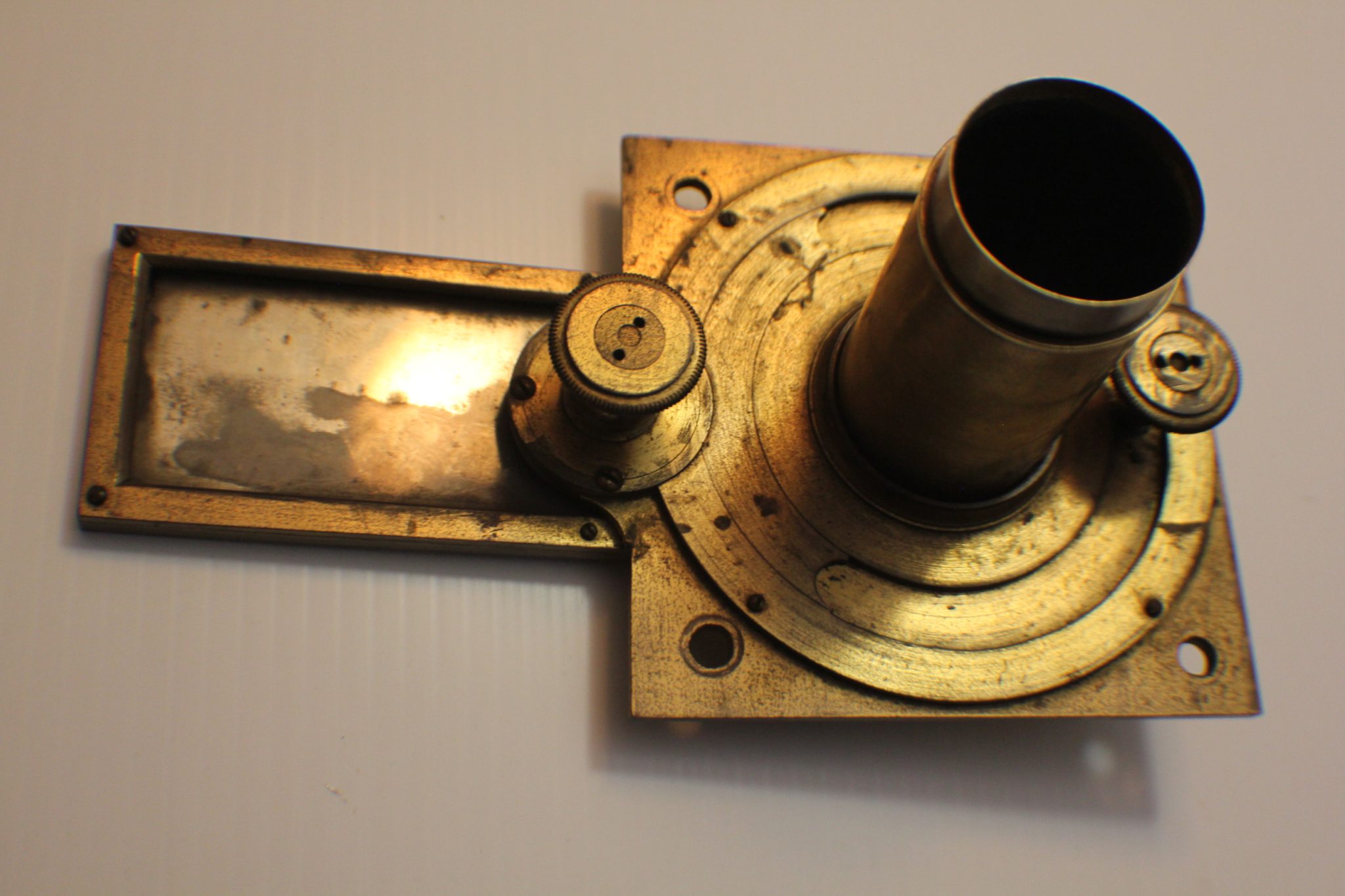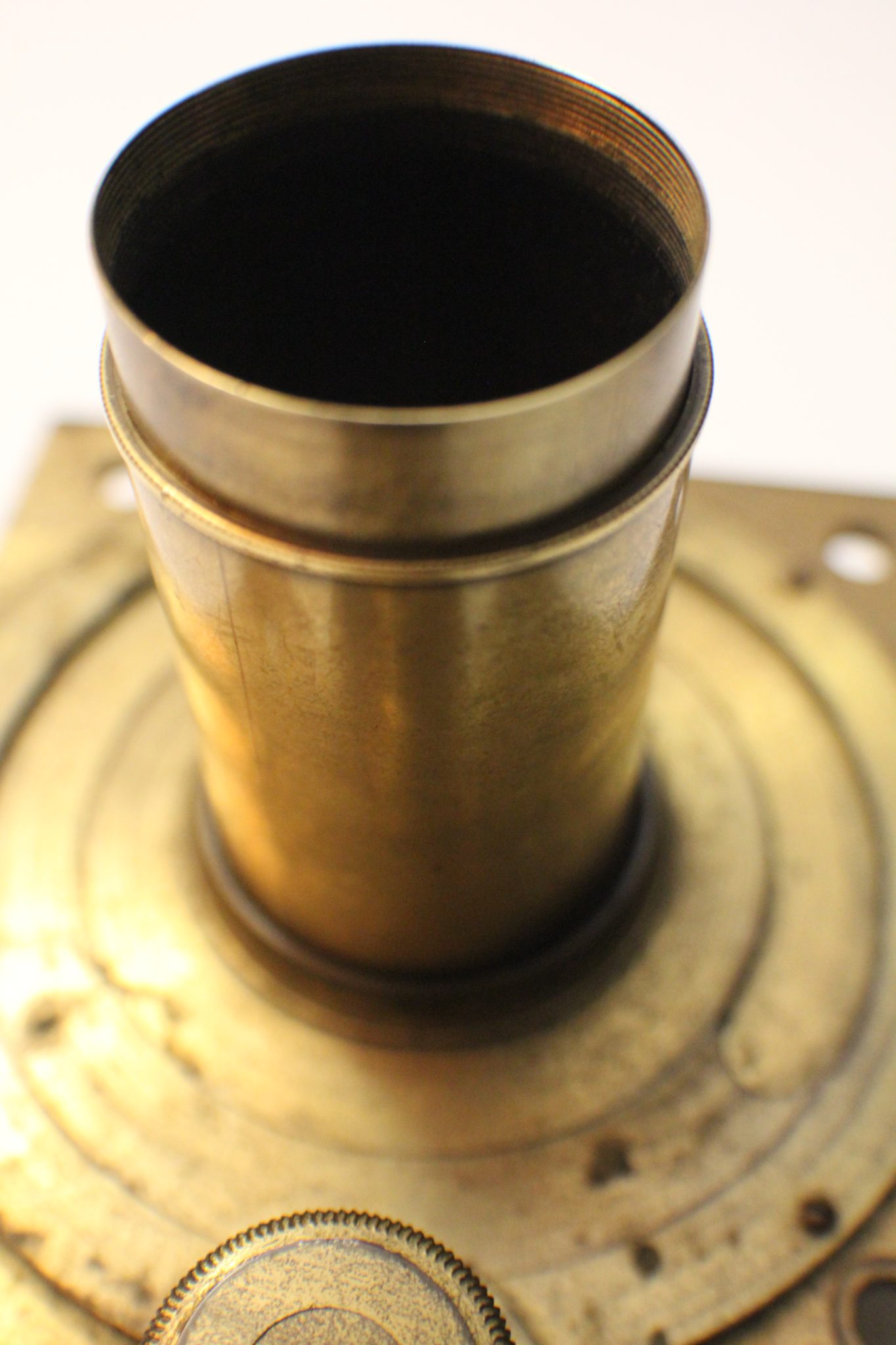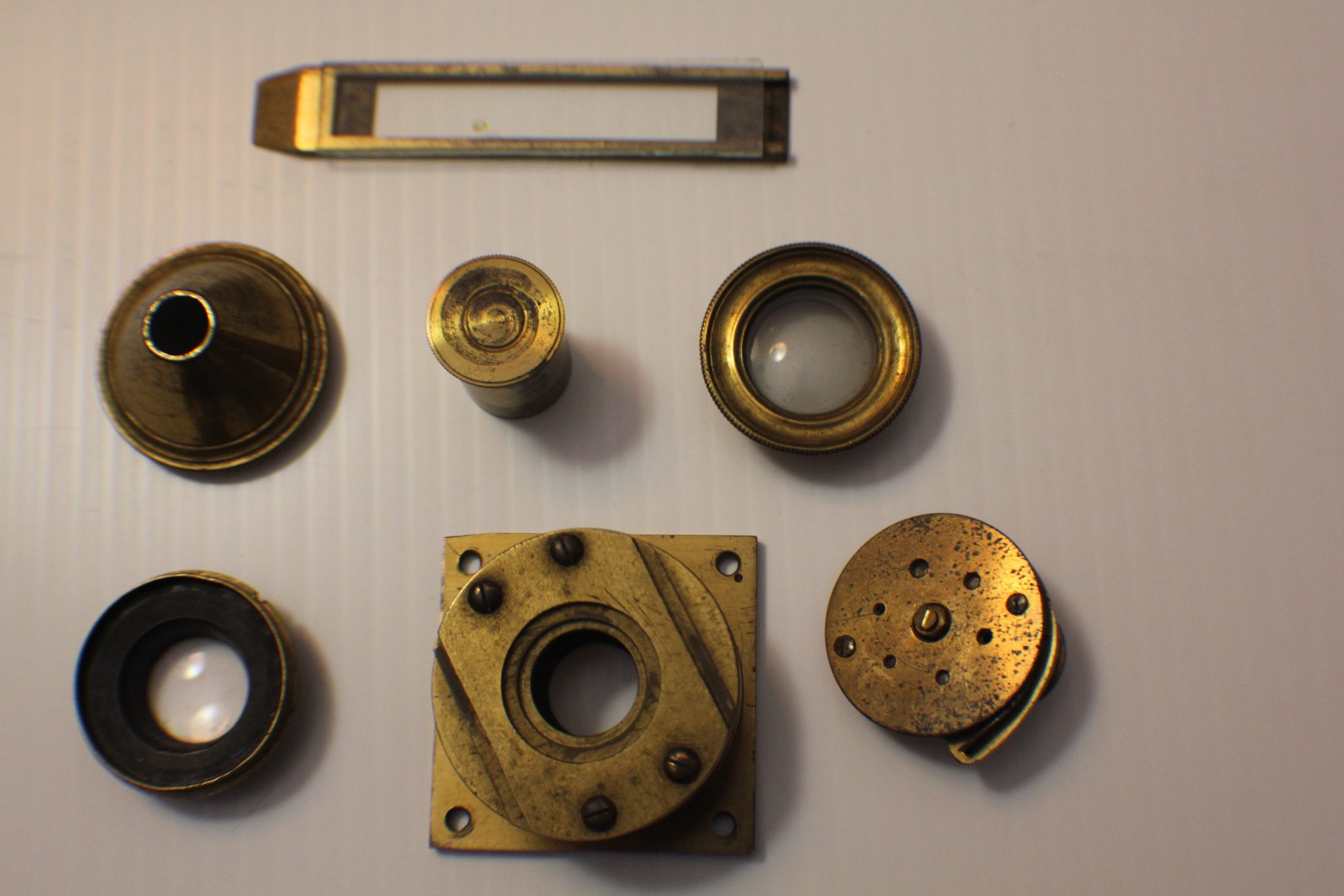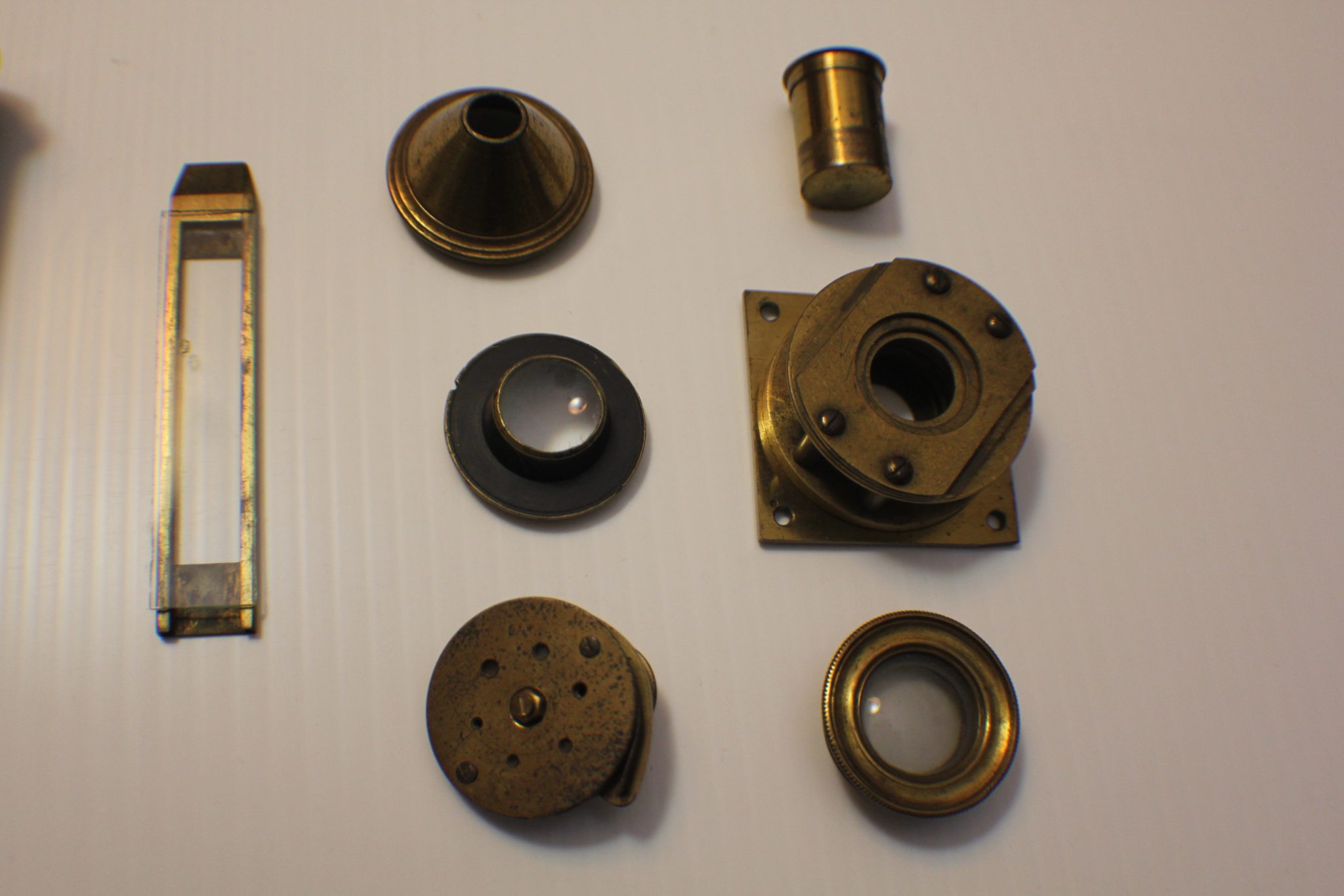 A collector/museum has a very large compendious microscope case once containing Cuff-type/Jones-type/Solar microscopes and these are perhaps the missing spares. Judging by the dimensions, the Jones-type (probably by Adams/Bleuler/Dollond) would have been close to 50 cm. tall, fully assembled. These parts all exhibit early diagonal roping/knurling of the brasswork and are abnormally large. The part solar microscope is now included for the same price + postage. (see last 4 photos).