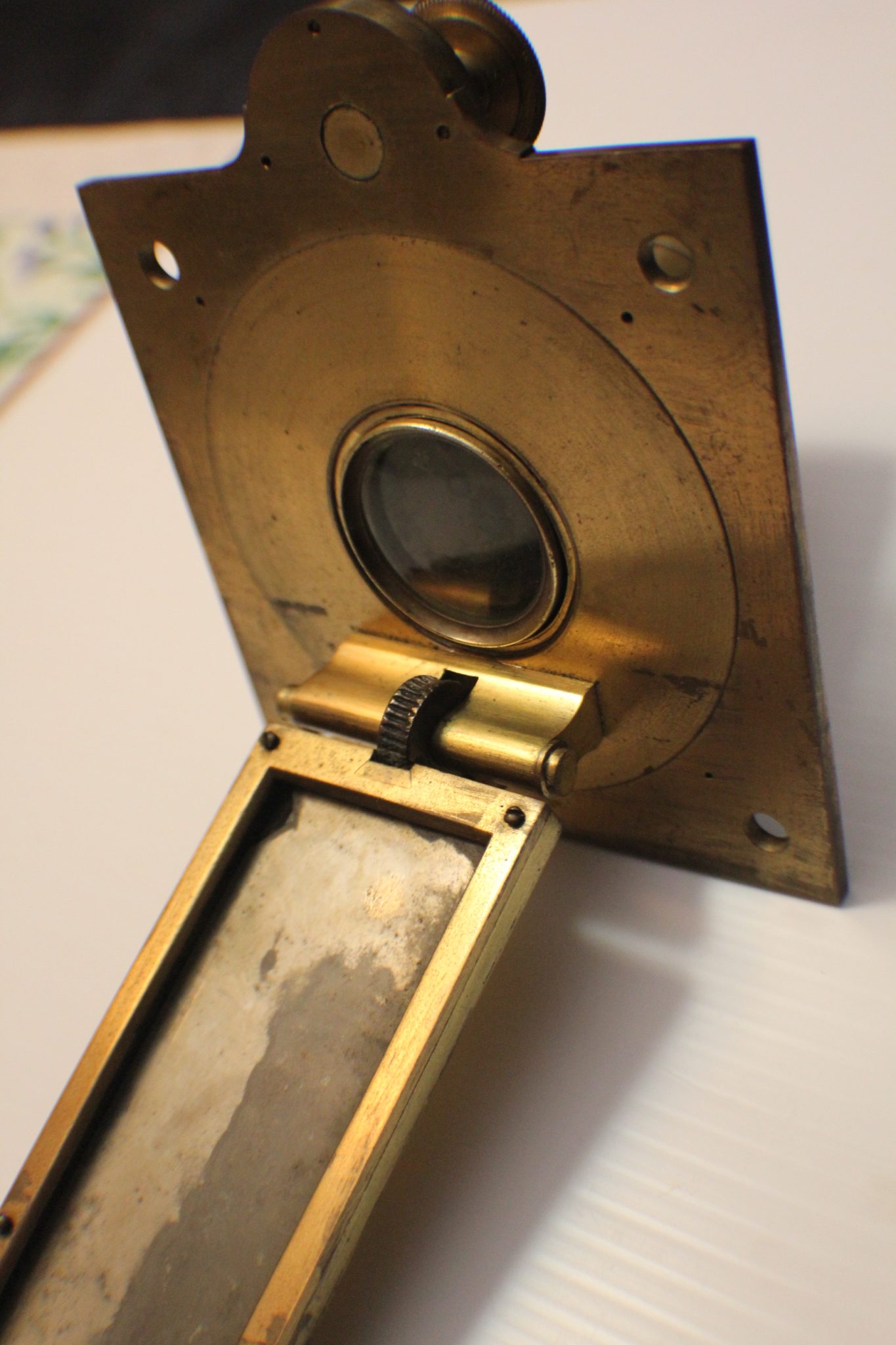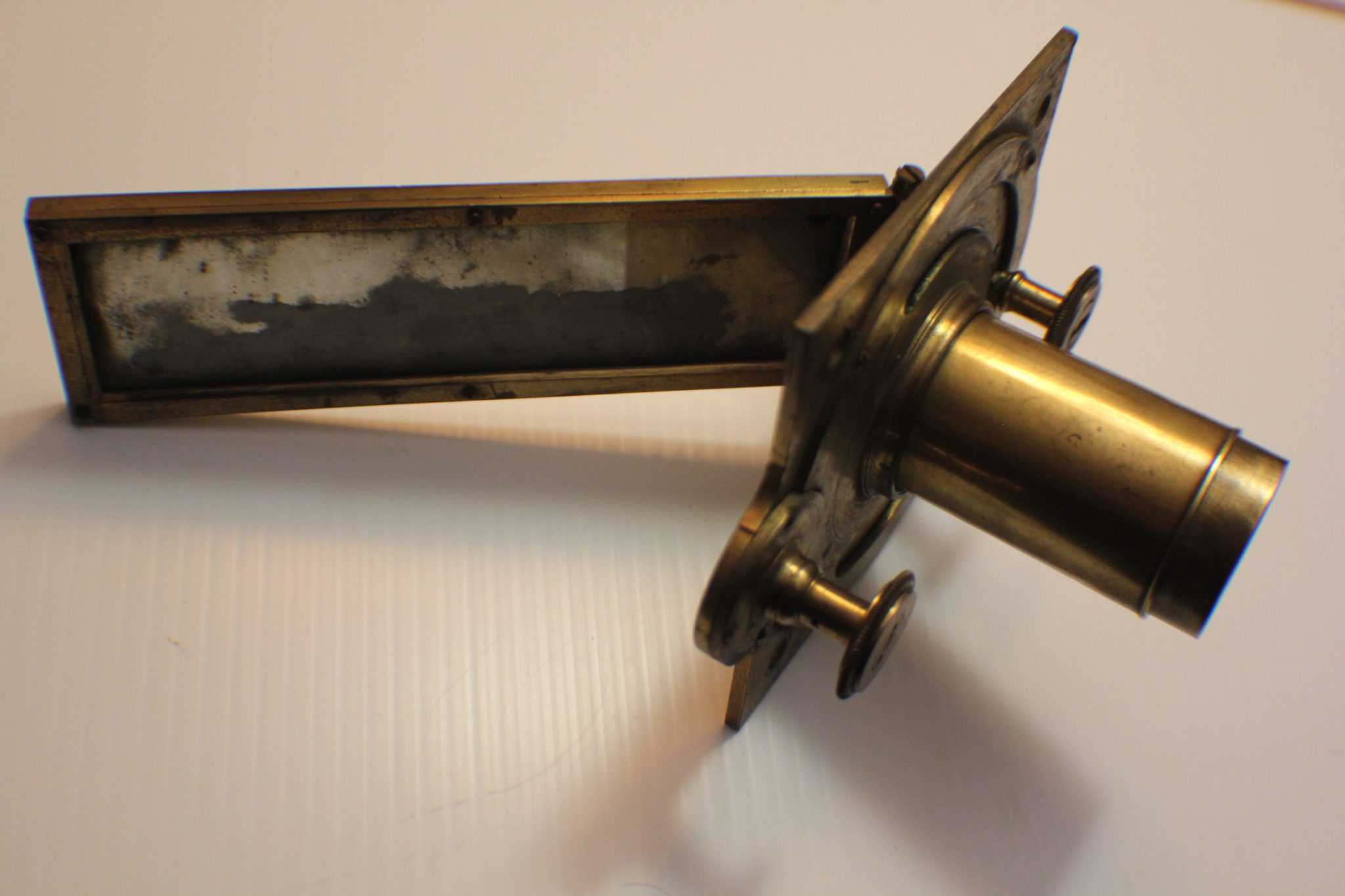 Dimensionally these microscopes must have been massive. I even have a part solar microscope that may have come from the same compendium. The upper rack and pinion section (for slider insert) is missing but may have been used as a hand held option. Measures 20 x 12 x 12 cm. (see photos). Same early roping of the brass. Mirror 50%. The case to hold all of this hardware must have been at minimum 40 x 30 x 20 cm. deep.