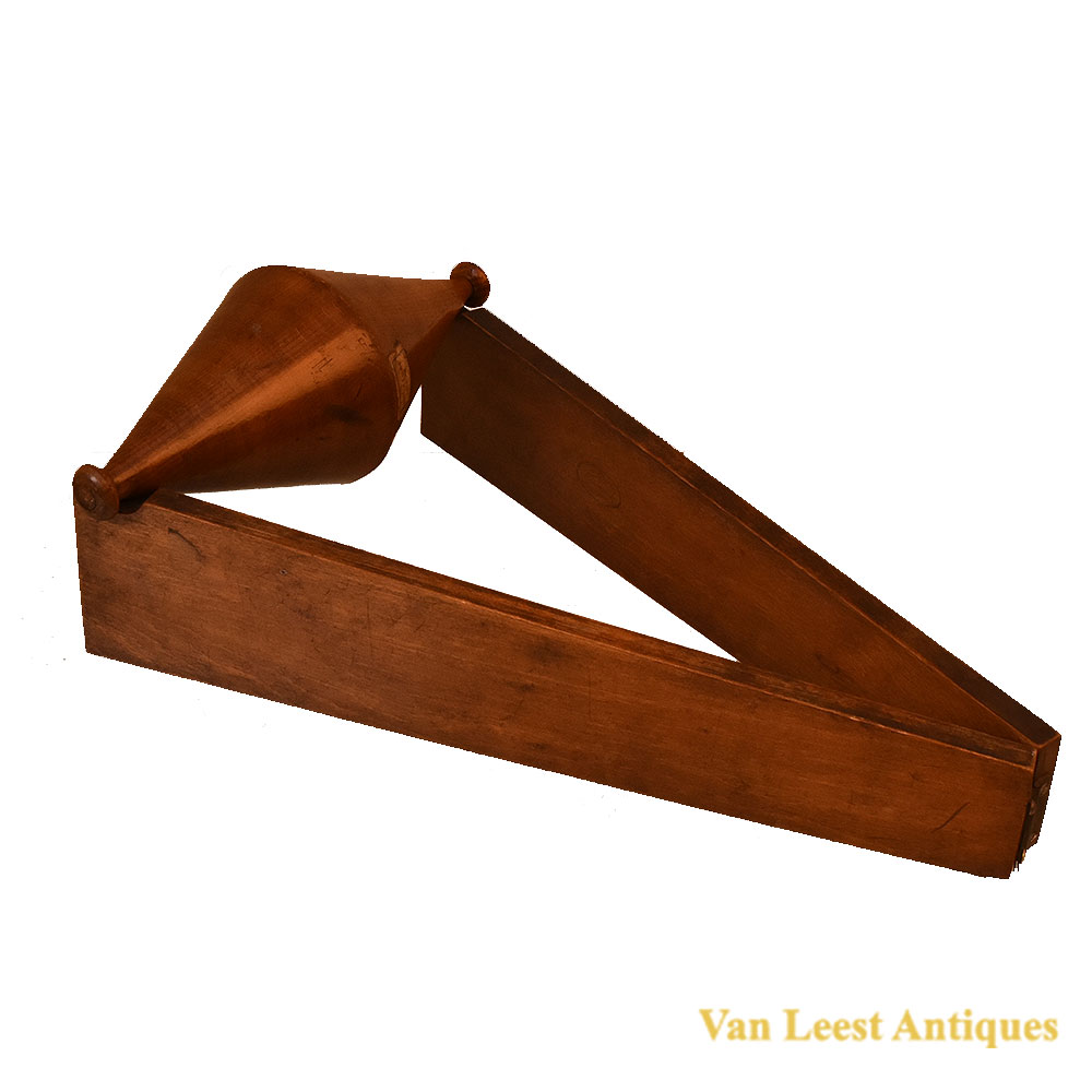 The mechanical paradox consists in a double cone which is able to climb up along an inclined plane. The double cone rises when the slope of the inclined plane is smaller than the product given by the tangent of half the cone’s angle and the tangent of half the angle of slide’s opening. So the phenomenon has nothing paradoxical, but it is in perfect accord with the laws of mechanics. Length Cone 32 cm and begin 20th century.