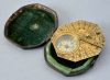 The undersides of the base-plate and the compass are engraved with a list of 21 cities or countries with their latitudes. The spring of the latitude arc is engraved with a leaf decoration. The brass hour-plate, octogonal, is hinged on the baseplate. This hour-plate carries an hour-circle graduated clockwise IIII-XII-VIII and subdivided to 15 minutes. It is hollowed out at the south end to allow the reading of the compass and engraved with a foliage decoration and the signature « P. Le Maire AParis A la pierre d’aiman ». It carries a hinged gnomon engraved with foliage decoration. The underside of this plate is blank