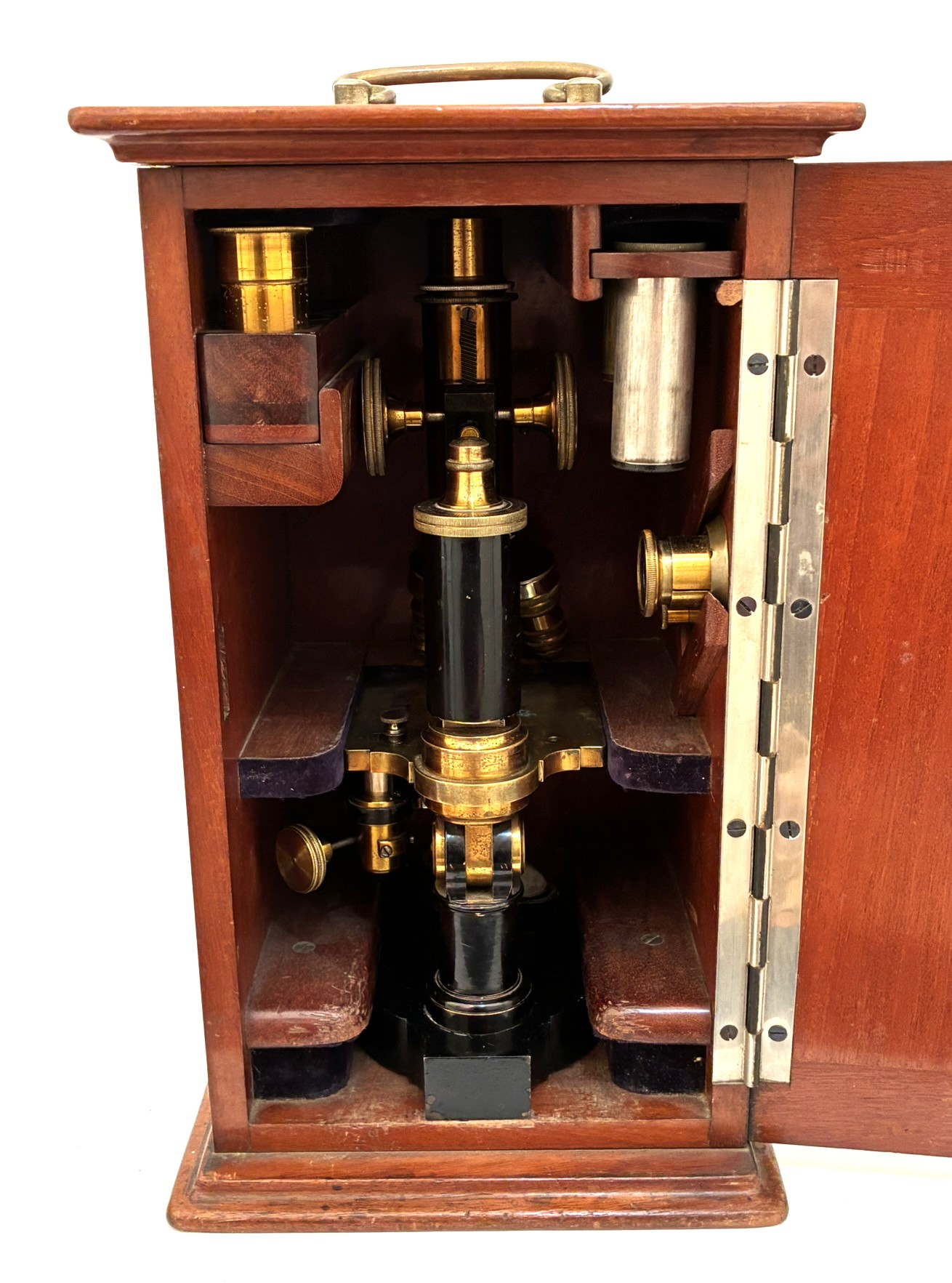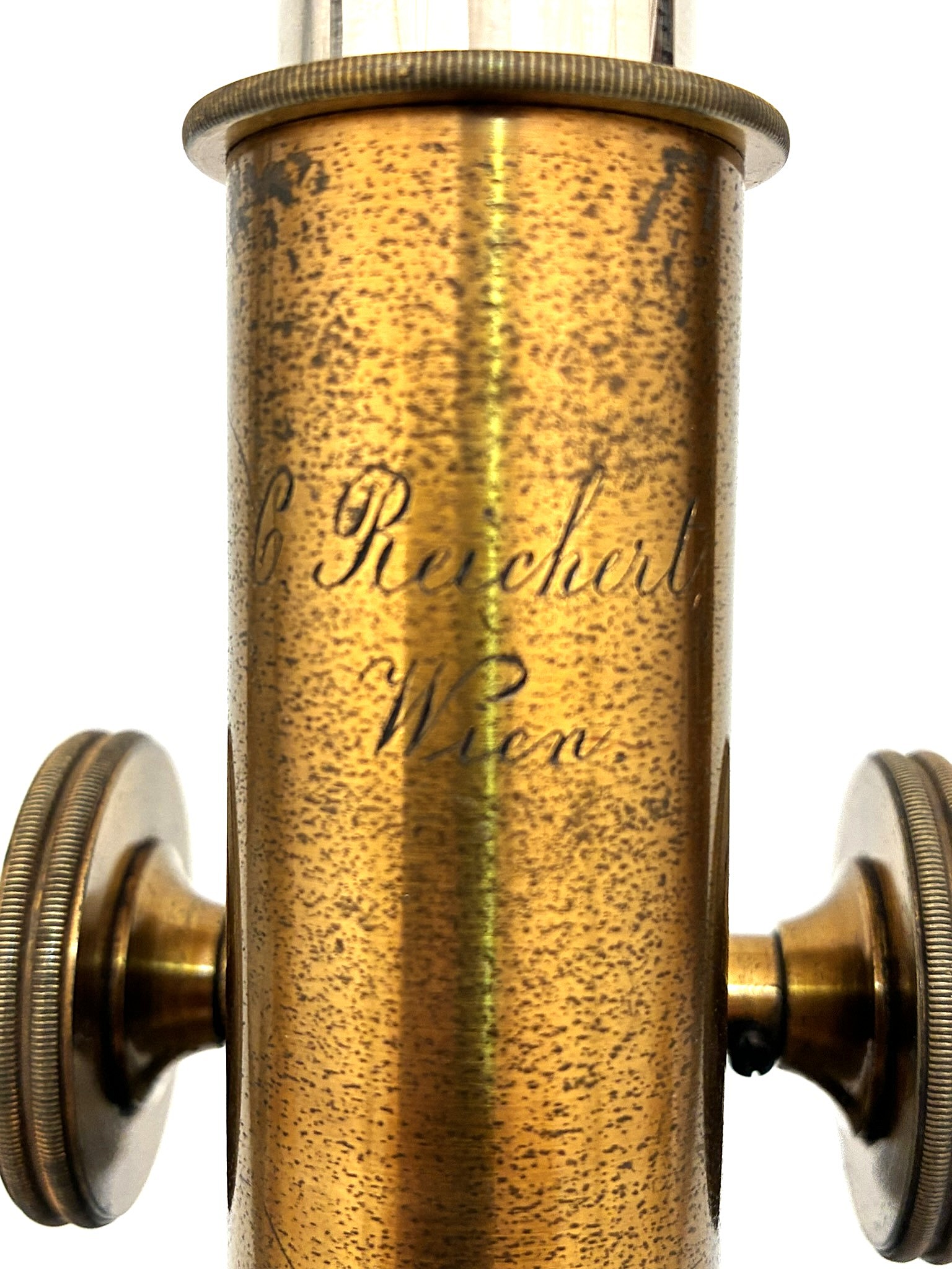 Antique Austrian Reichert microscope, manufactured in Vienna, Austria around 1880, in good working order and condition. The microscope features a horseshoe-shaped base in black enameled metal and brass; the upper section combines brass pieces, some gilded and others black, with chrome-plated metal. The brass shows some signs of wear from age and use, which lend this instrument a unique patina of authenticity. The design includes a revolving nosepiece with three lenses, all original to the brand, and two eyepieces. The rack and pinion mechanism works well and moves smoothly, allowing for precise focusing of specimens. The manufacturer’s name is engraved in cursive script on the tube, but the serial number is missing, as although Reichert began manufacturing microscopes in 1876, he did not begin systematically numbering them until 1883. The microscope is housed in a beautiful, perfectly preserved mahogany case.