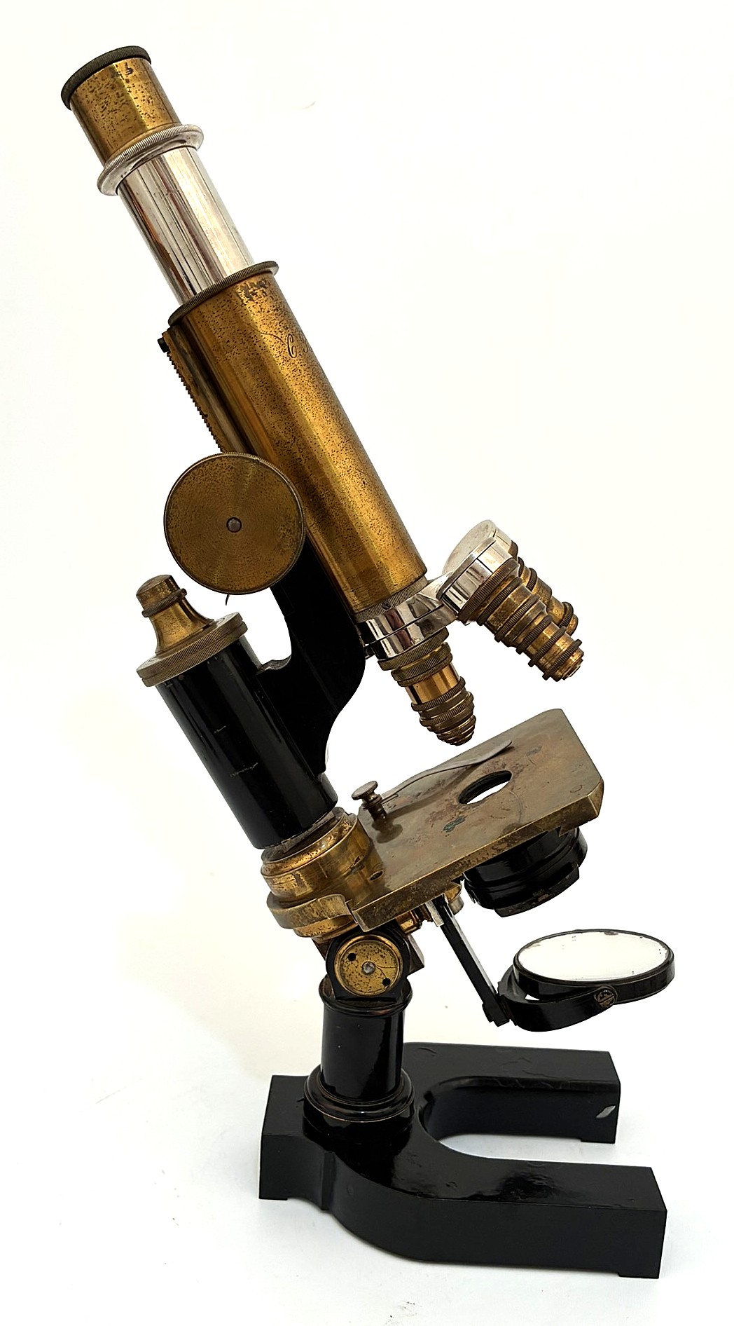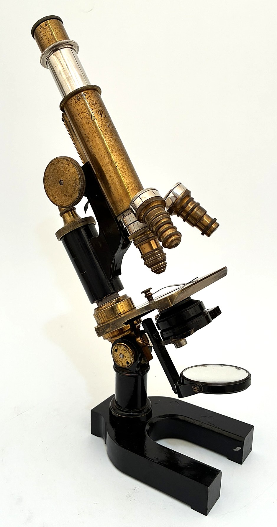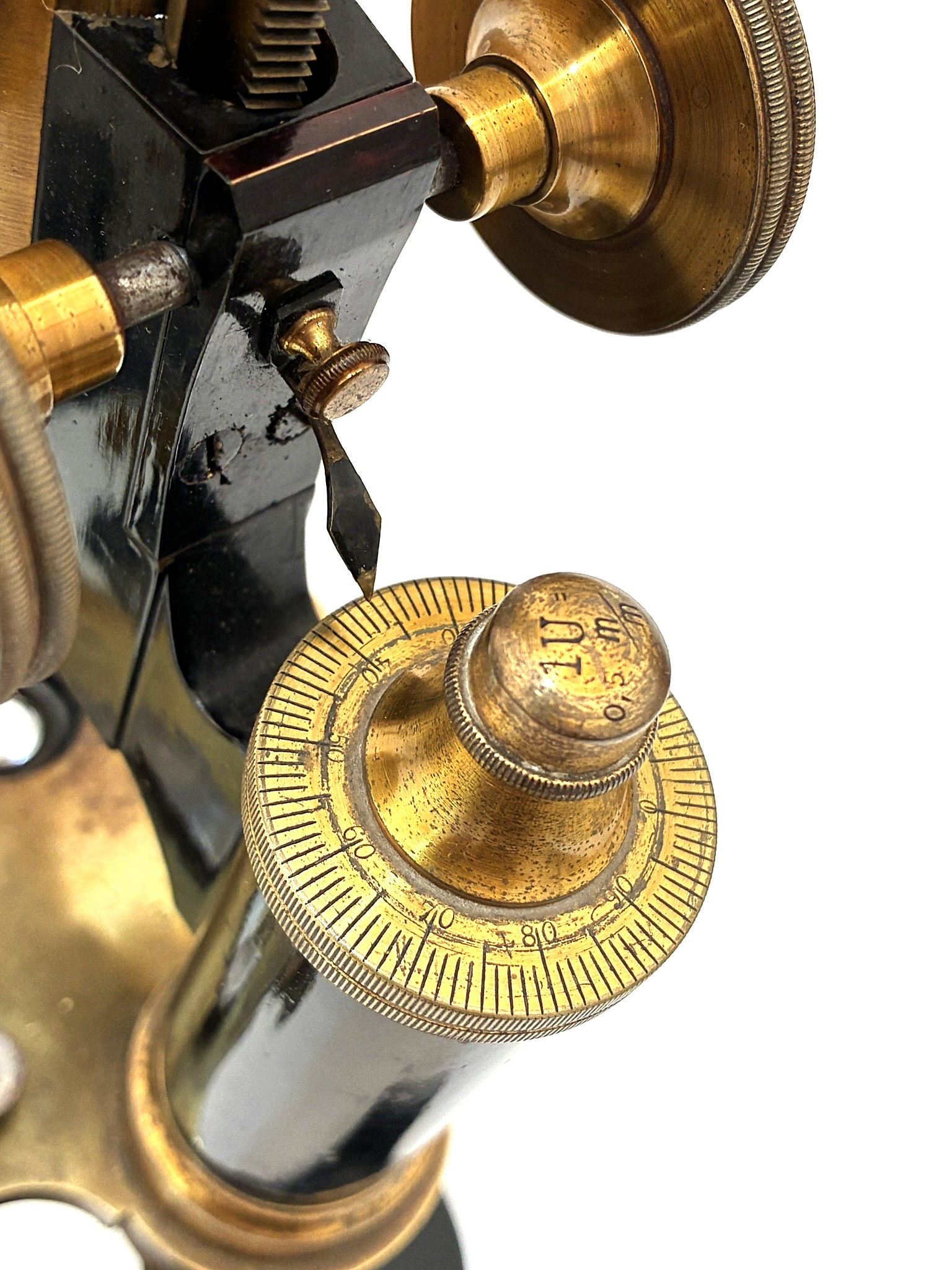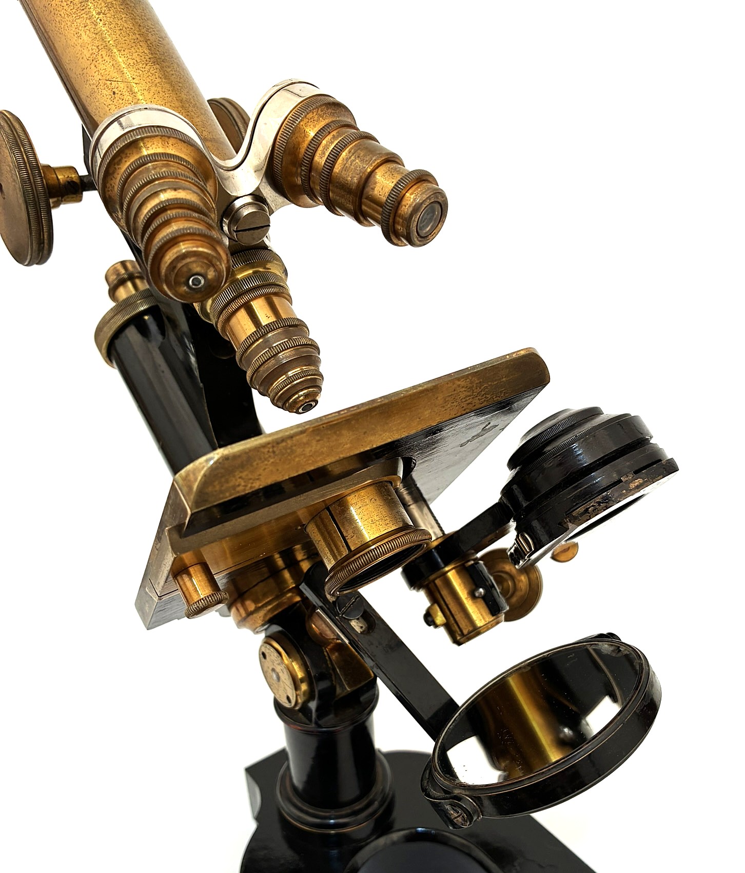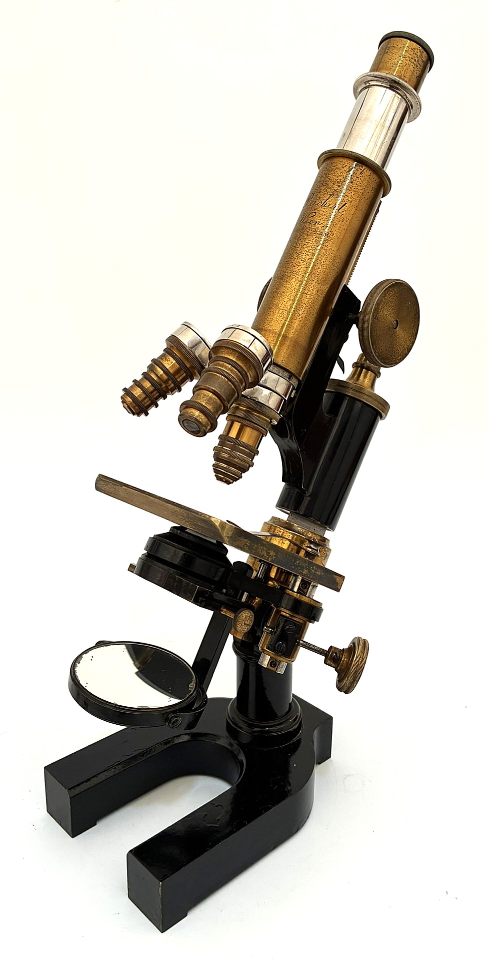 Very early brass microscope manufactured at the end of the 19th century based on the stand II, in an excellent state of preservation. It does not have serial number, so I asume it was made before he began sistematically numbering them in 1883.