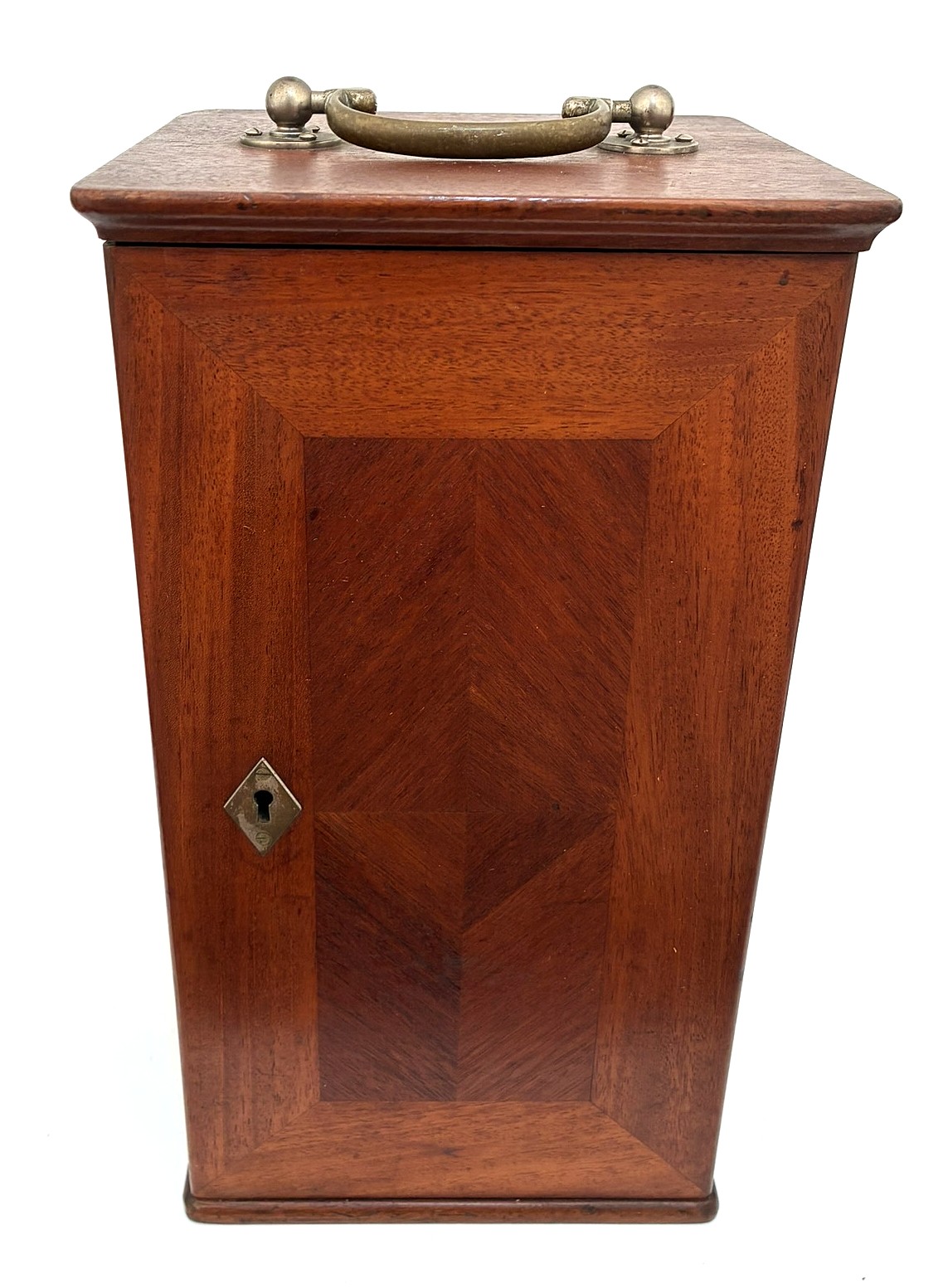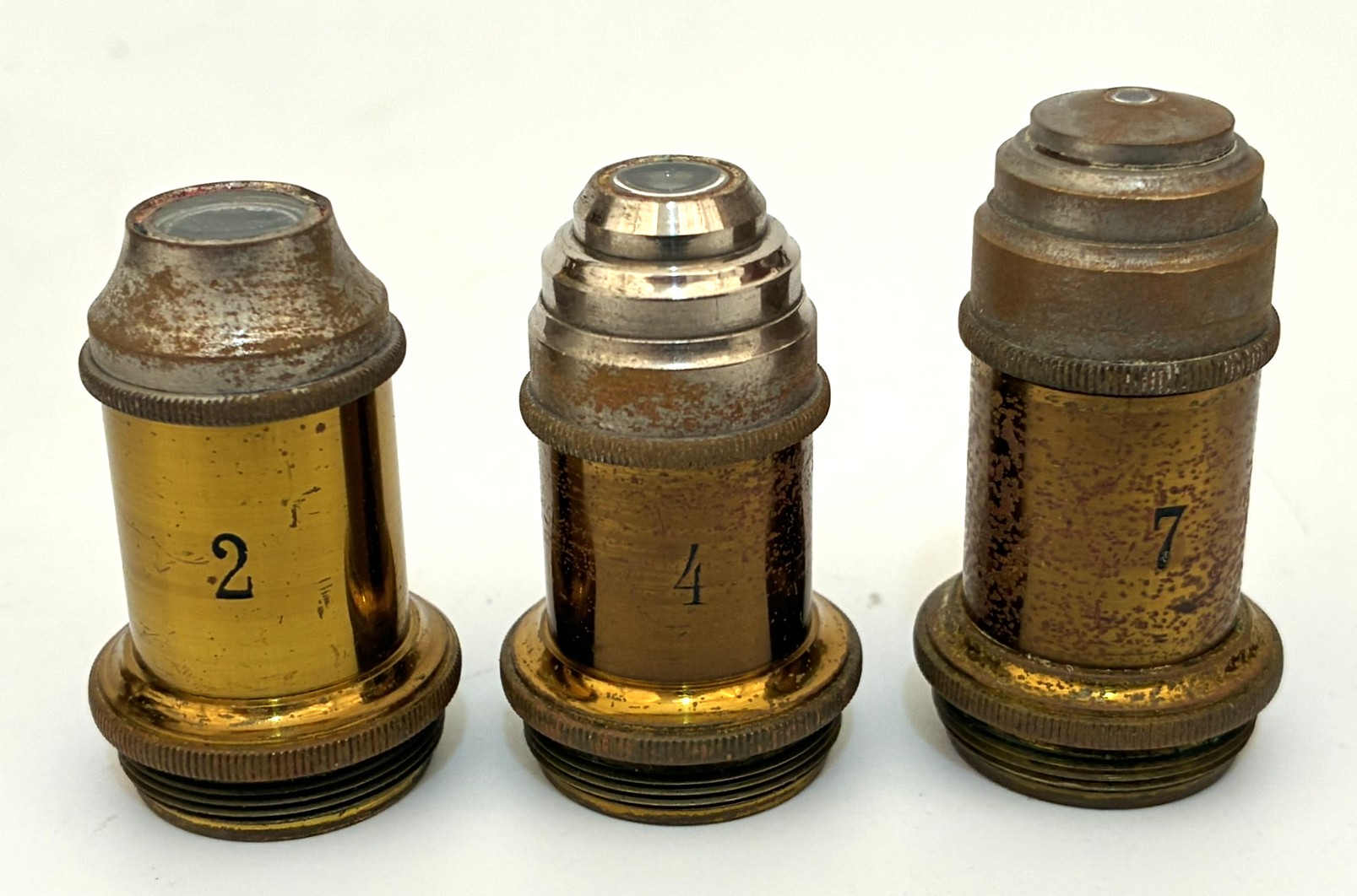 The microscope comes in its original mahogany wooden case and includes a complete set of accessories: three eyepieces, three objectives, and a light-limiting stand with two limiters. It features a three-lens revolving nosepiece, a rack and pinion mechanism in good working order, and a well-preserved fine-adjustment system.