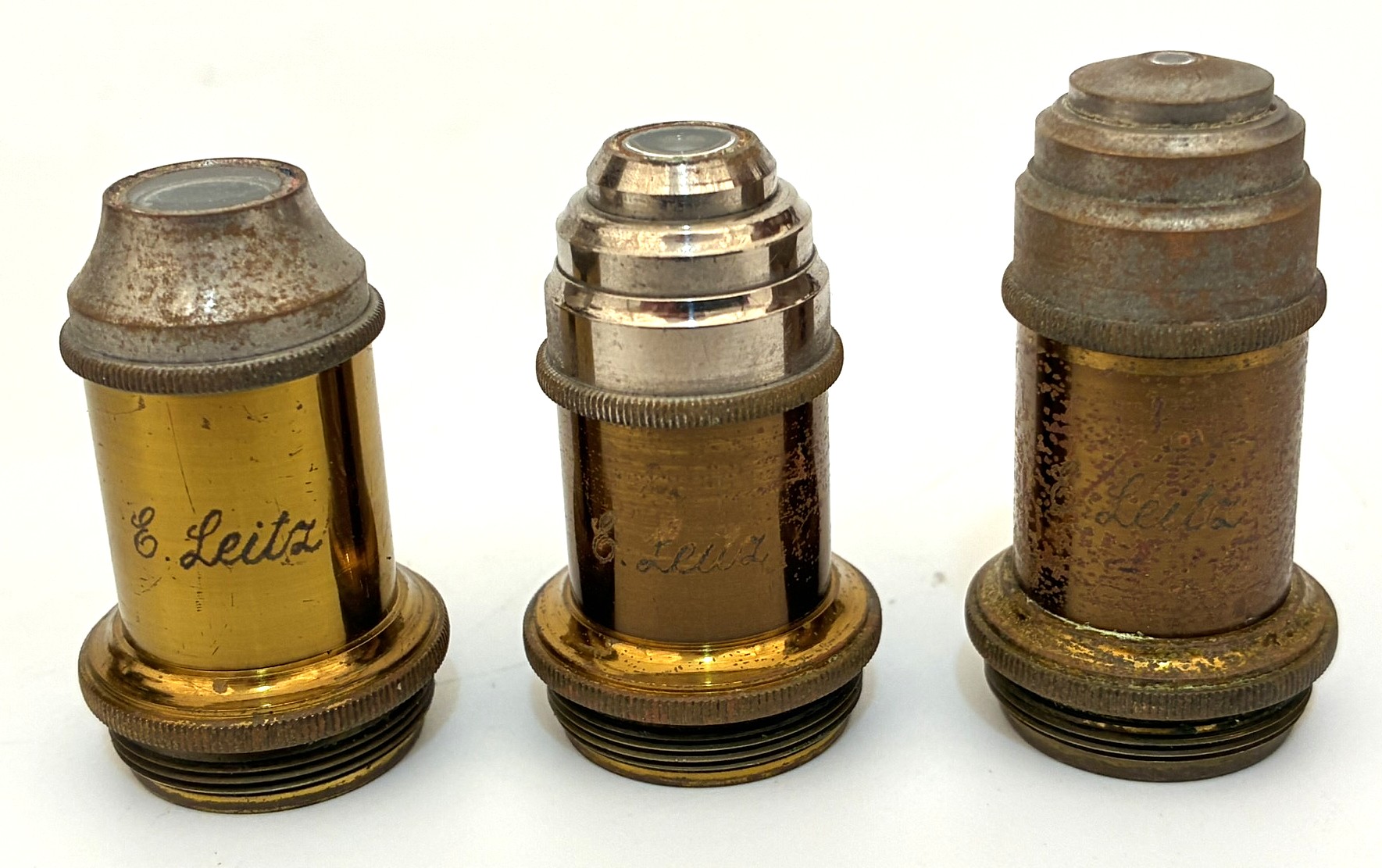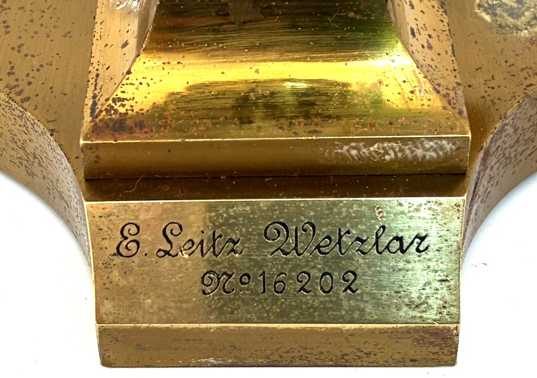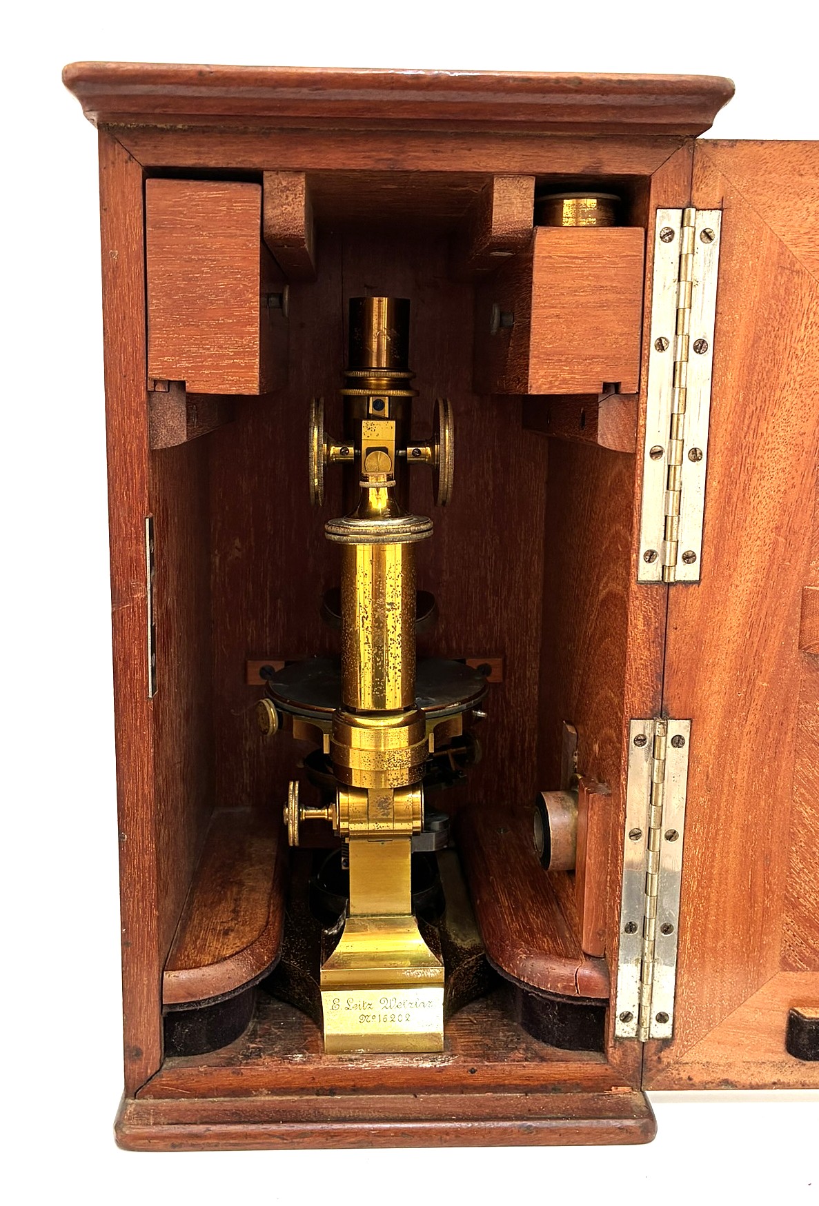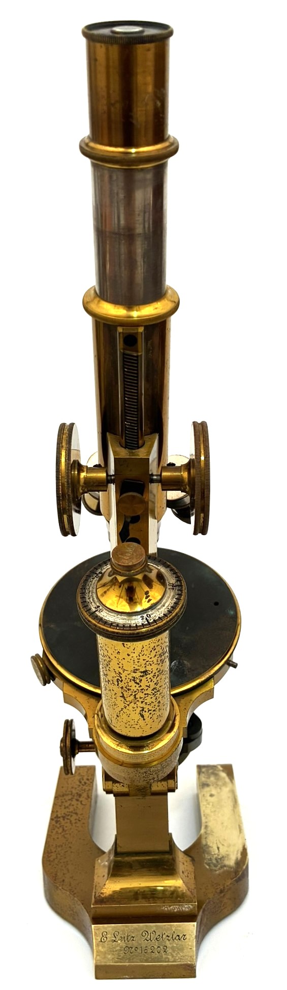 Fantastic antique brass microscope by E. Leitz Wetlzar, manufactured in Germany in 1889, well-preserved and in good working order. Despite being over 130 years old, the microscope functions correctly. It is made entirely of brass; the metal retains its original lacquer with some specks and wear on one side of the base. The serial number 16202 is engraved on the back of the instrument and is repeated on the case.