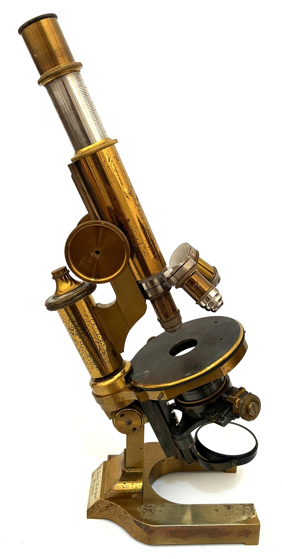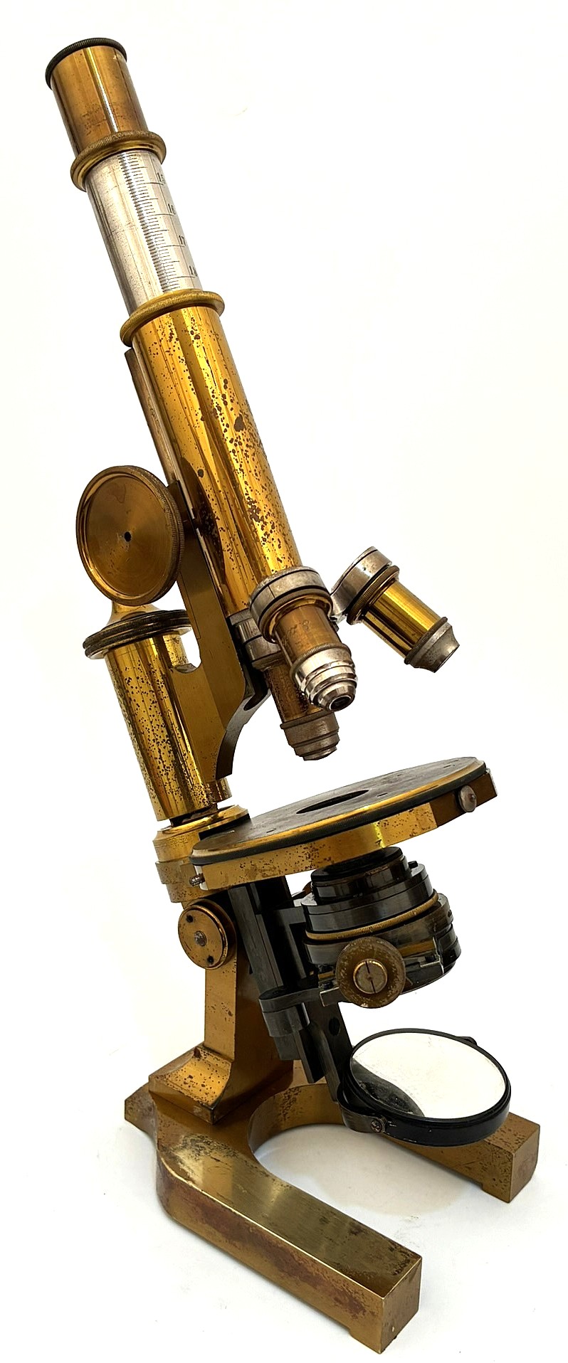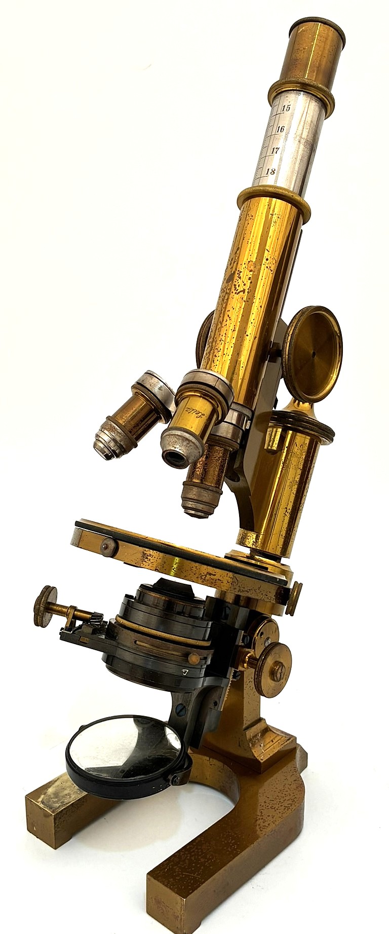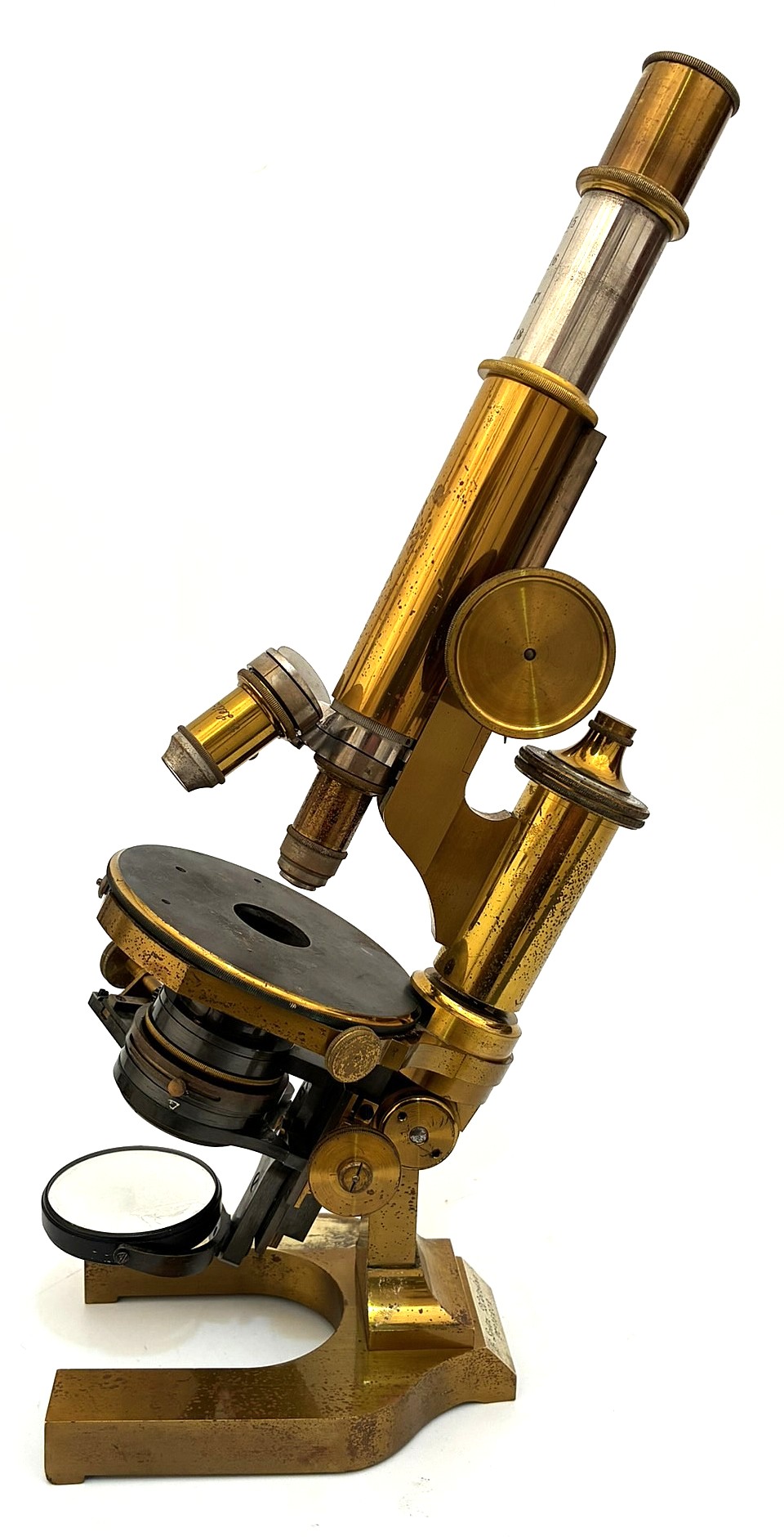 Very early brass microscope manufactured at the end of the 19th century based on the stand I, in an good state of preservation. It's serial number is 16202, so it was made in 1889.
