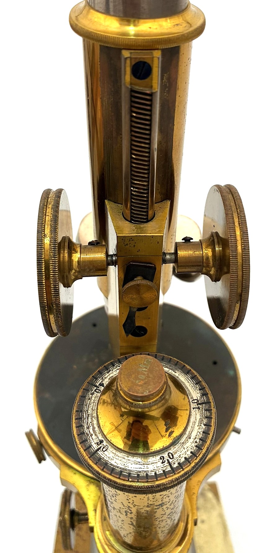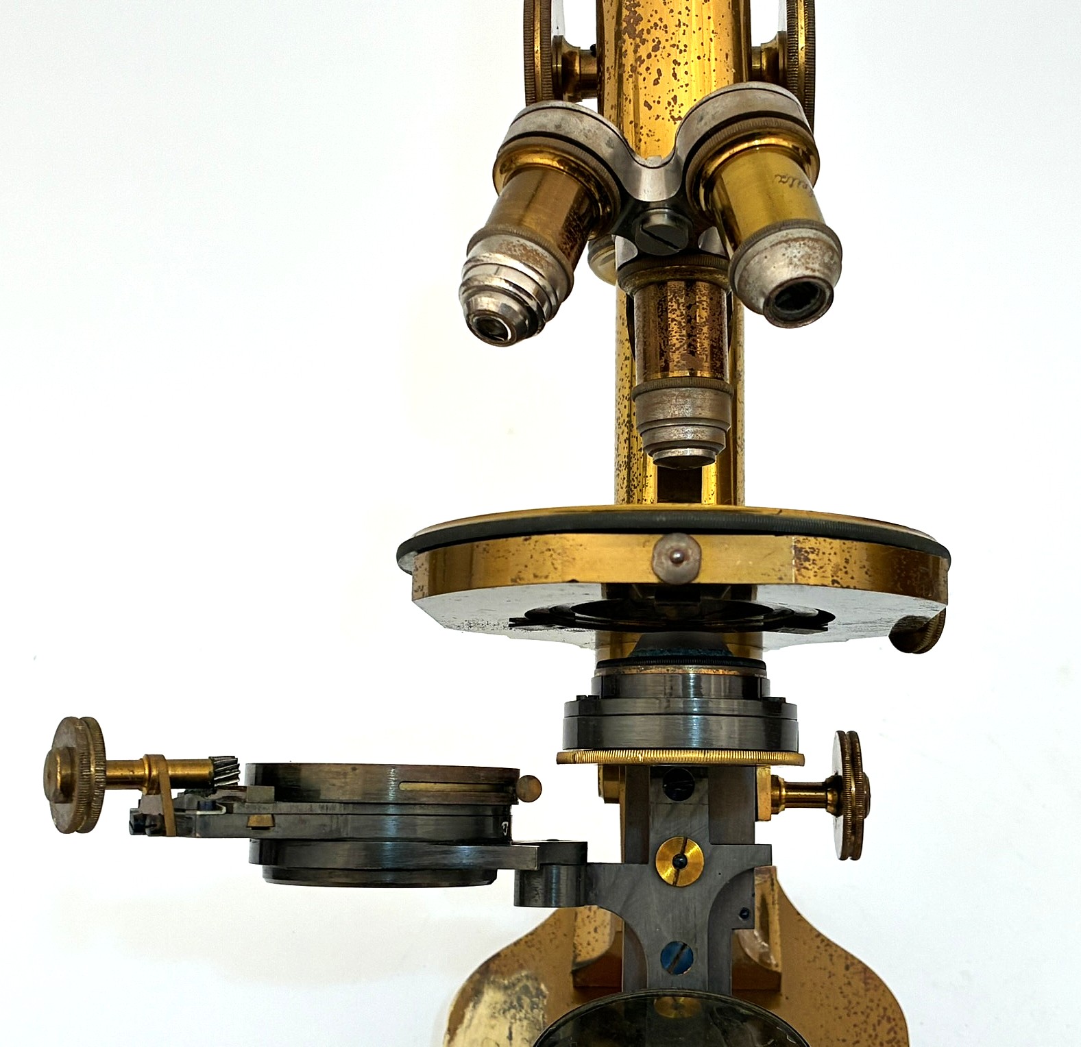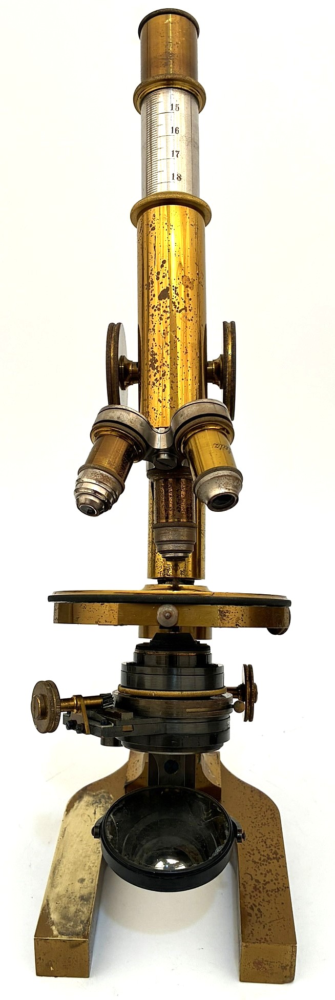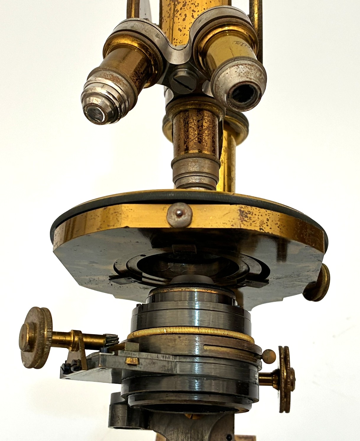 Very early brass microscope manufactured at the end of the 19th century based on the stand I, in an good state of preservation. It's serial number is 16202, so it was made in 1889.