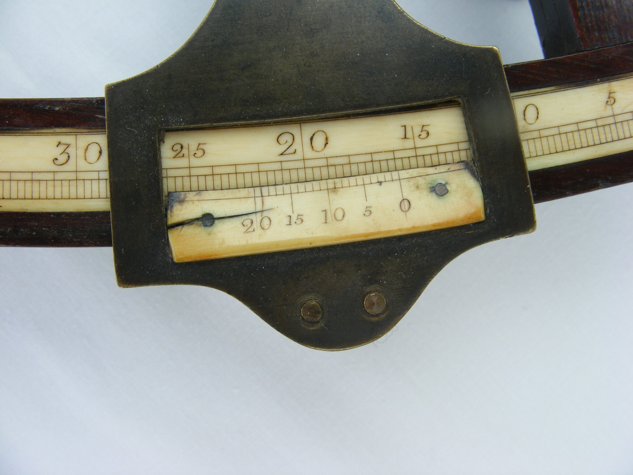 GOOD LATE 18TH CENTURY OCTANT/QUADRANT, INDEX ARM 15.1/2" INCHES, RADIUS 13.1/2" INCHES. SCALE MINUS 2 DEGREES TO 99 DEGREES, 20' MINUTE DIVISIONS, VERNIER READING TO 1 MINUTE OF ARC.
